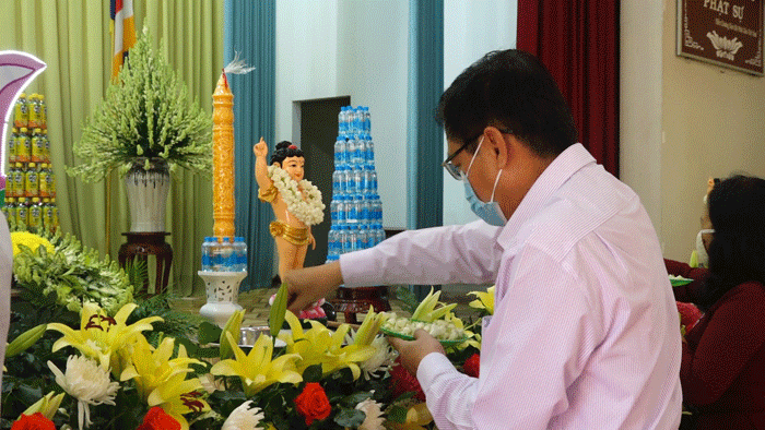 Quý quan khách đại diện lãnh đạo các cấp chính quyền cũng dâng hương cúng dường Đức Phật và thực hiện nghi thức Tắm Phật.