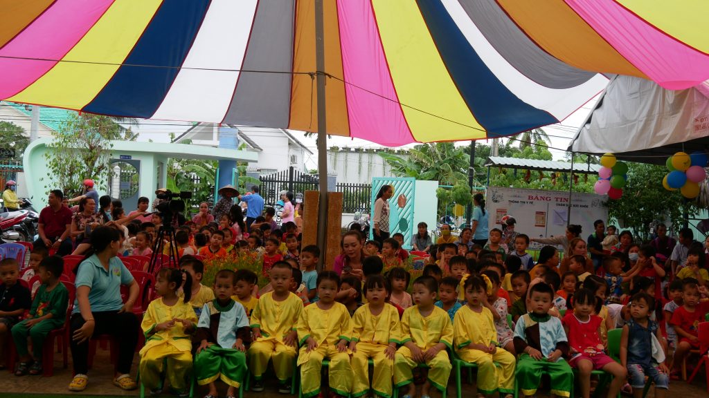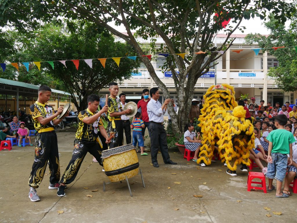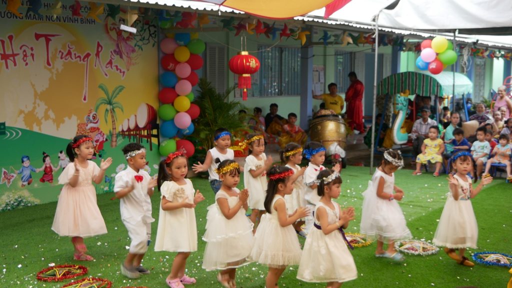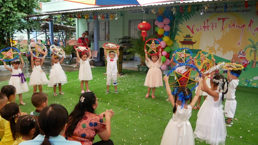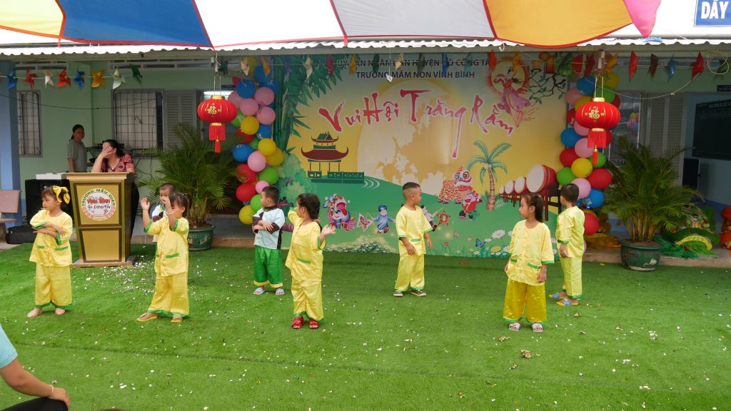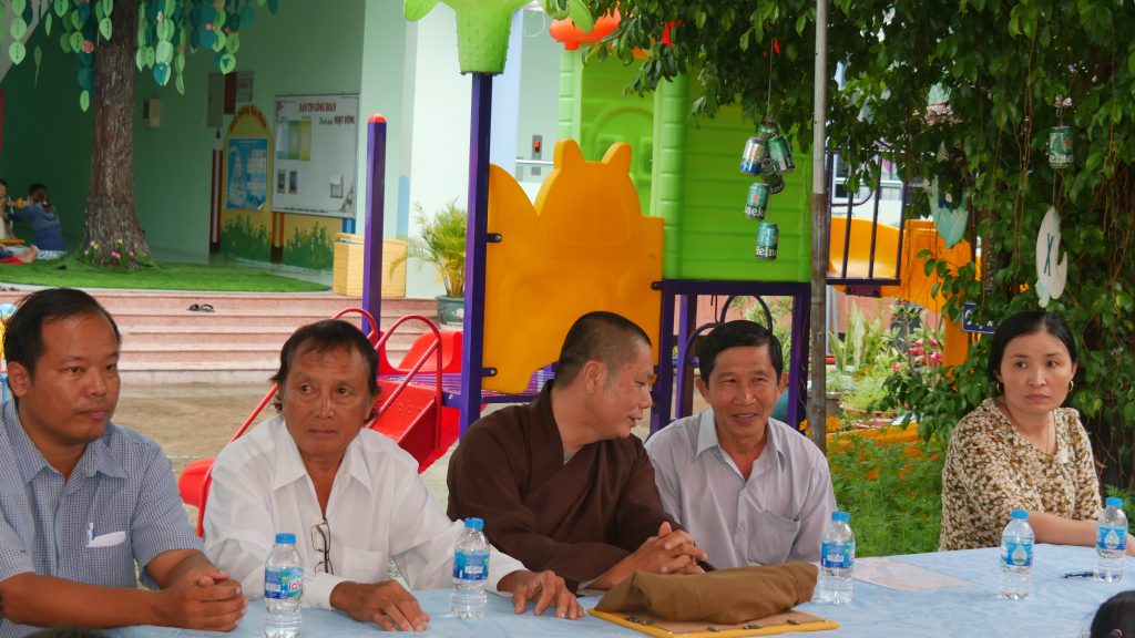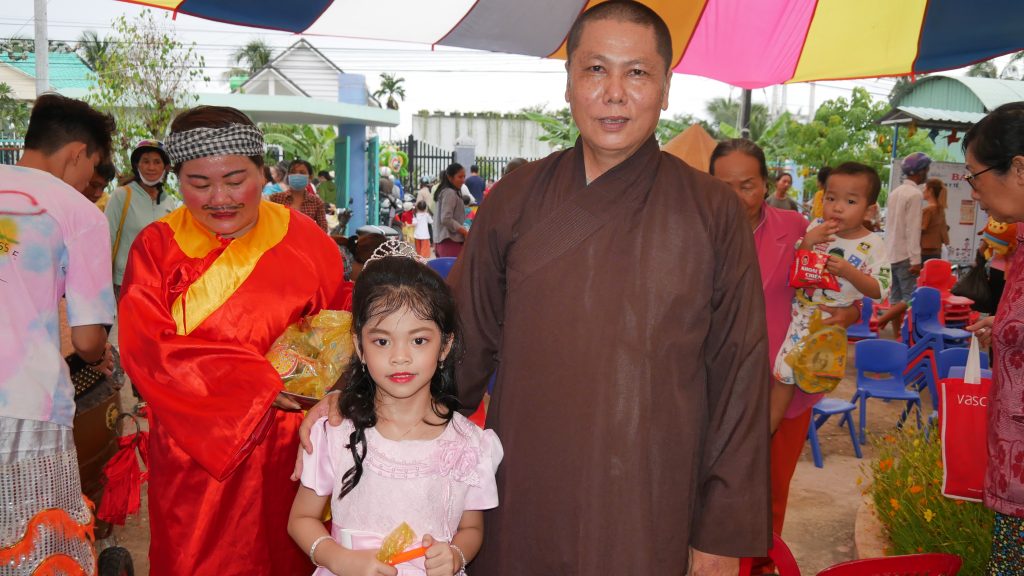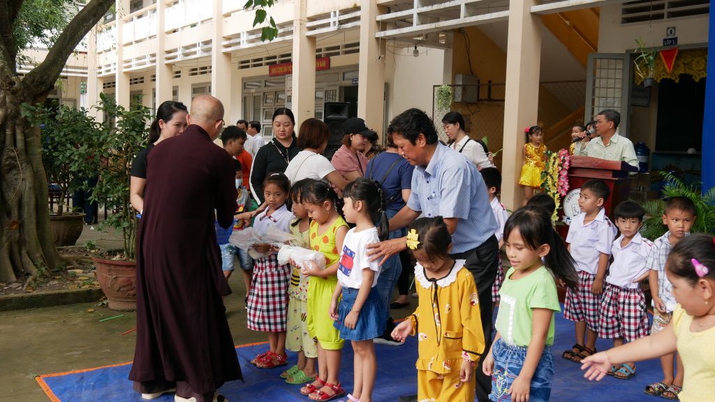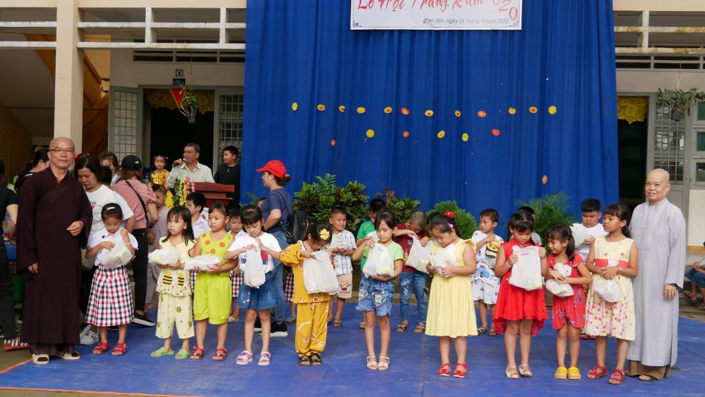 Chiều cùng ngày, Đại đức Thích Trung Phước cùng Tăng chúng chùa Linh Sơn đến tham dự Tết Trung thu với chủ đề “ Vui Hội Trăng Rằm” do Trường Mầm Non TT.Vĩnh Bình tổ chức. Tại đây, Đại đức cũng đã tặng quà Trung thu đến các bé.