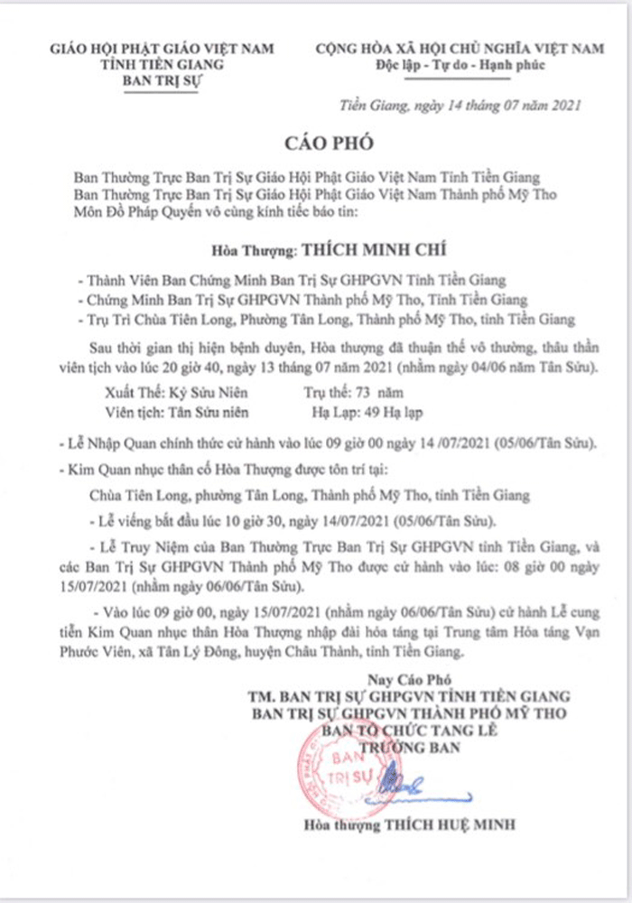 - Lễ Truy niệm của Ban Thường trực Ban Trị sự GHPGVN tỉnh Tiền Giang và các Ban Trị sự GHPGVN thành phố Mỹ Tho được cử hành vào lúc: 08 giờ 00 ngày 15/7/2021 (nhằm ngày 6/6/Tân Sửu).