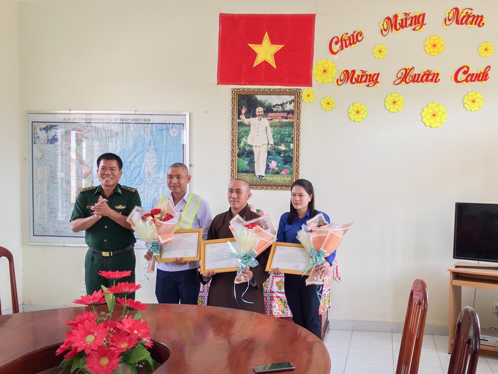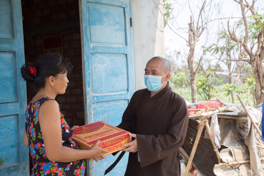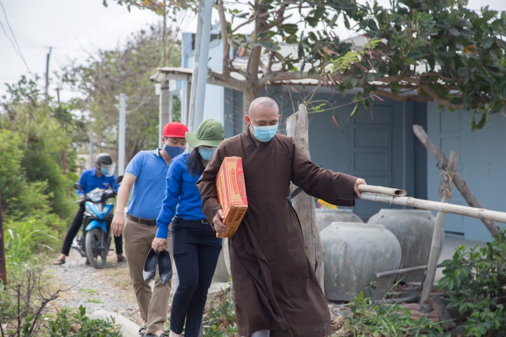 ĐĐ.Thích Chiếu Pháp cùng các bạn trong Đoàn Thanh niên cũng đã kết hợp phát hơn 3000 khẩu trang, 2000 bánh xà phòng, 1000 chai nước rửa tay các loại và những tờ bướm tuyên truyền cách phòng chống dịch cúm Covid-19 đến bà con.