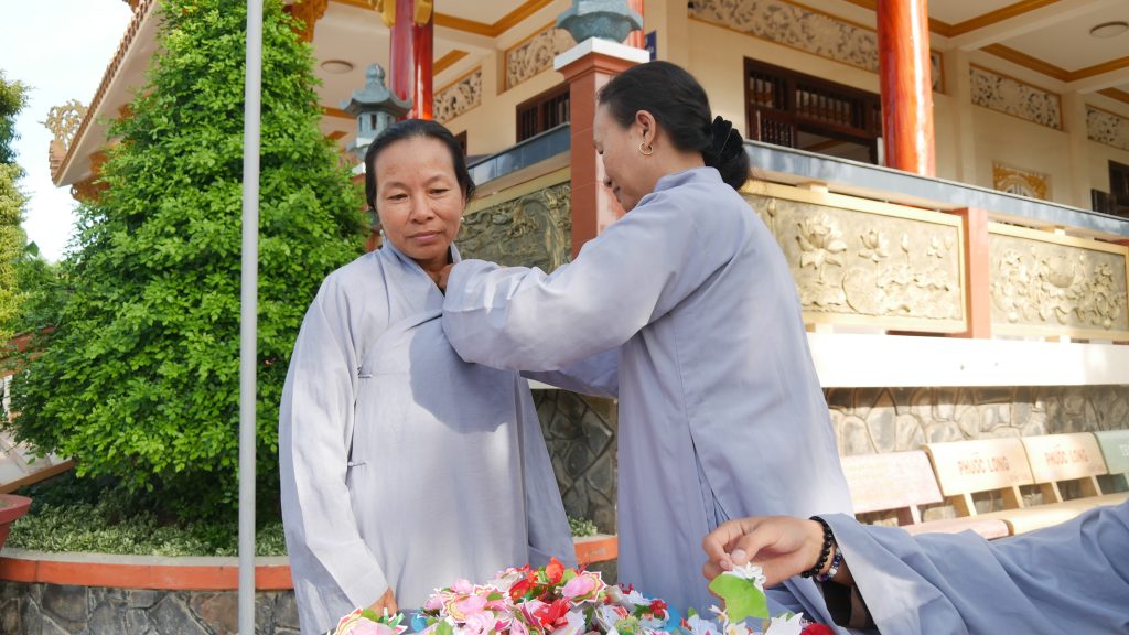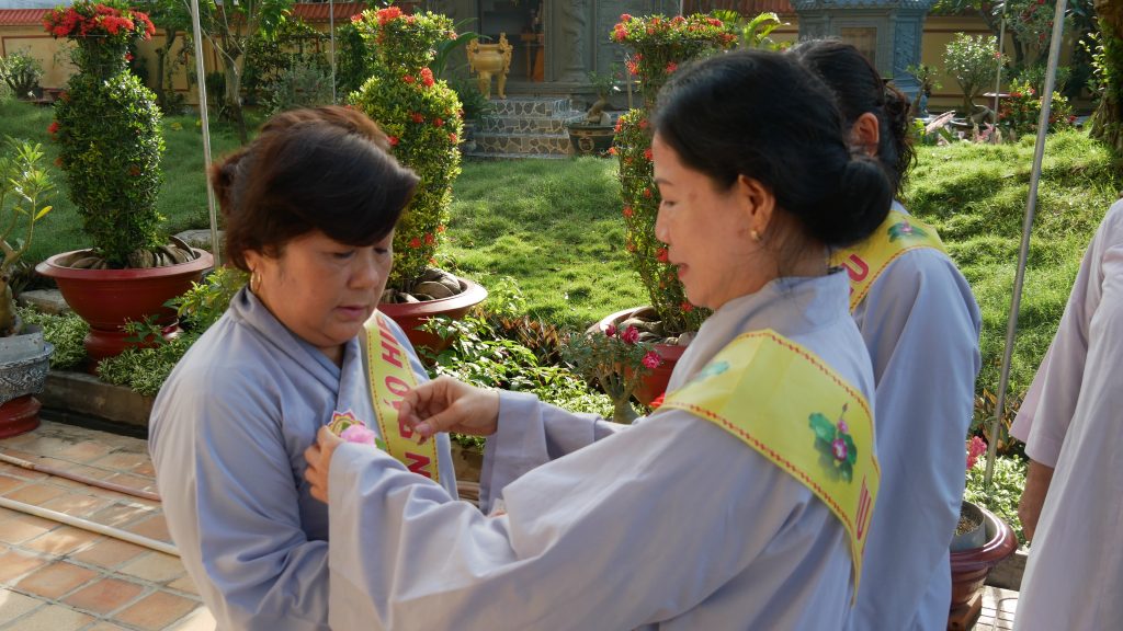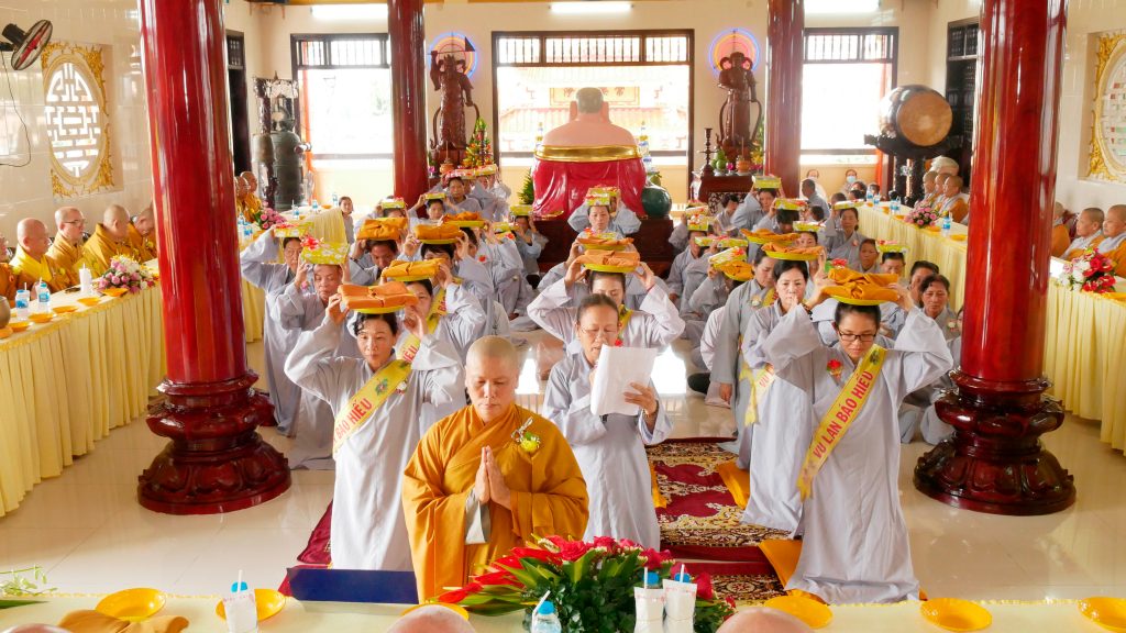 Trong giây phút lắng đọng thành kính, ĐĐ.Thích Thiên Bình đã cung thỉnh chư Tôn đức chứng minh cùng hòa âm phúng tụng Kinh Vu Lan; Phật tử bắt đầu nhiễu y và hiệp tụng. Sau đó thay mặt đạo tràng, Phật tử Phước Tú dâng lời tác bạch cúng dường pháp y đến chư Tôn đức tham dự pháp hội. Mừng chư Tôn thiền đức Tăng, Ni thêm hạ lạp, mãi là những vị thầy khả kính dẫn dắt hàng Phật tử trên bước đường tu nhân, học Phật.