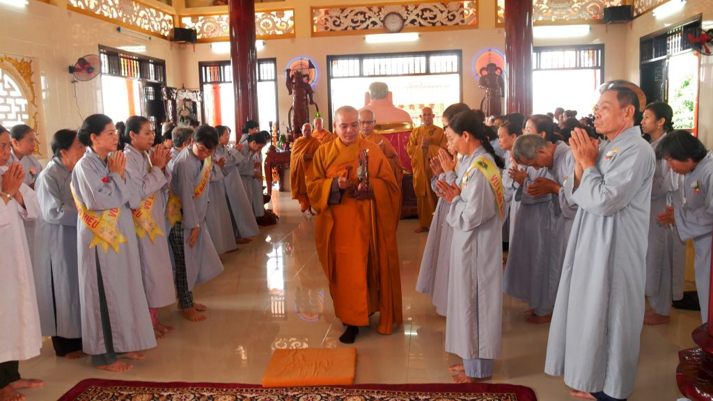 Hàng Phật tử tại gia với màu áo lam giải thoát, trang nghiêm thanh tịnh trước Chánh điện, tay chắp búp sen một lòng thành kính cung thỉnh chư Tôn thiền đức quang lâm Đại hùng bảo điện niêm hương bạch Phật, cầu nguyện quốc thới dân an, Phật pháp trường hưng miên viễn.