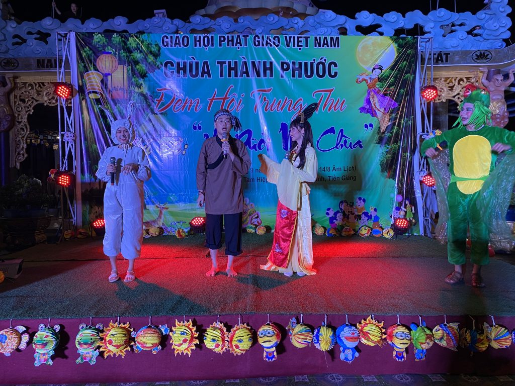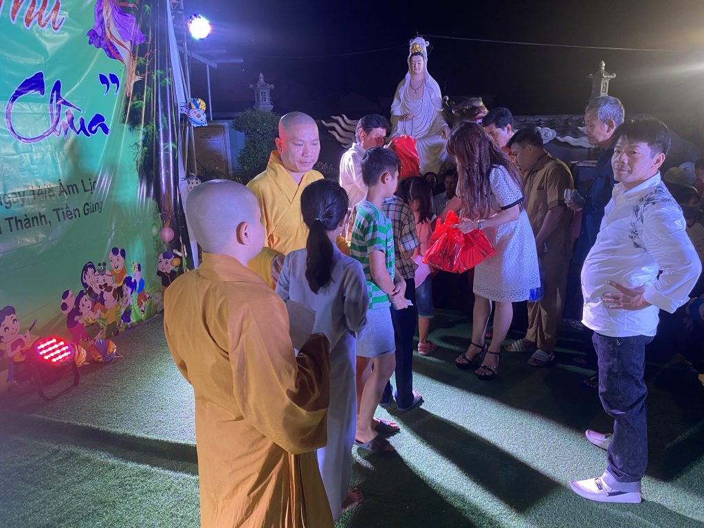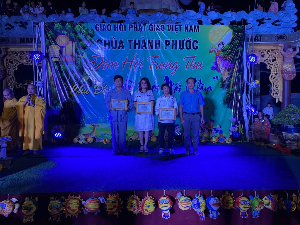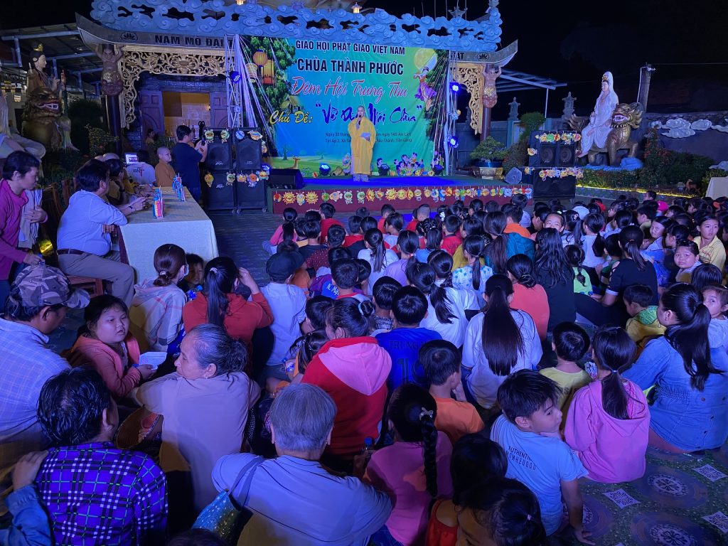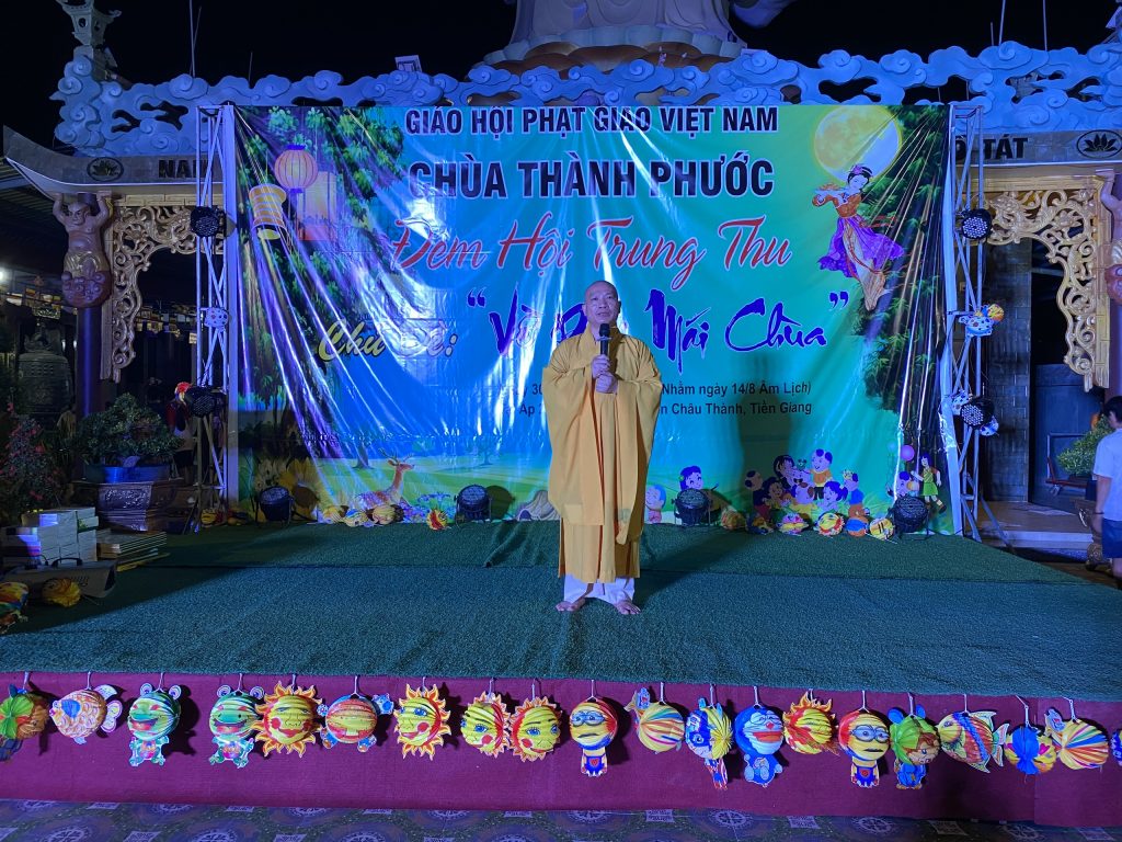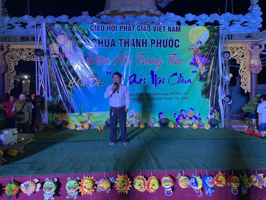 PSO - Với mong muốn tạo sân chơi lành mạnh cho các em thiếu nhi nhân tiết Trung thu; Chiều tối ngày 30/9/2020 tại chùa Thành Phước, xã Tam Hiệp, huyện Châu Thành, tỉnh Tiền Giang; Đại đức Trụ trì Thích Nhuận Đức – Phó trưởng BTS, Trưởng ban Hướng dẫn Phật tử GHPGVN tỉnh Tiền Giang kết hợp chính quyền địa phương, tổ chức Đêm hội Trăng rằm với chủ đề “Về Dưới Mái Chùa” - trao 20 phần học bổng và quà Trung thu cho hơn 500 em thiếu nhi tham gia vui chơi.