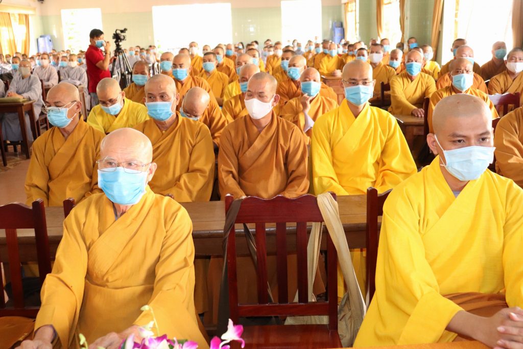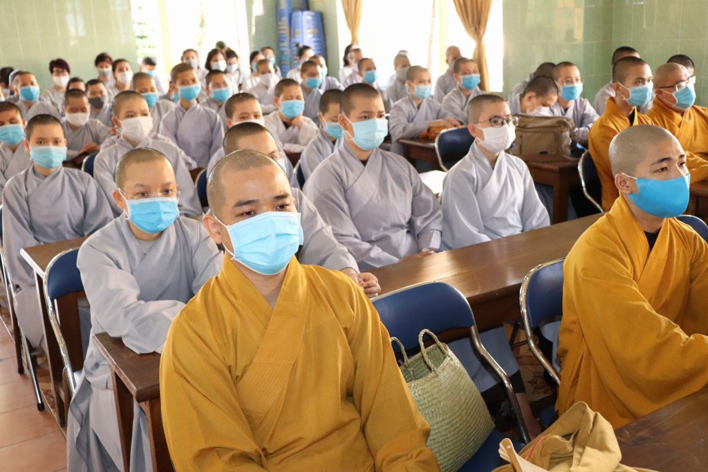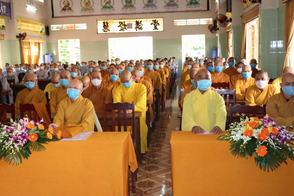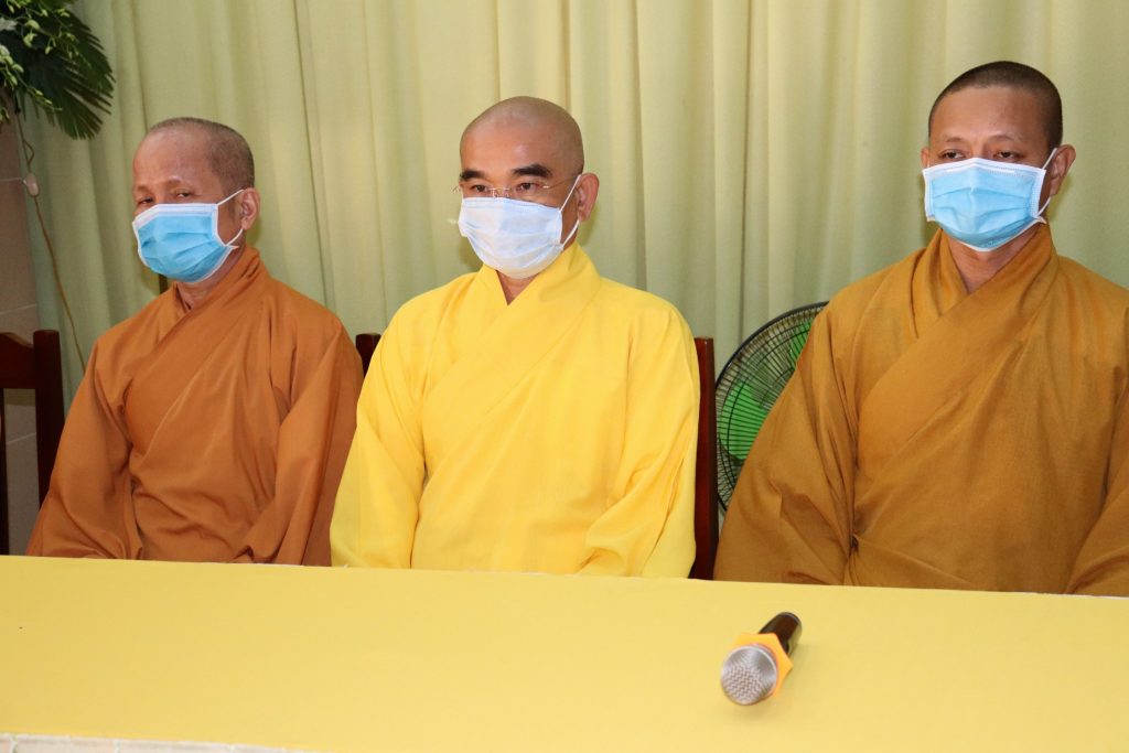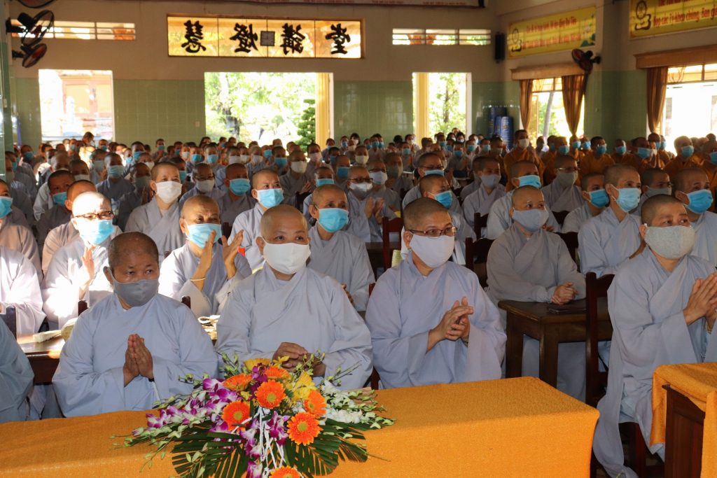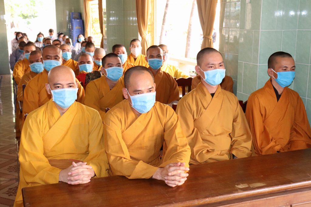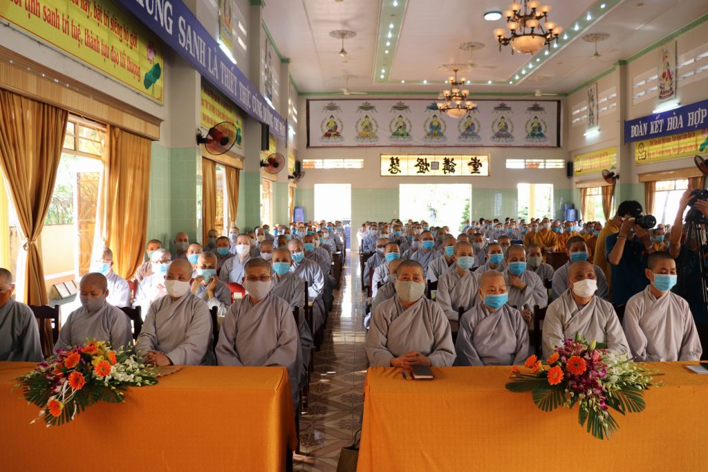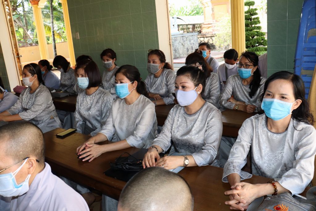 Tiếp đoàn có HT.Thích Huệ Minh - Ủy viên HĐTS, Trưởng BTS GHPGVN tỉnh Tiền Giang; TT.Thích Quảng Lộc – Phó BTS, Trưởng ban Từ thiện Xã hội Phật giáo tỉnh; chư Tôn đức trong Thường trực BTS GHPGVN tỉnh Tiền Giang cùng trên 400 chư hành giả An cư trong tỉnh Tiền Giang mùa Hạ PL.2564.