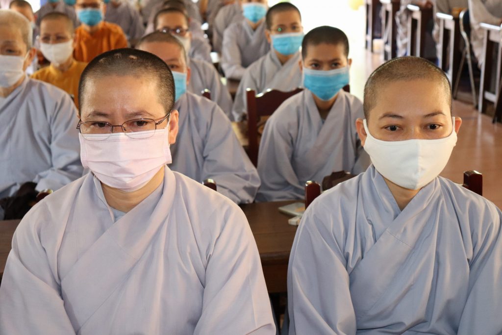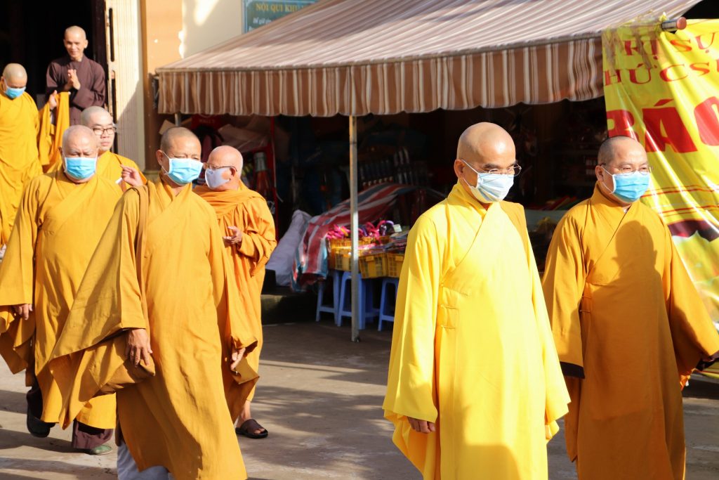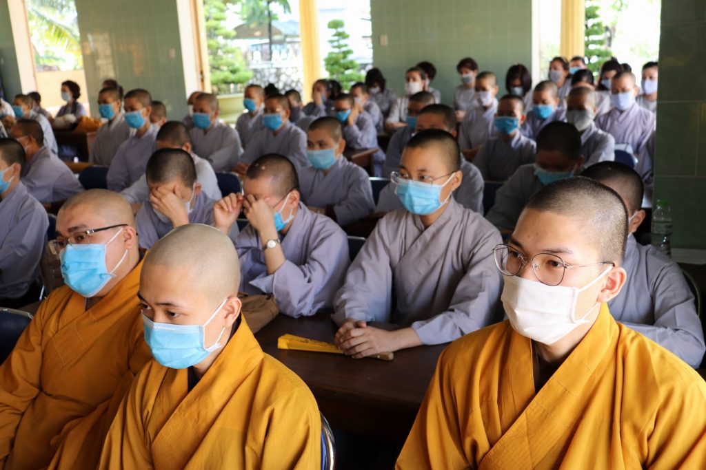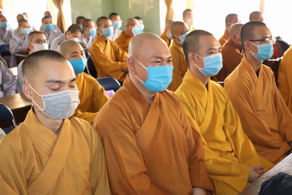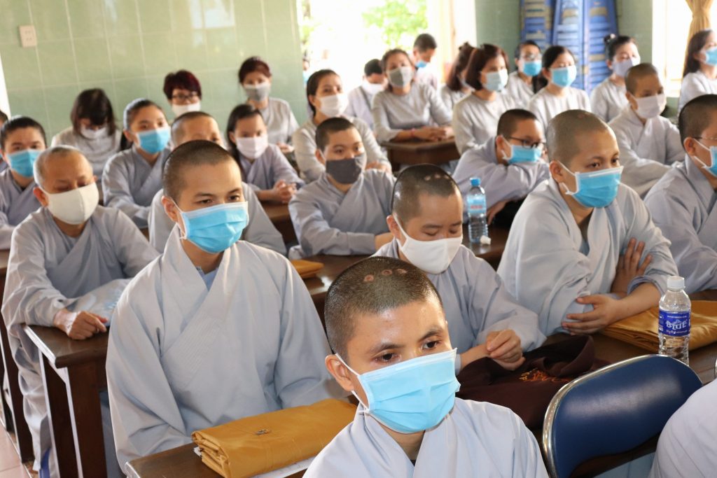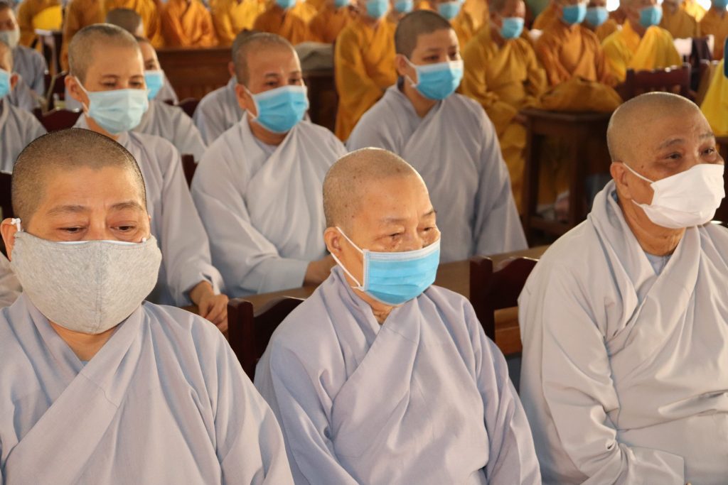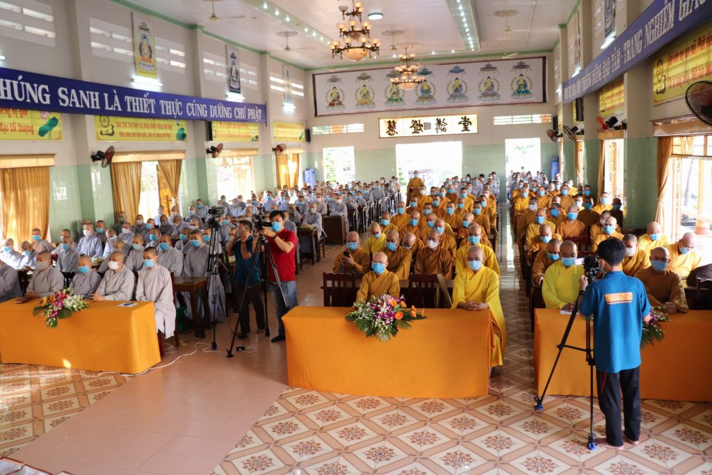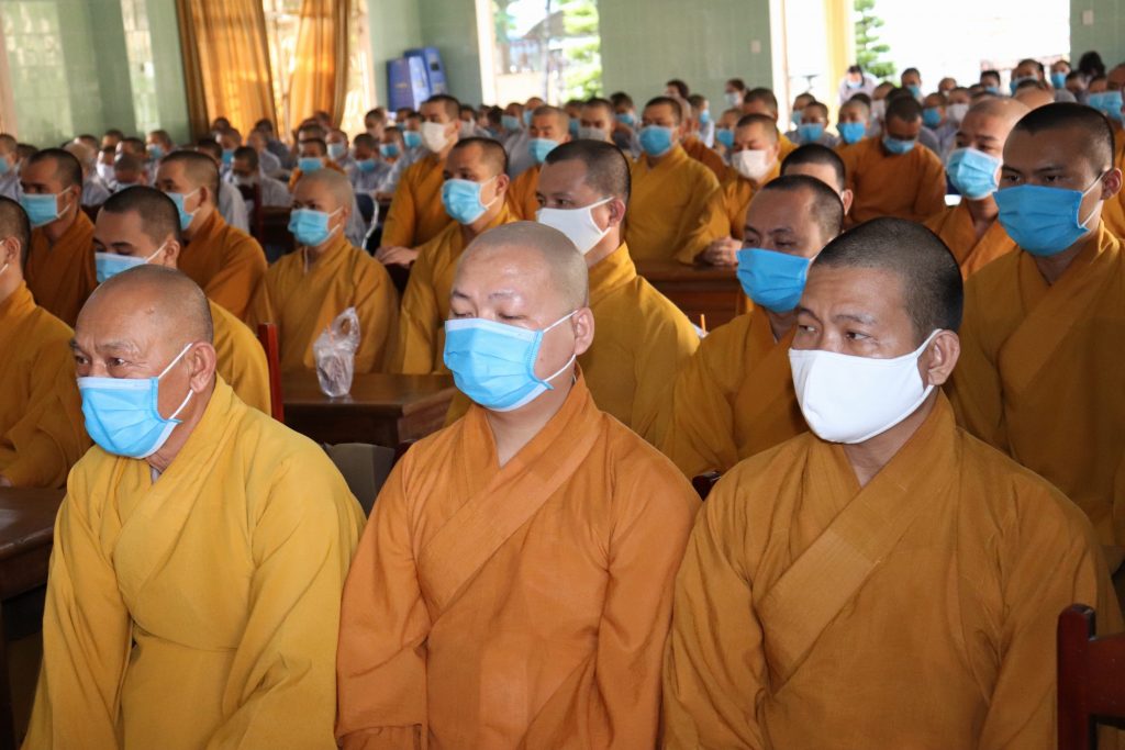 Tiếp đoàn có HT.Thích Huệ Minh - Ủy viên HĐTS, Trưởng BTS GHPGVN tỉnh Tiền Giang; TT.Thích Quảng Lộc – Phó BTS, Trưởng ban Từ thiện Xã hội Phật giáo tỉnh; chư Tôn đức trong Thường trực BTS GHPGVN tỉnh Tiền Giang cùng trên 400 chư hành giả An cư trong tỉnh Tiền Giang mùa Hạ PL.2564.