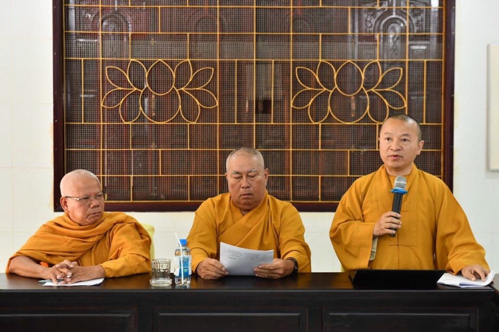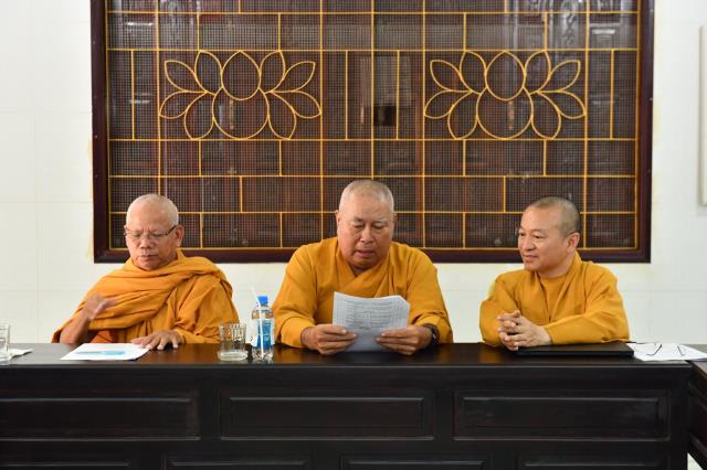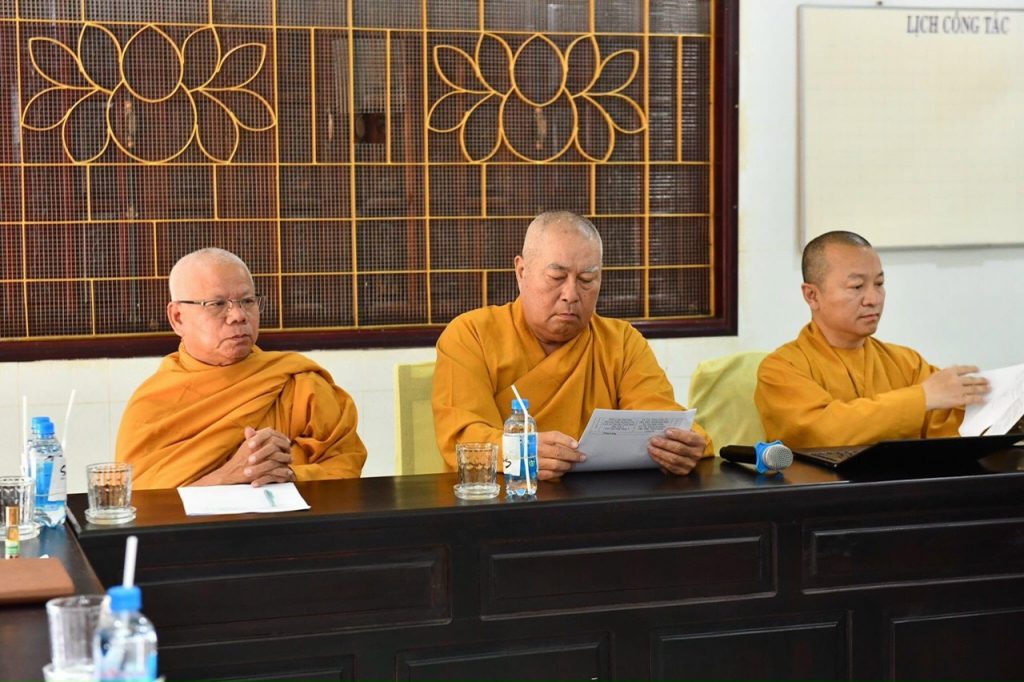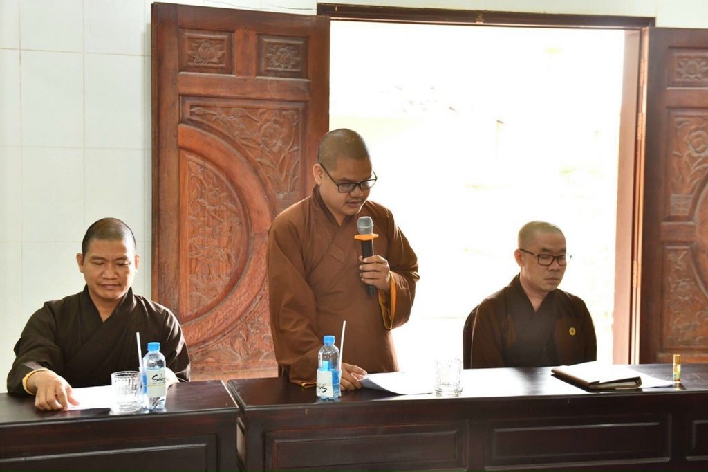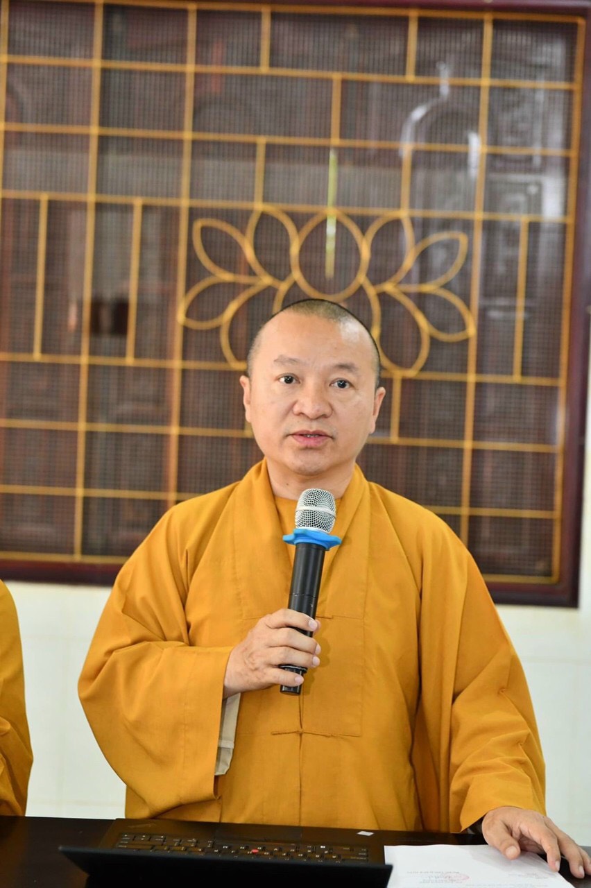 Đại diện BGH nhà trường, ĐĐ.Thích Huệ Phát báo cáo kết quả đào tạo Cao đẳng Liên thông khoá I (2017-2019), Khoá II (2019-2021), chương trình đào tạo, giảng viên, số lượng và tình hình học tập Tăng Ni sinh các khóa.