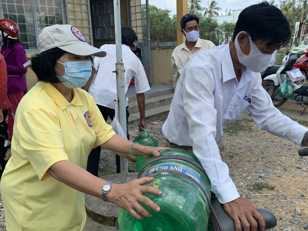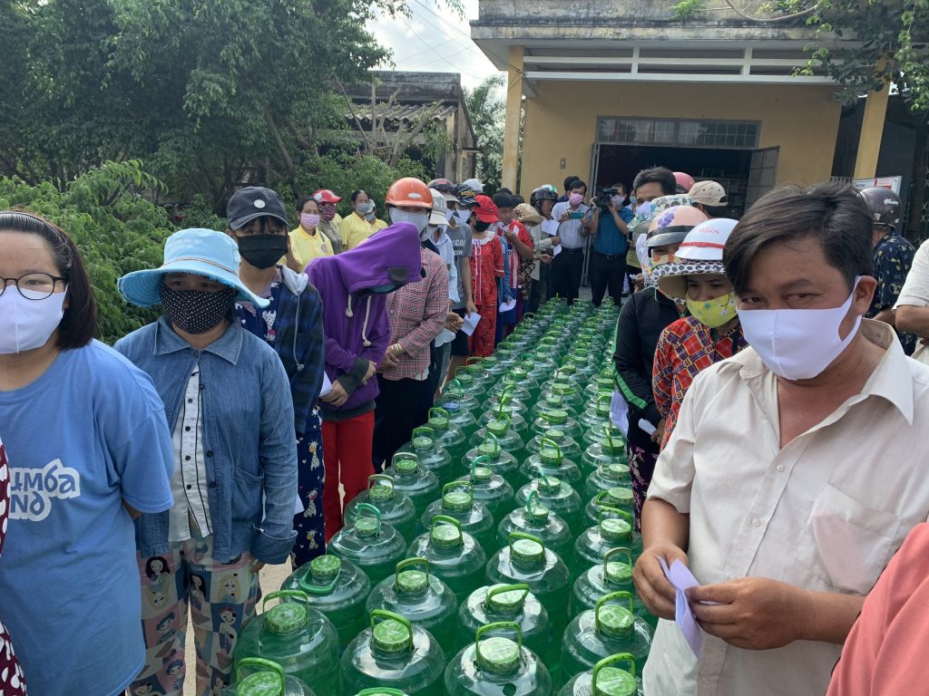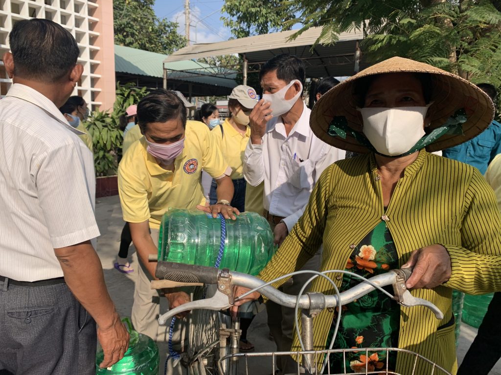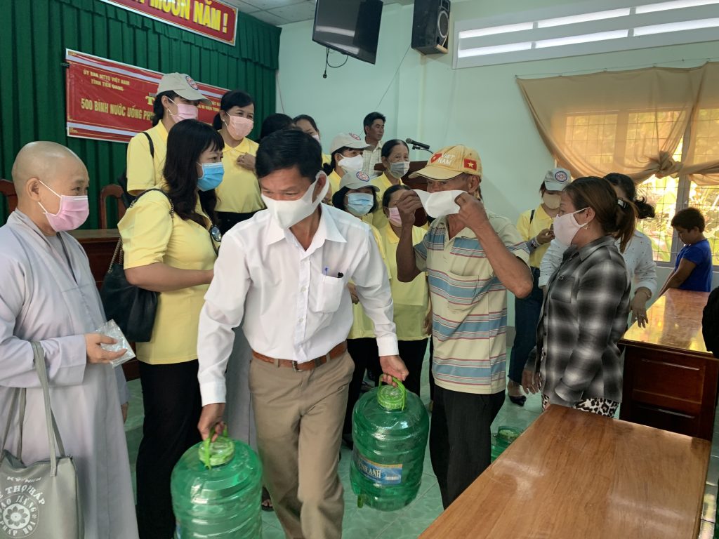Để thuận tiện cho bà con đến nhận nước, với sự điều phối của UB. MTTQVN tỉnh Tiền Giang, đoàn đã trao mỗi xã một điểm 500 bình nước để phân phối đến bà con tại địa phương (mỗi hộ được nhận 02 bình nước).