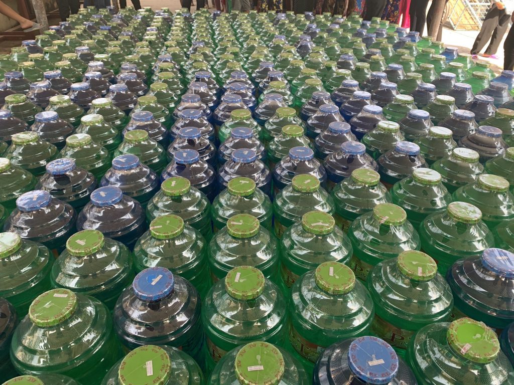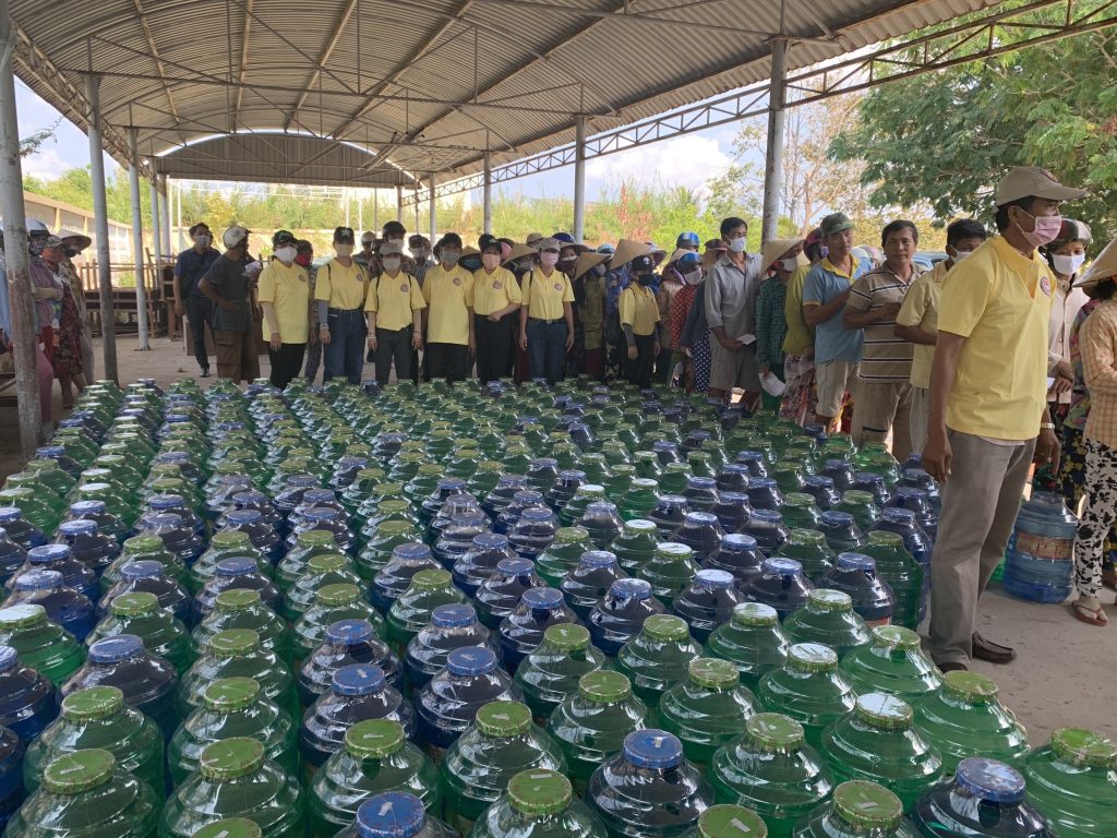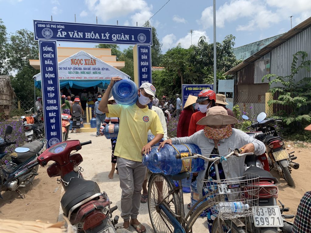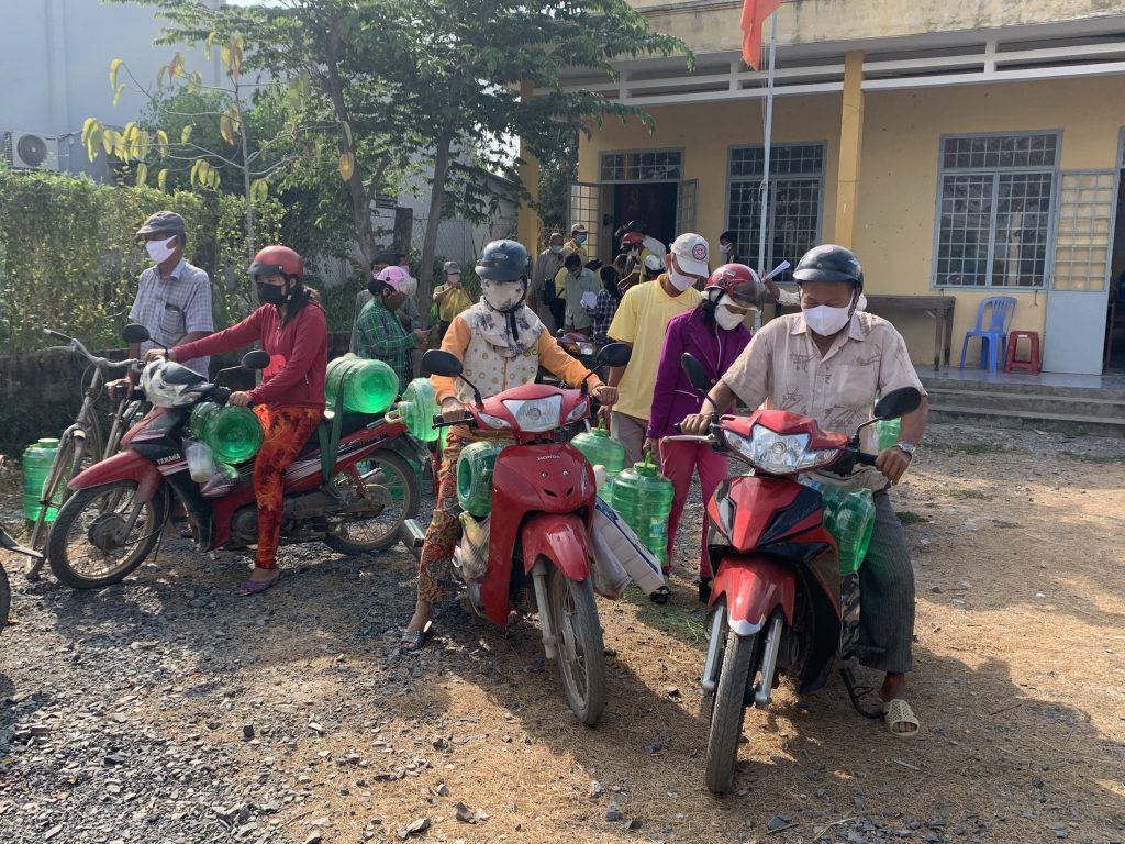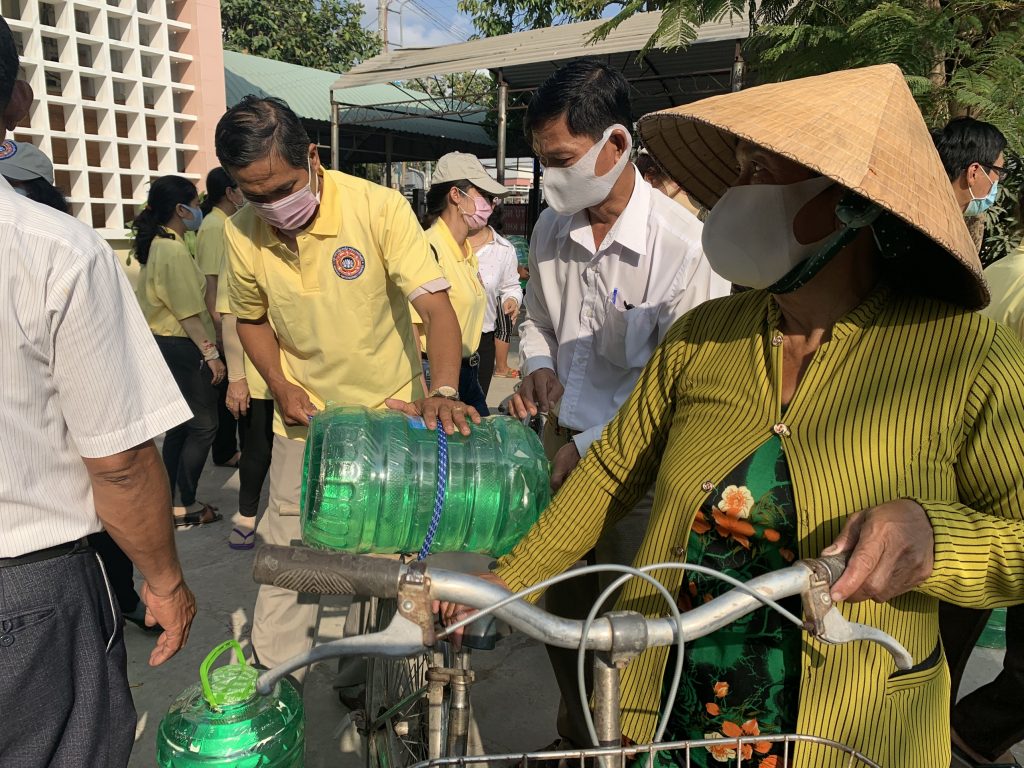 Để thuận tiện cho bà con đến nhận nước, với sự điều phối của UB. MTTQVN tỉnh Tiền Giang, đoàn đã trao mỗi xã một điểm 500 bình nước để phân phối đến bà con tại địa phương (mỗi hộ được nhận 02 bình nước).