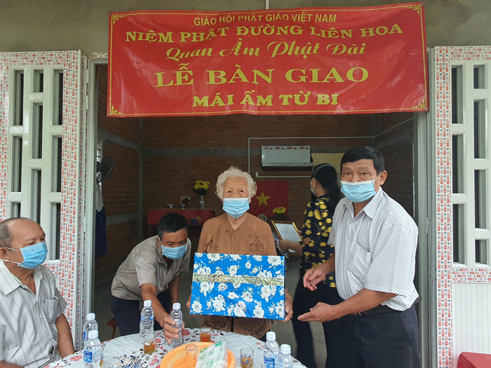 “Mái ấm Từ Bi” thứ nhất đã bàn giao cho cụ bà Võ Thị Nhung 81 tuổi, ngụ tại địa chỉ ấp Lương Phú B, xã Lương Hòa Lạc. Bà hiện sinh sống một mình, không có đất đai canh tác, tài sản duy nhất là nền nhà đang ở.