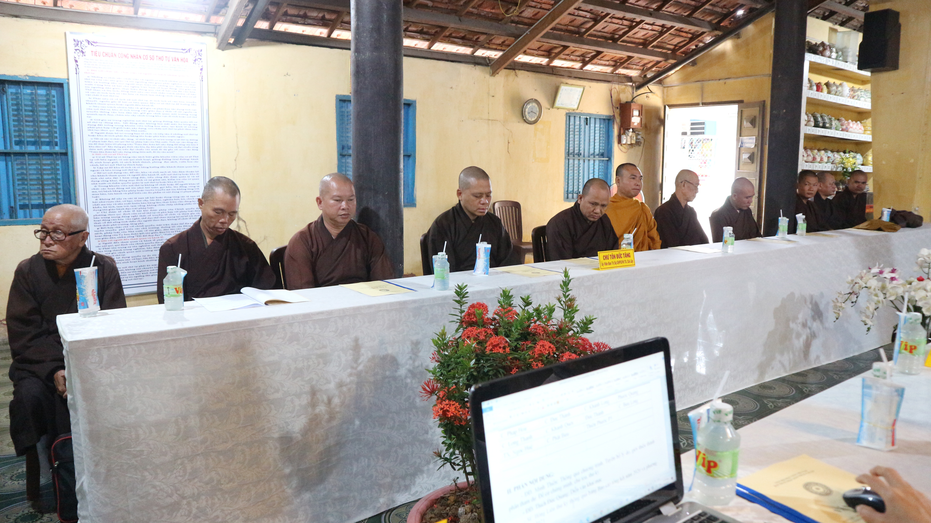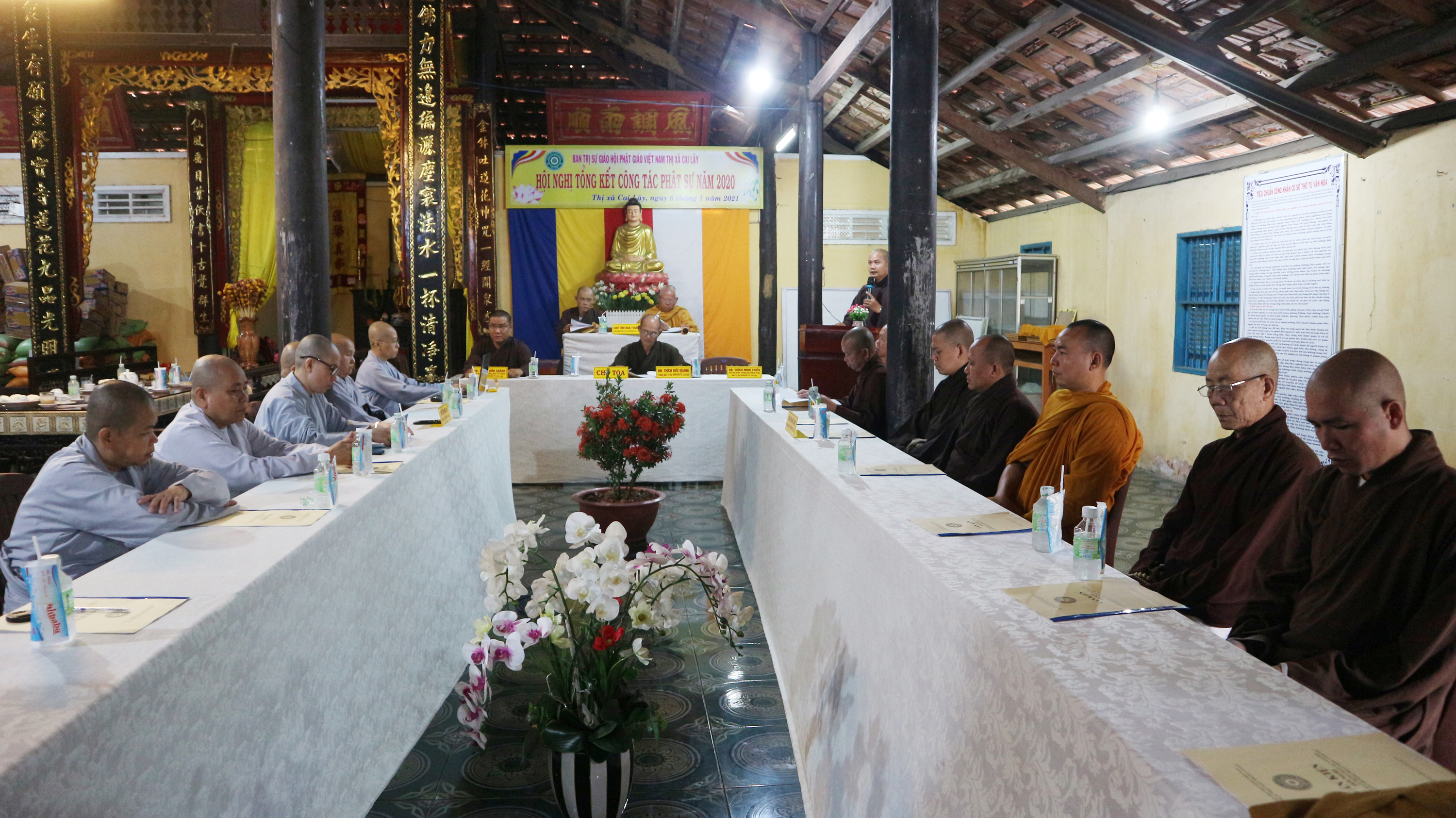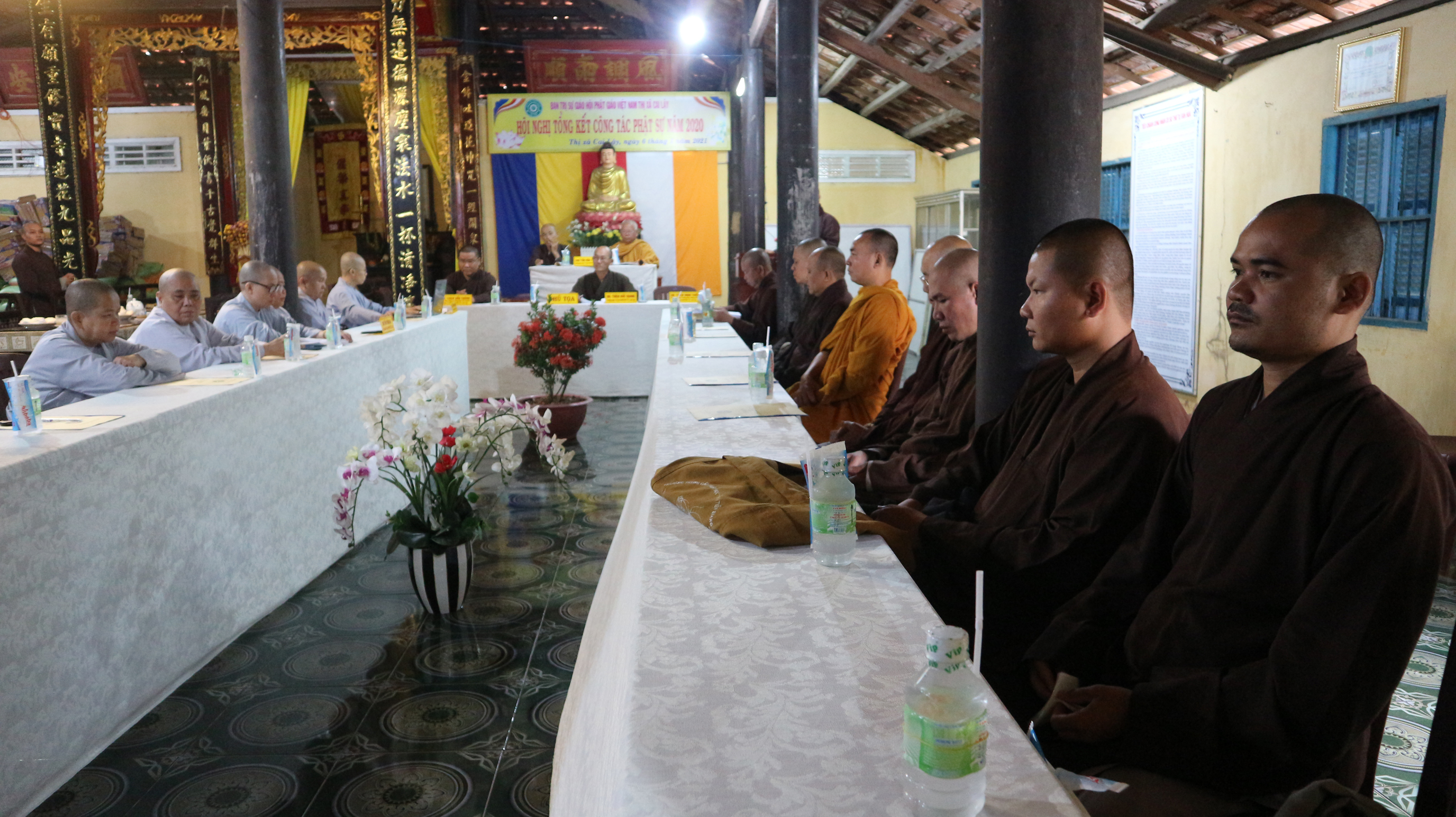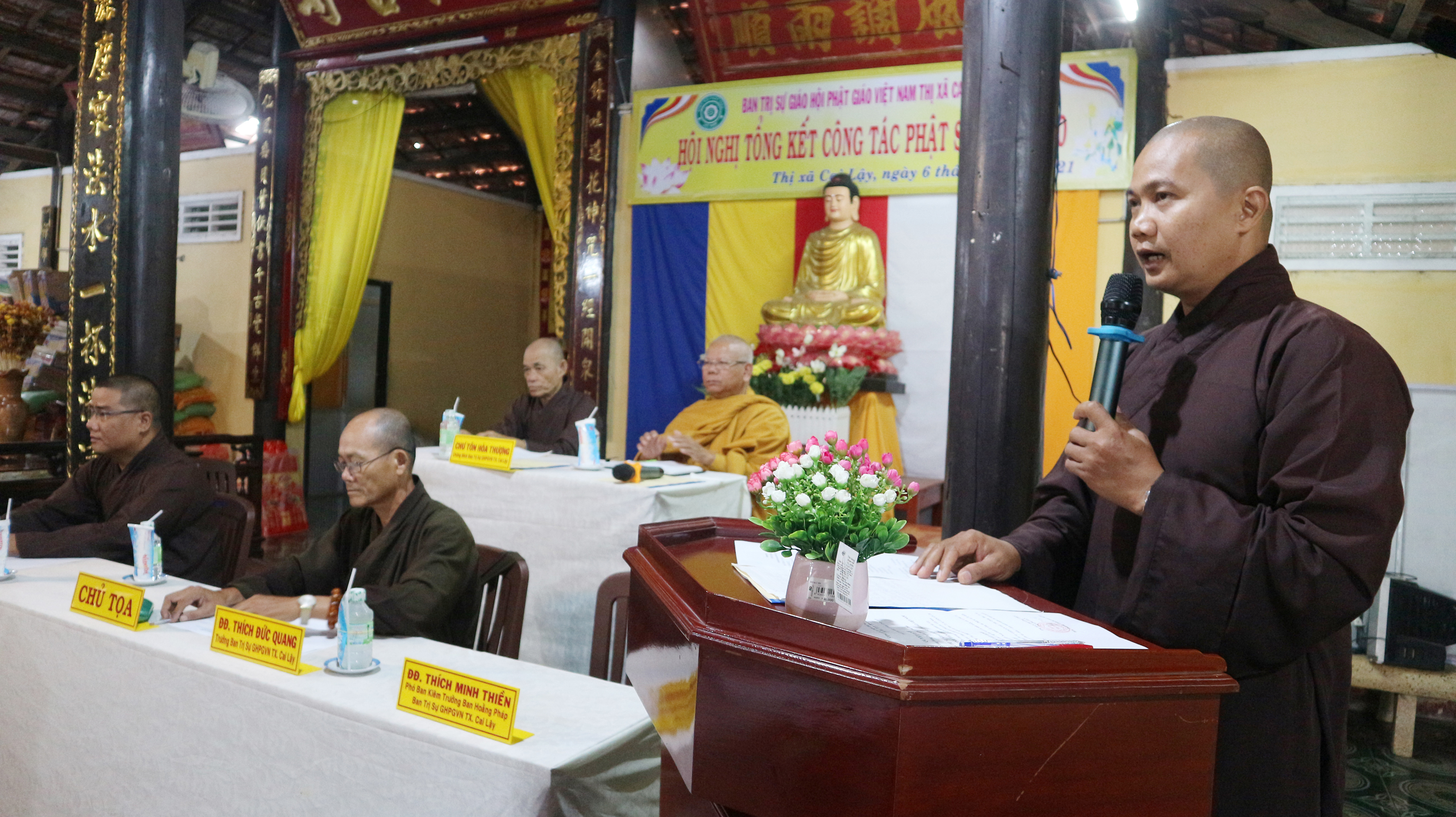SC.Thích Nữ Hồng Liên – Chánh Thư ký BTS PG thị xã báo cáo tổng kết hoạt động Phật sự năm 2020. Theo kết quả báo cáo như sau: toàn thị xã có 35 ngôi tự viện (Bắc tông: 32 ngôi; Khất sĩ: 3 ngôi - chùa Tăng: 23 ngôi; chùa Ni: 12 ngôi); 126 Tăng Ni (82 vị Tăng, 44 vị Ni). Hàng Giáo phẩm (Tăng): Hòa thượng 02 vị, Thượng tọa 04 vị; Đại đức 54 vị, Sa-di 7 vị; Tịnh nhơn: 15 vị); chư Ni có: Ni trưởng 01 vị, Ni sư 04 vị, Sư cô 37 vị, Sa-di ni 01 vị, Tịnh nhơn 01 vị. Trong năm 2020, thị xã có 11 vị tham dự khóa ACKH, 11 vị tham dự Lớp Nâng cao nghiệp vụ Trụ trì; ký giấy thọ giới Tỳ kheo 02 vị; Sa-di 02 vị và xuất gia 06 vị.
