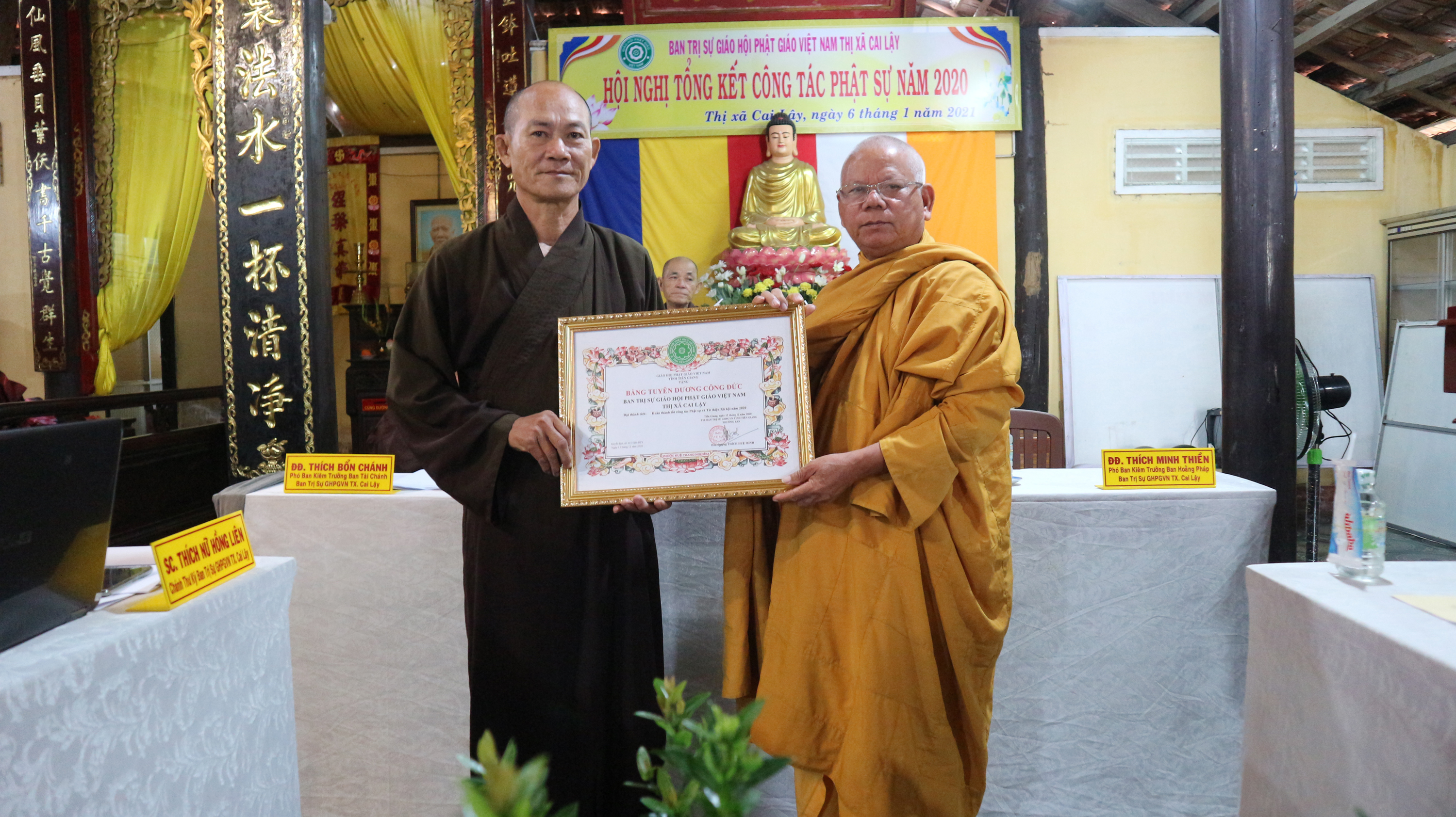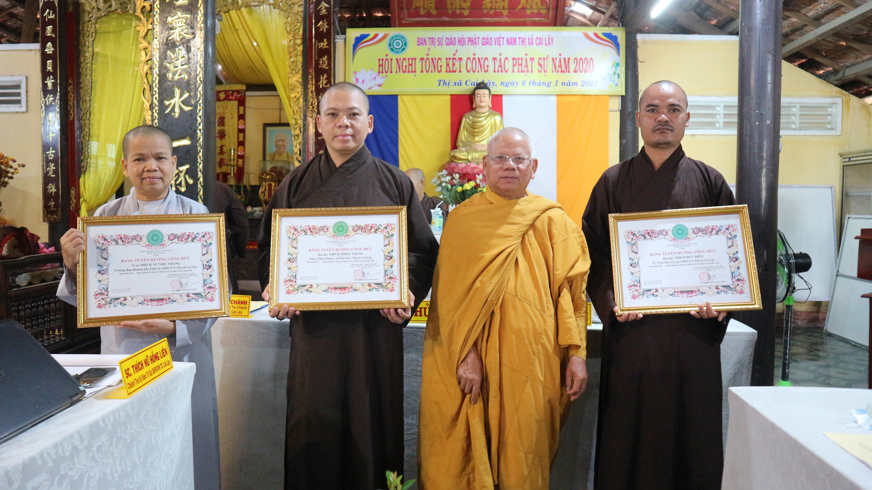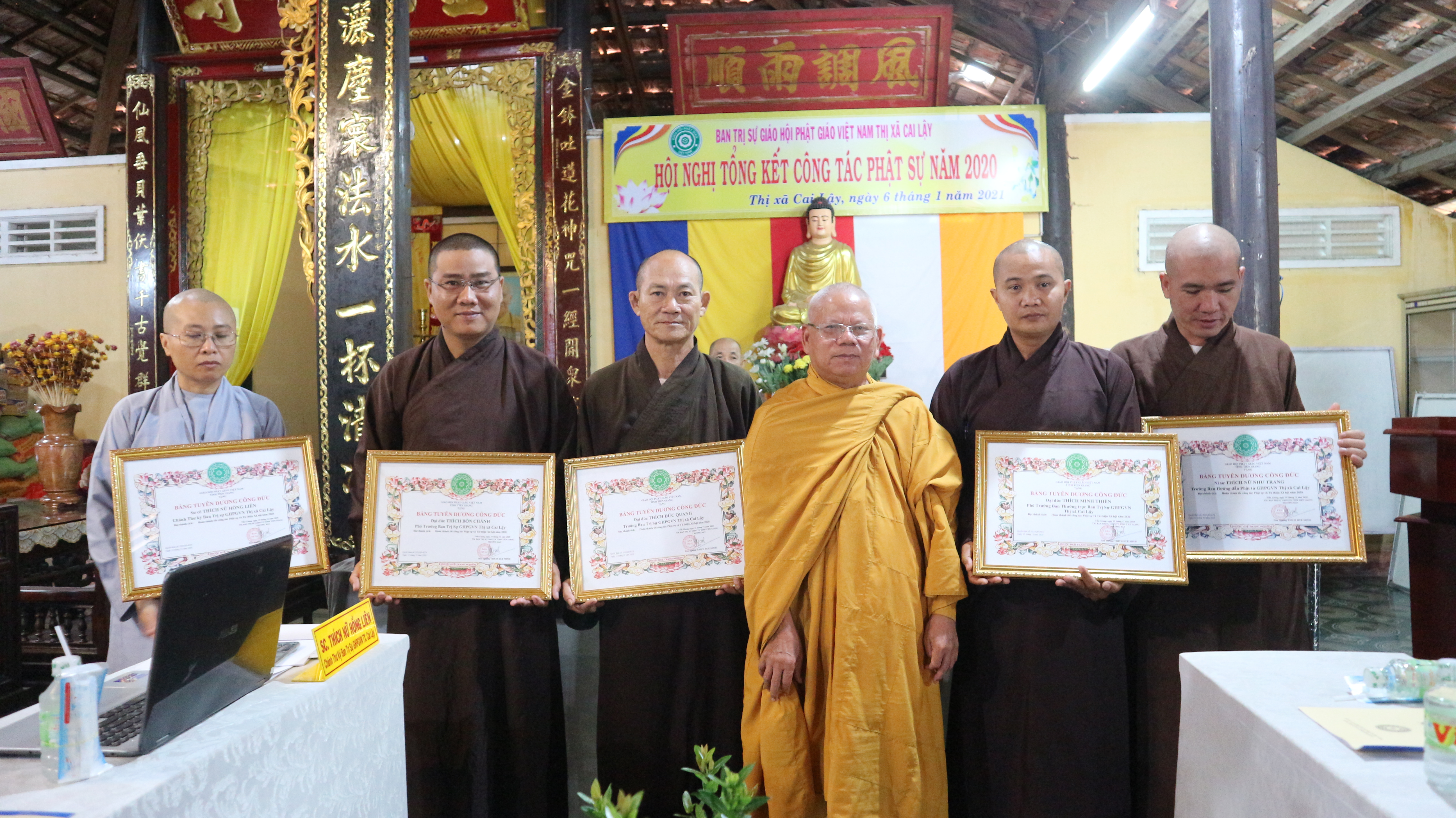 Tại Hội nghị, tập thể BTS và 08 cá nhân được đón nhận Bằng Tuyên dương Công đức của BTS GHPGVN tỉnh Tiền Giang, 01 cá nhân đón nhận Tuyên dương Công đức của BTS PG thị xã, ghi nhận công sức trí tuệ đóng góp cho các công tác Phật sự của thị xã trong năm.