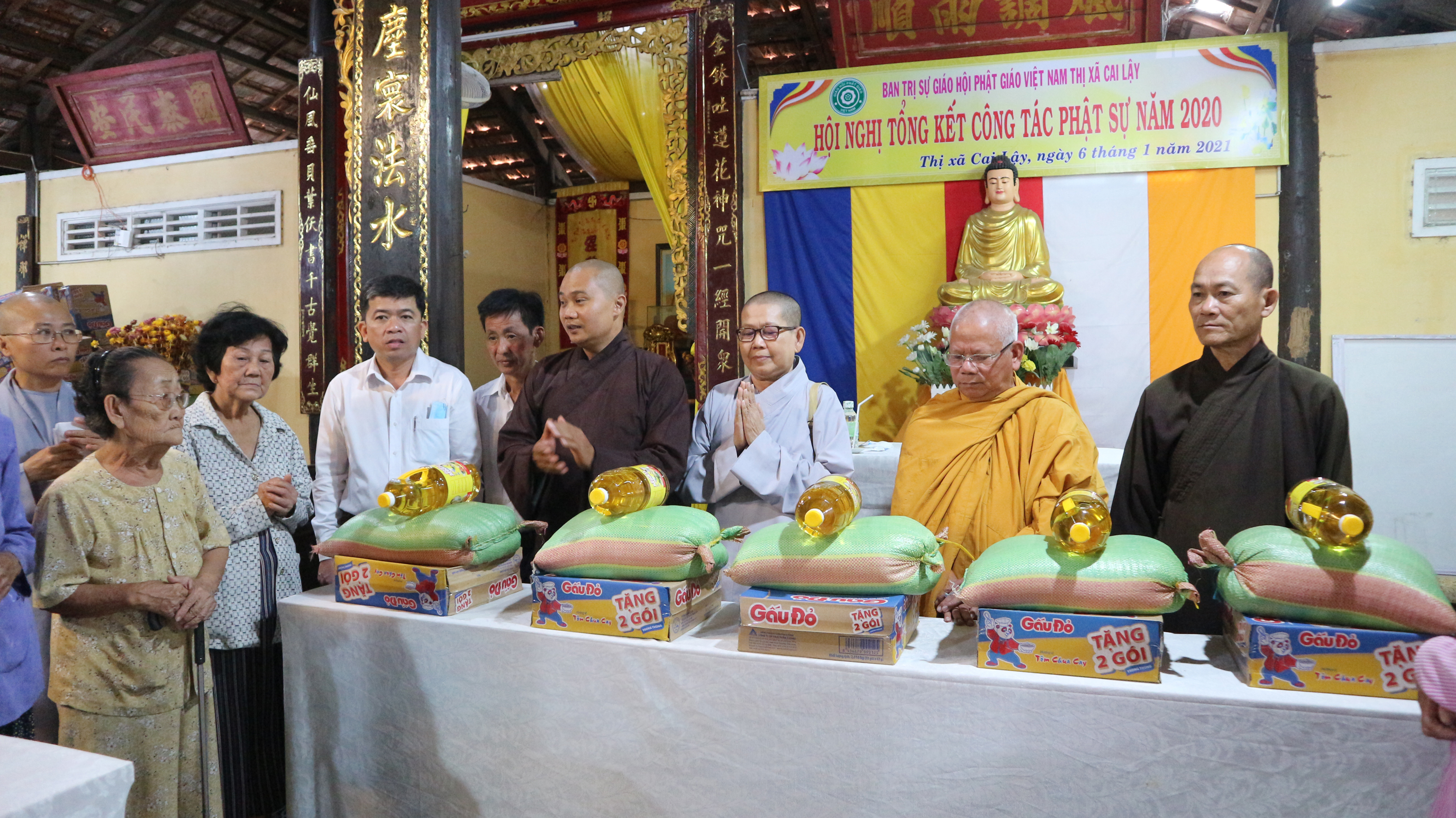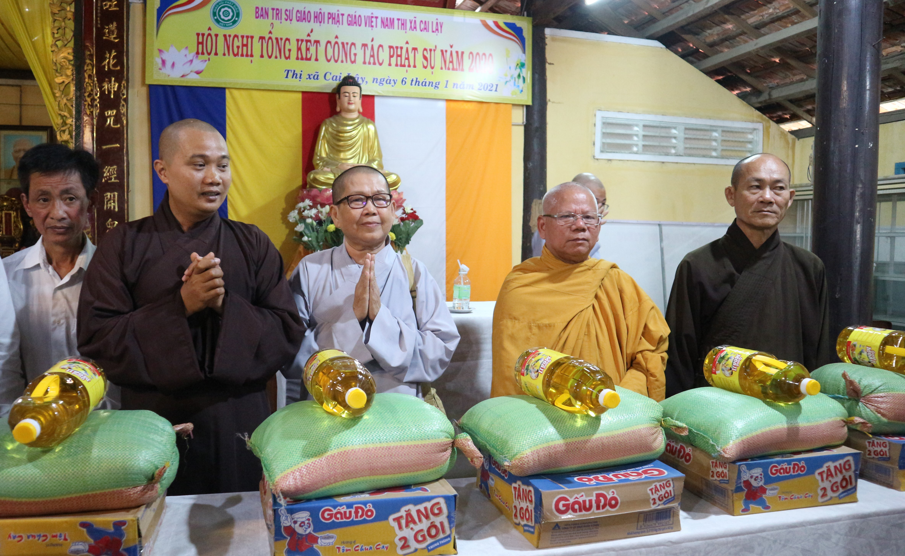 Cuối buổi hội nghị, BTS PG thị xã trao tặng 100 phần quà (gạo, mì, dầu ăn) cho hộ nghèo, hộ có hoàn cảnh khó khăn thuộc phường 5 thị xã Cai Lậy. Tổng trị giá 100 phần là 25 triệu đồng do SC.Thích Nữ Huệ Ngọc (chùa Bửu Long, xã Nhị Quý) hỗ trợ.