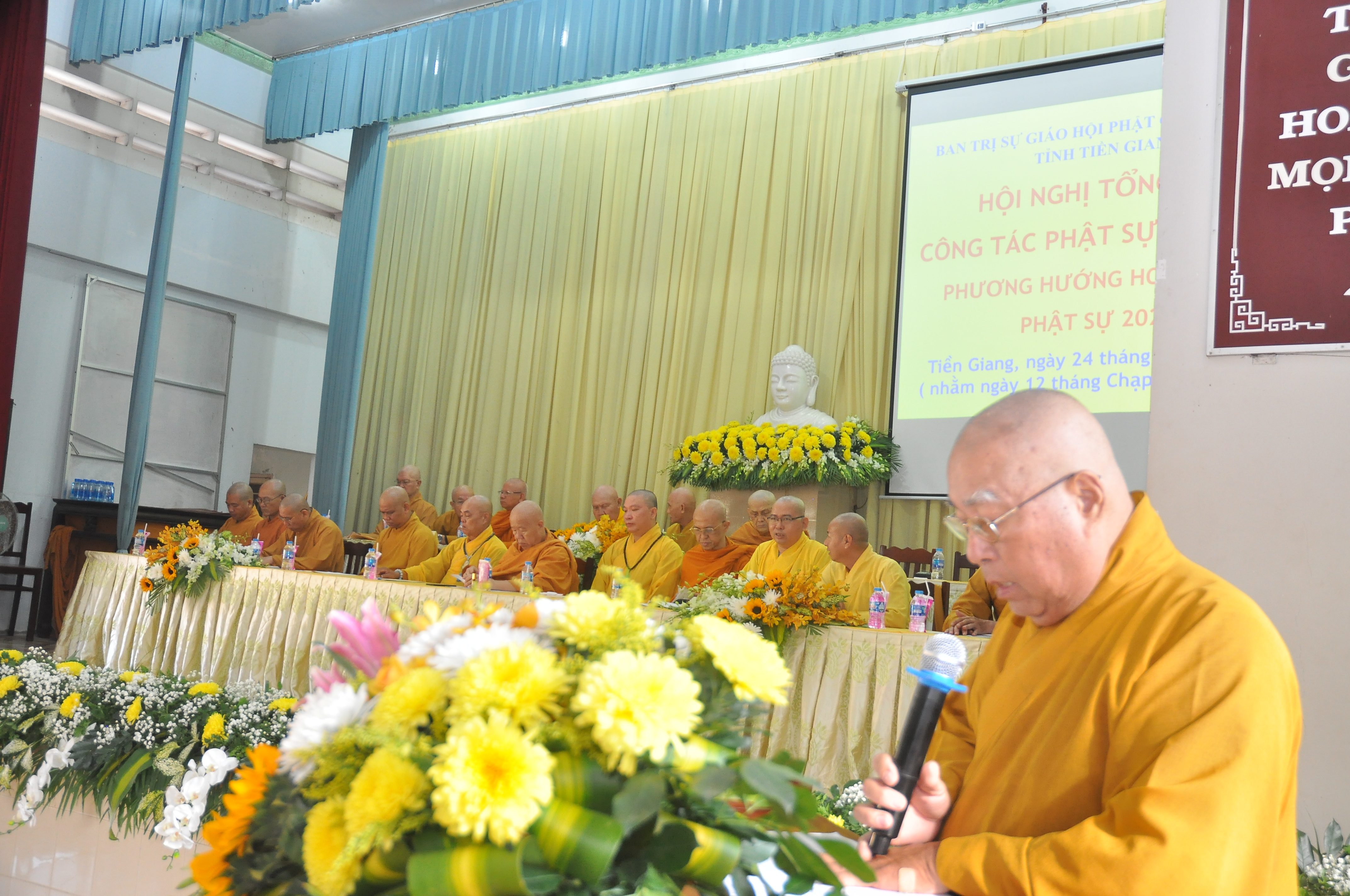 HT.Thích Huệ Minh - Ủy viên HĐTS, Trưởng BTS GHPGVN tỉnh Tiền Giang phát biểu Khai mạc Hội nghịThay mặt lãnh đạo Phật giáo tỉnh Tiền Giang, HT.Thích Huệ Minh phát biểu Khai mạc Hội nghị: Hoạt động của GHPGVN nói chung và BTS GHPGVN tỉnh Tiền Giang nói riêng luôn tuân thủ theo giáo lý Đức Phật và đường lối chính sách Pháp luật của Nhà nước quy định, đúng với tinh thần “Đạo pháp, Dân tộc, Chủ nghĩa xã hội”. Hội nghị hôm nay nhằm đúc kết quá trình hoạt động trong năm và rút kinh nghiệm cho các hoạt động sắp tới, rất mong được sự góp ý chân thành của chư Tôn đức để công việc Phât sự năm mới được thành tựu tốt đẹp hơn.