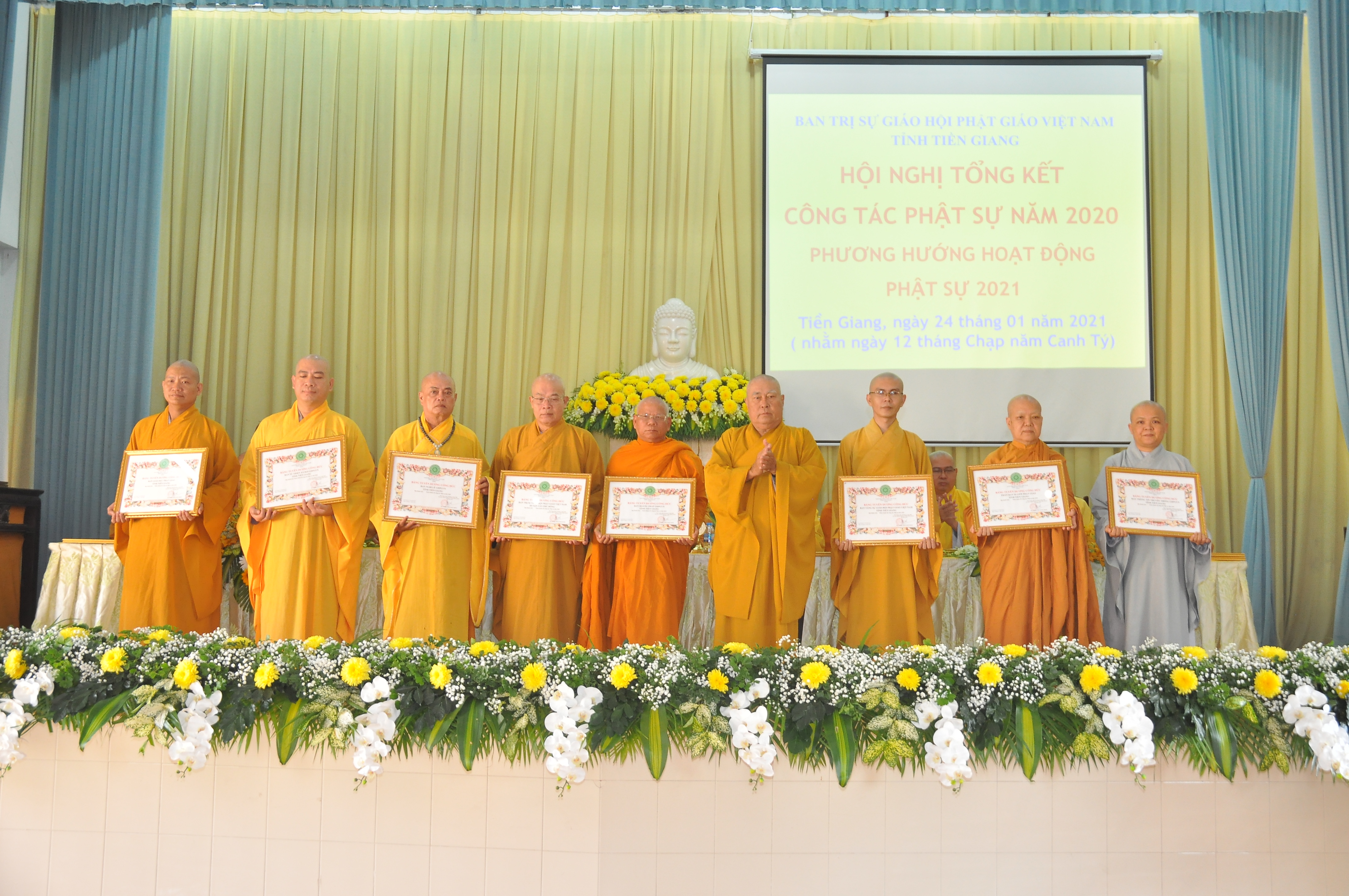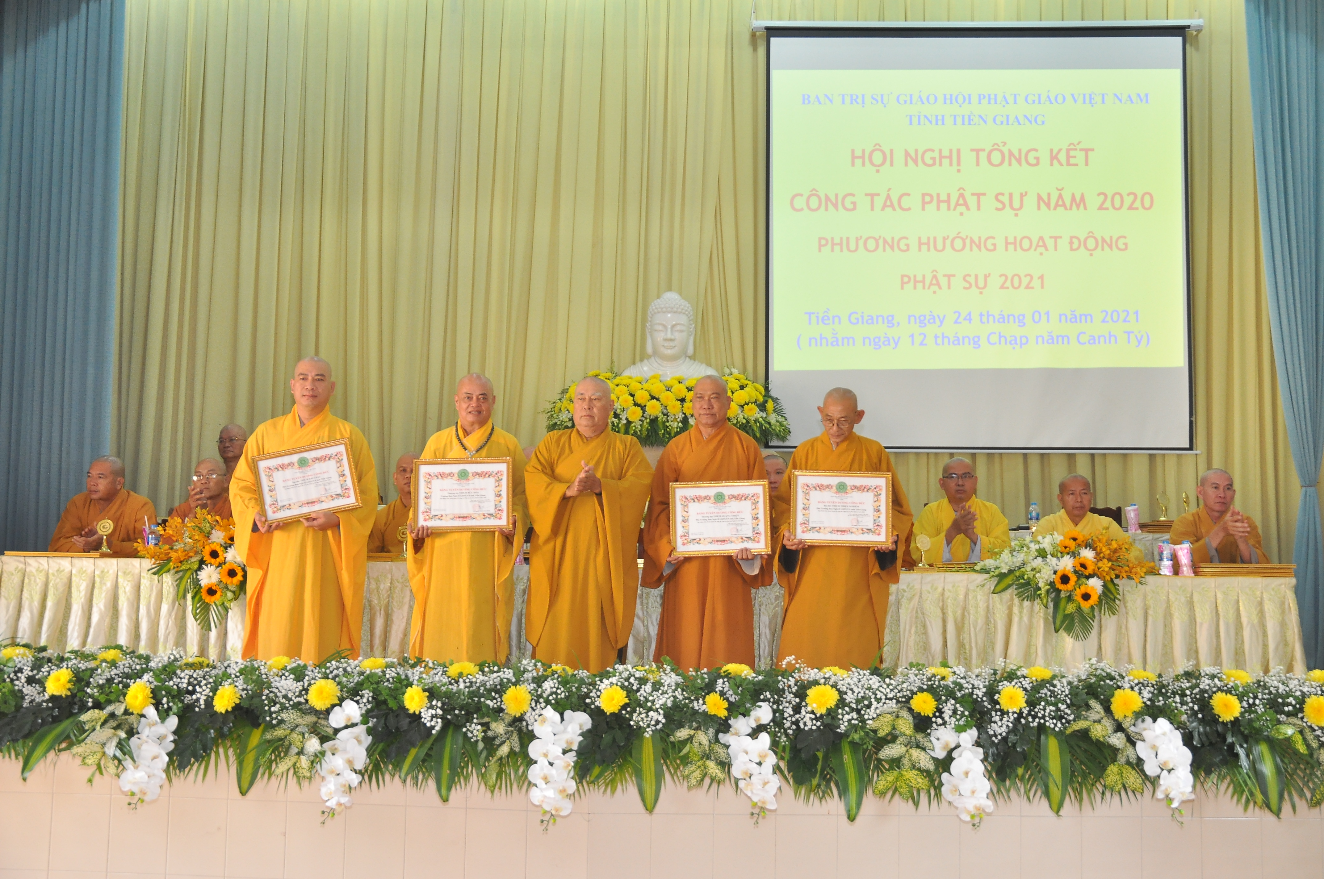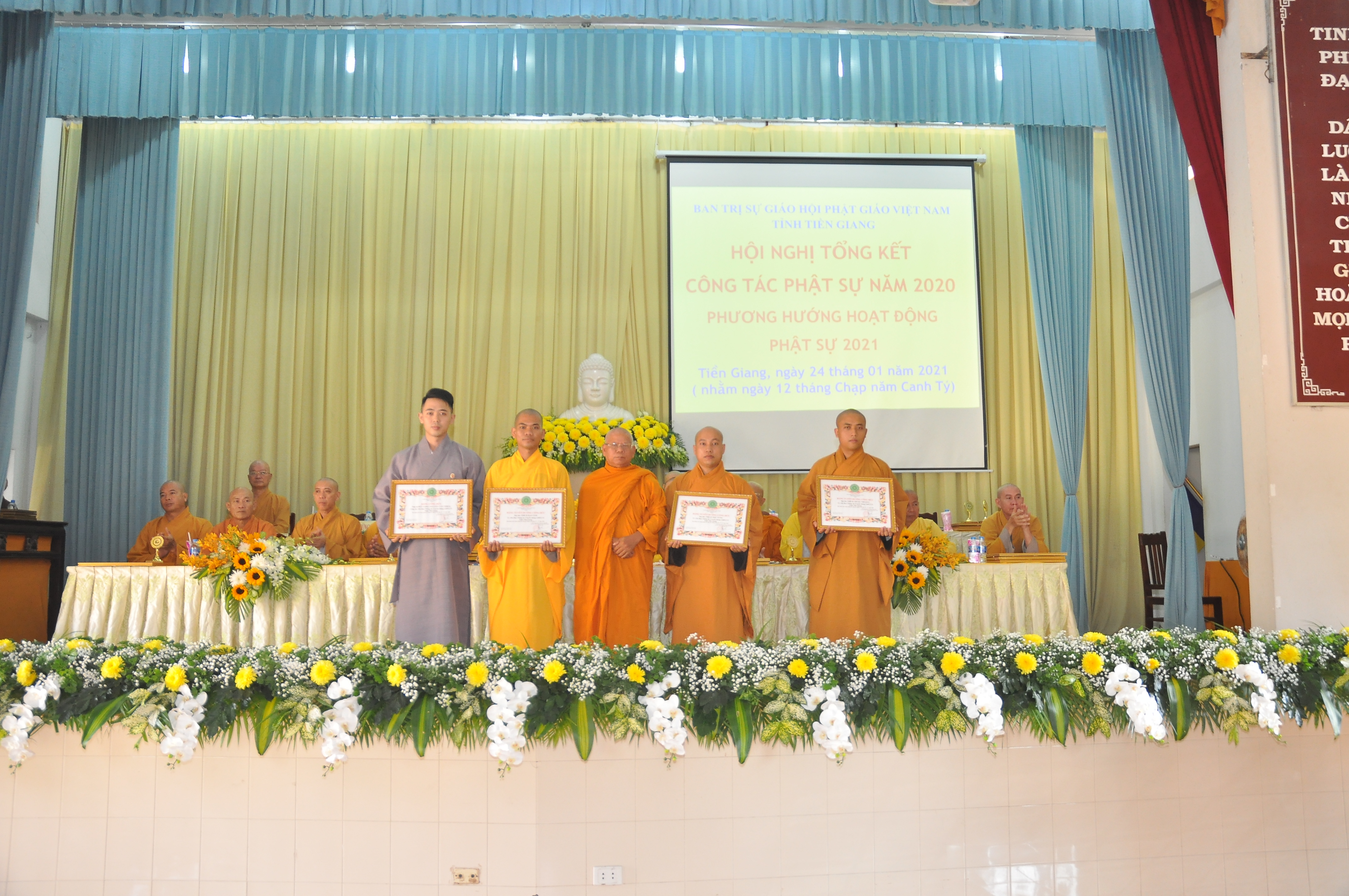 Để khích lệ tinh thần làm việc cho Tăng Ni, tại Hội nghị BTS GHPGVN tỉnh đã Quyết định trao tặng Bằng Tuyên dương Công đức đến các tập thể và quý Tôn đức có nhiều đóng góp cho hoạt động Phật sự chung. UBND và UB MTTQVN tỉnh Tiền Giang cũng có Bằng khen, Giấy khen và Kỷ niệm chương gửi tặng các tập thể cũng như cá nhân chư Tôn đức có đóng góp tích cực cho hoạt động Phật sự và Từ thiện Xã hội trong năm qua.