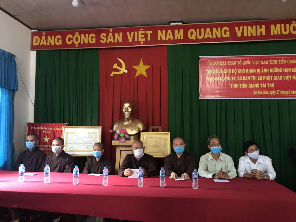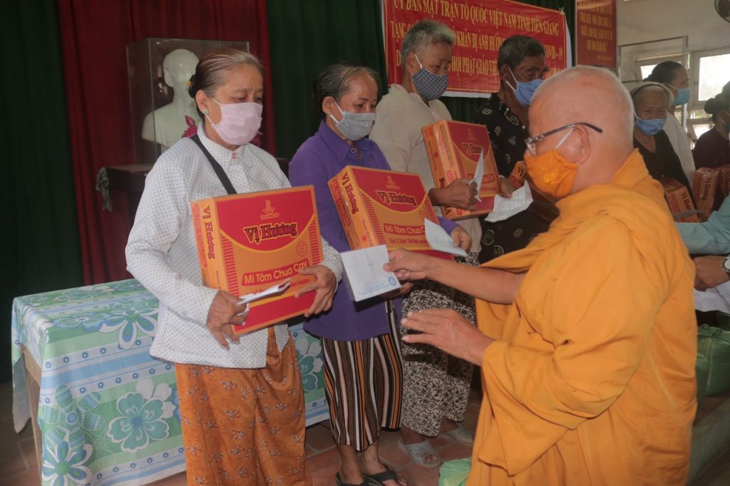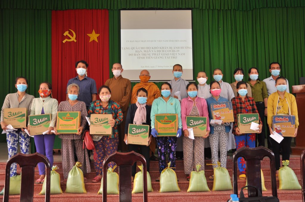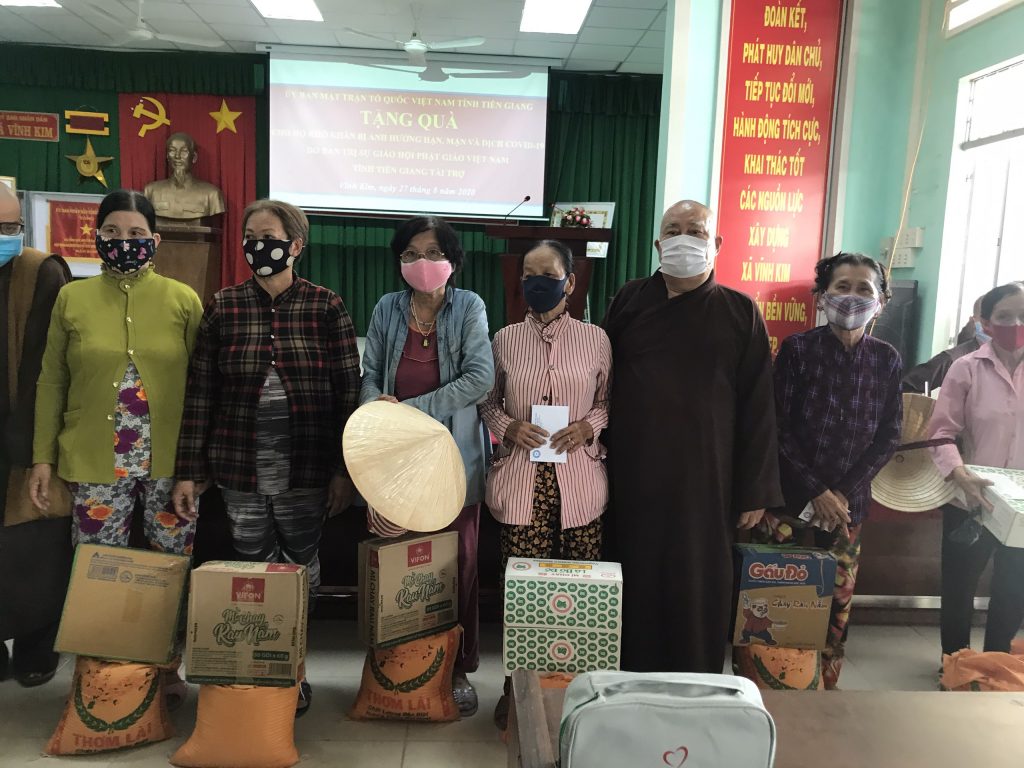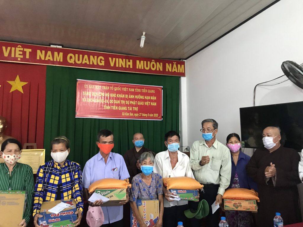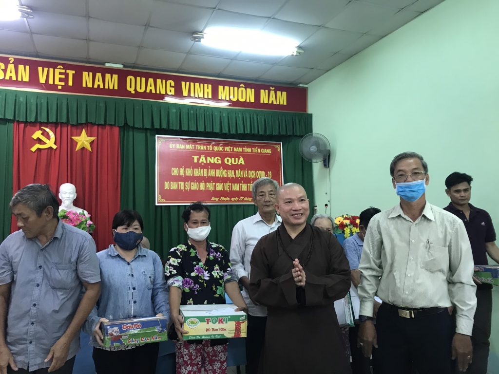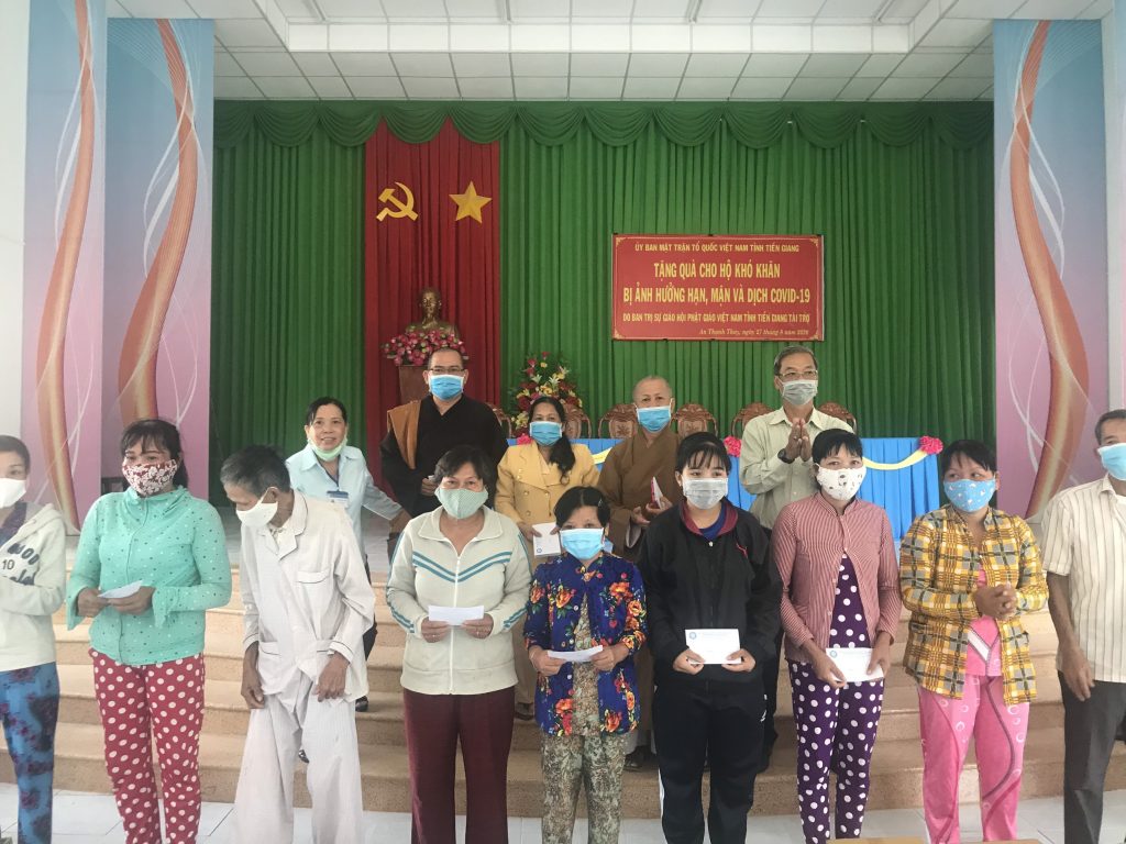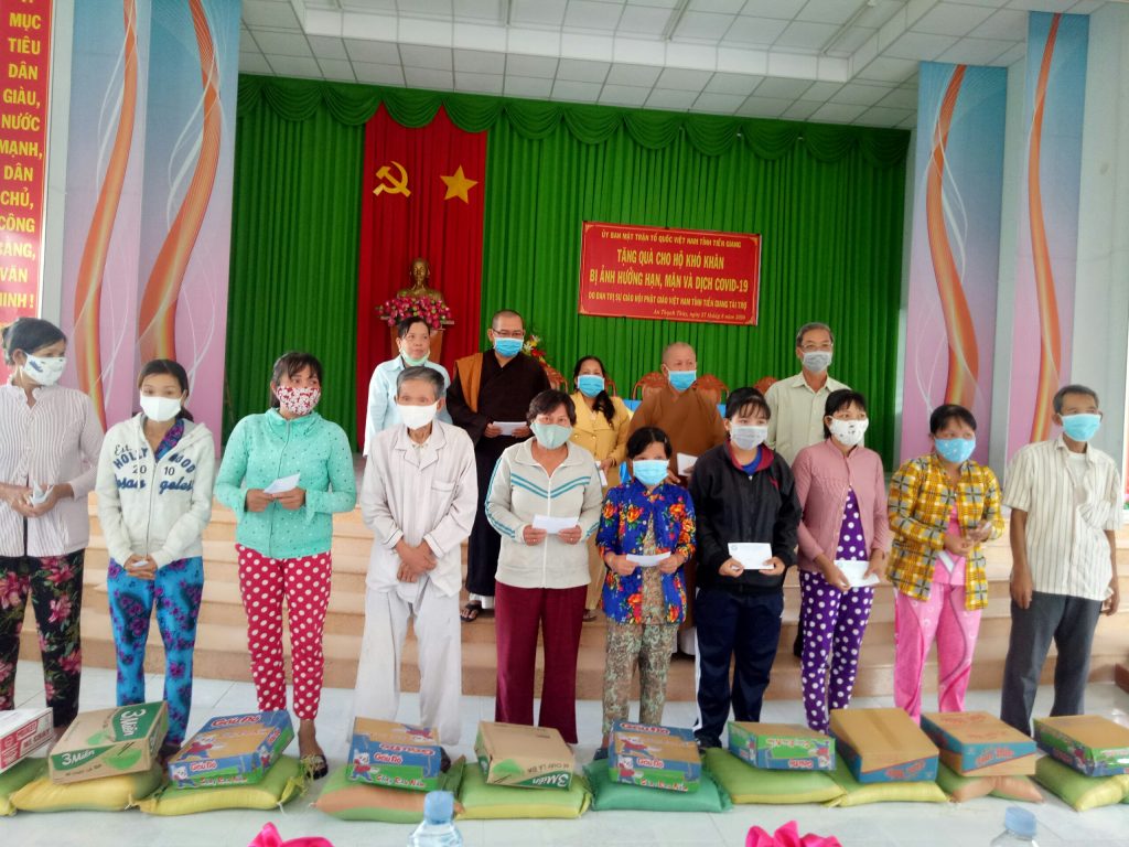 Đại dịch Covid-19 tuy không trực tiếp bùng phát tại tỉnh Tiền Giang, nhưng hậu quả của nó đã để lại rất nhiều khó khăn trong đời sống sinh hoạt cũng như nền kinh tế nói chung, đặc biệt là đối với người dân có thu nhập thấp. Với mong muốn tất cả mọi người đều được bình an vượt qua dịch bệnh và góp phần ổn định xã hội, Thường trực BTS GHPGVN đã phát động chương trình “cùng nhau đẩy lùi dịch bệnh”. Được sự phát tâm của chư Tôn đức Tăng, Ni và Phật tử trong toàn tỉnh, chương trình đã trao tặng 3.000 phần quà gồm: Gạo, mì gói và tiền mặt, tổng trị giá trên 1 tỷ 500 triệu đồng, đến với bà con.