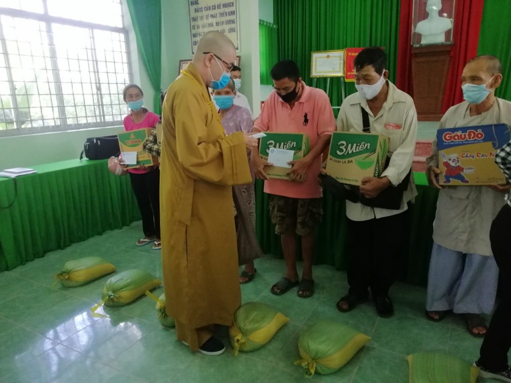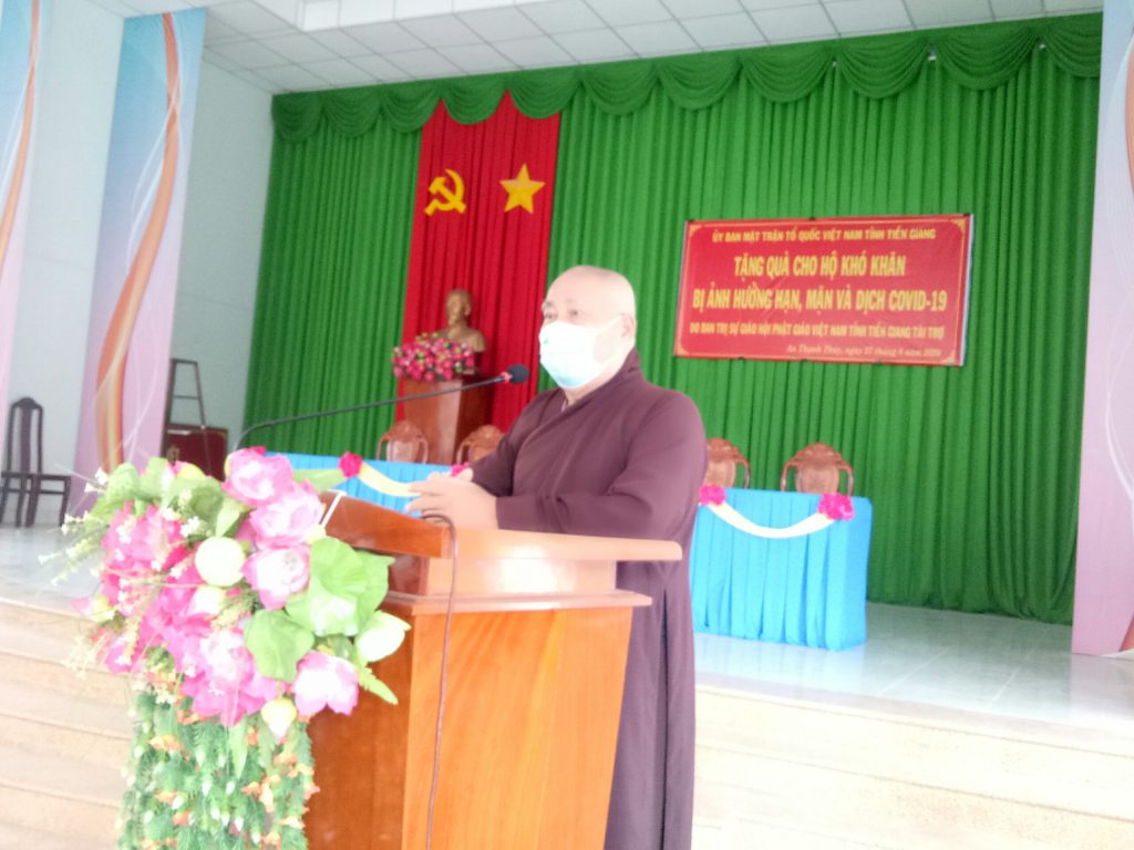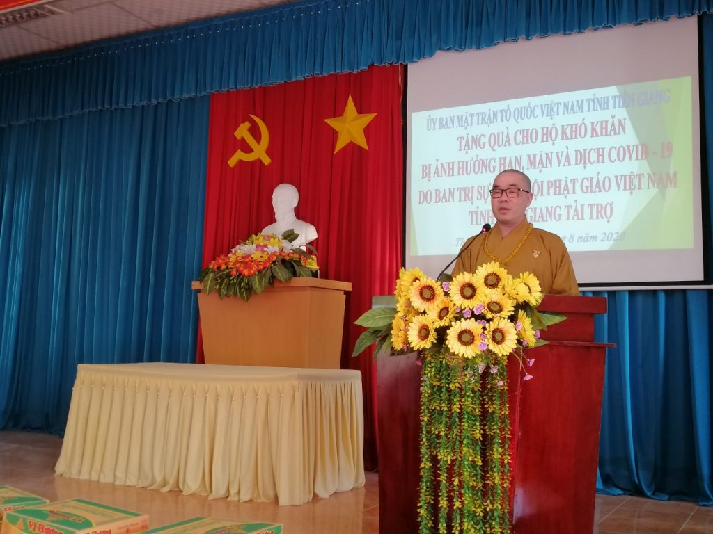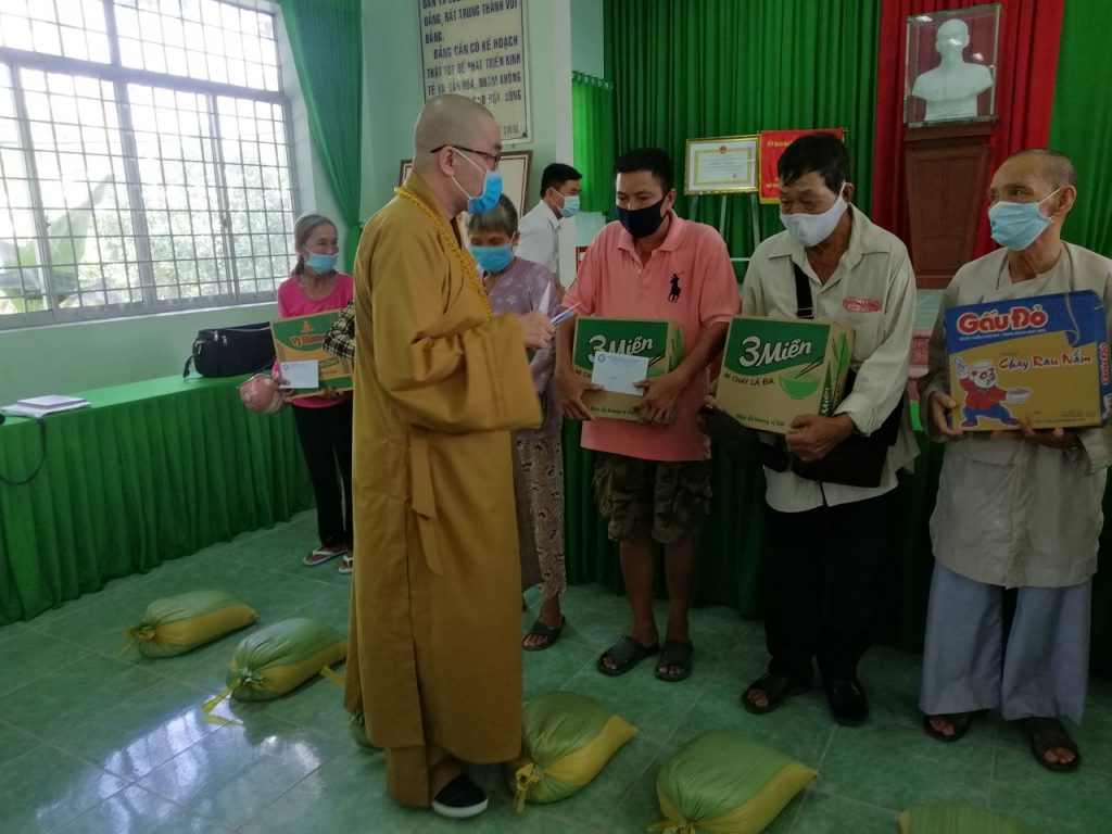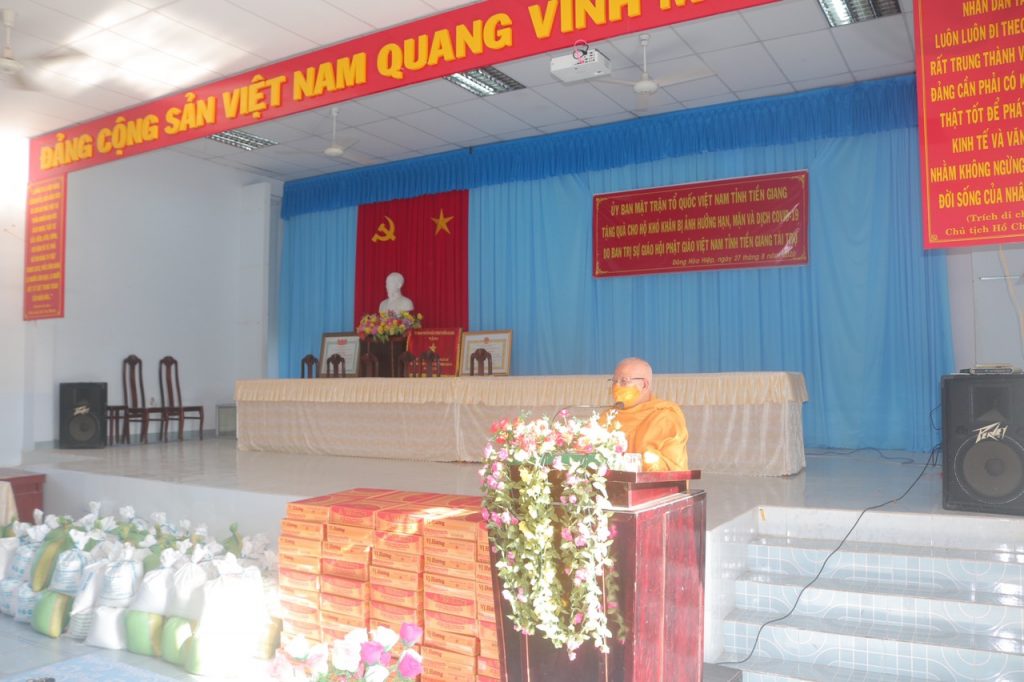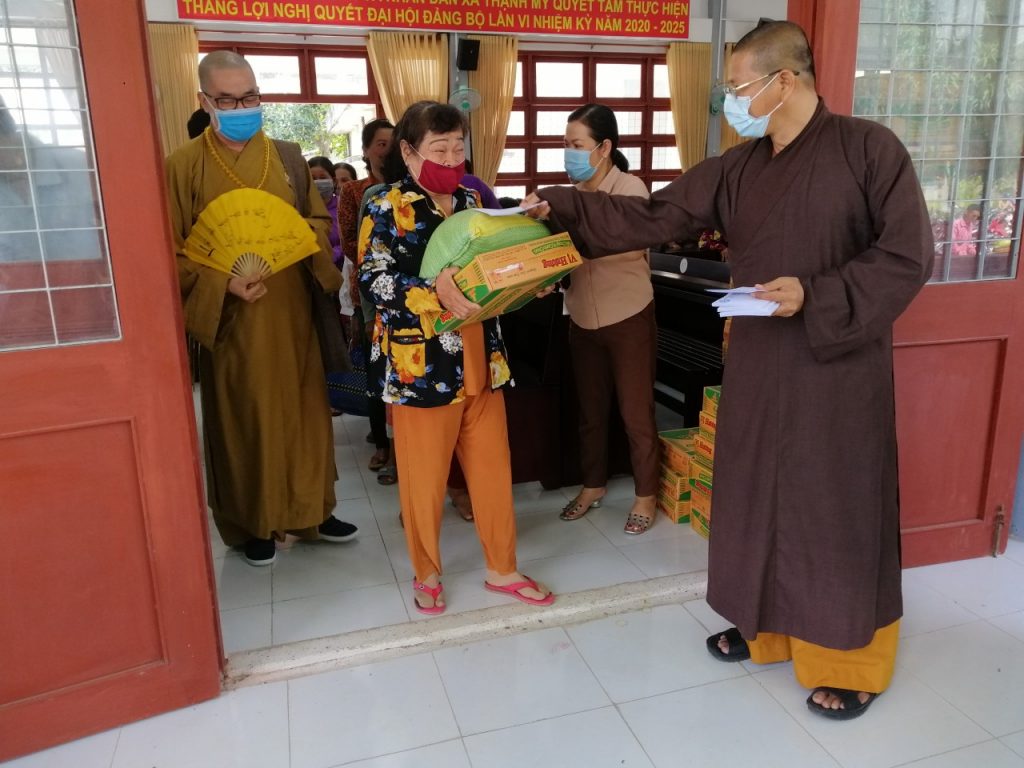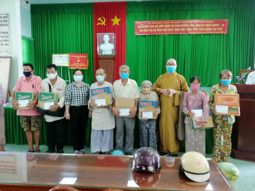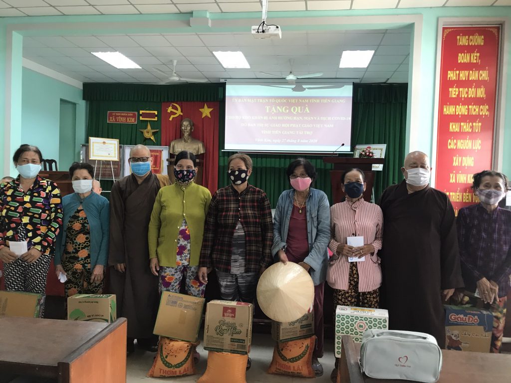 Đại dịch Covid-19 tuy không trực tiếp bùng phát tại tỉnh Tiền Giang, nhưng hậu quả của nó đã để lại rất nhiều khó khăn trong đời sống sinh hoạt cũng như nền kinh tế nói chung, đặc biệt là đối với người dân có thu nhập thấp. Với mong muốn tất cả mọi người đều được bình an vượt qua dịch bệnh và góp phần ổn định xã hội, Thường trực BTS GHPGVN đã phát động chương trình “cùng nhau đẩy lùi dịch bệnh”. Được sự phát tâm của chư Tôn đức Tăng, Ni và Phật tử trong toàn tỉnh, chương trình đã trao tặng 3.000 phần quà gồm: Gạo, mì gói và tiền mặt, tổng trị giá trên 1 tỷ 500 triệu đồng, đến với bà con.