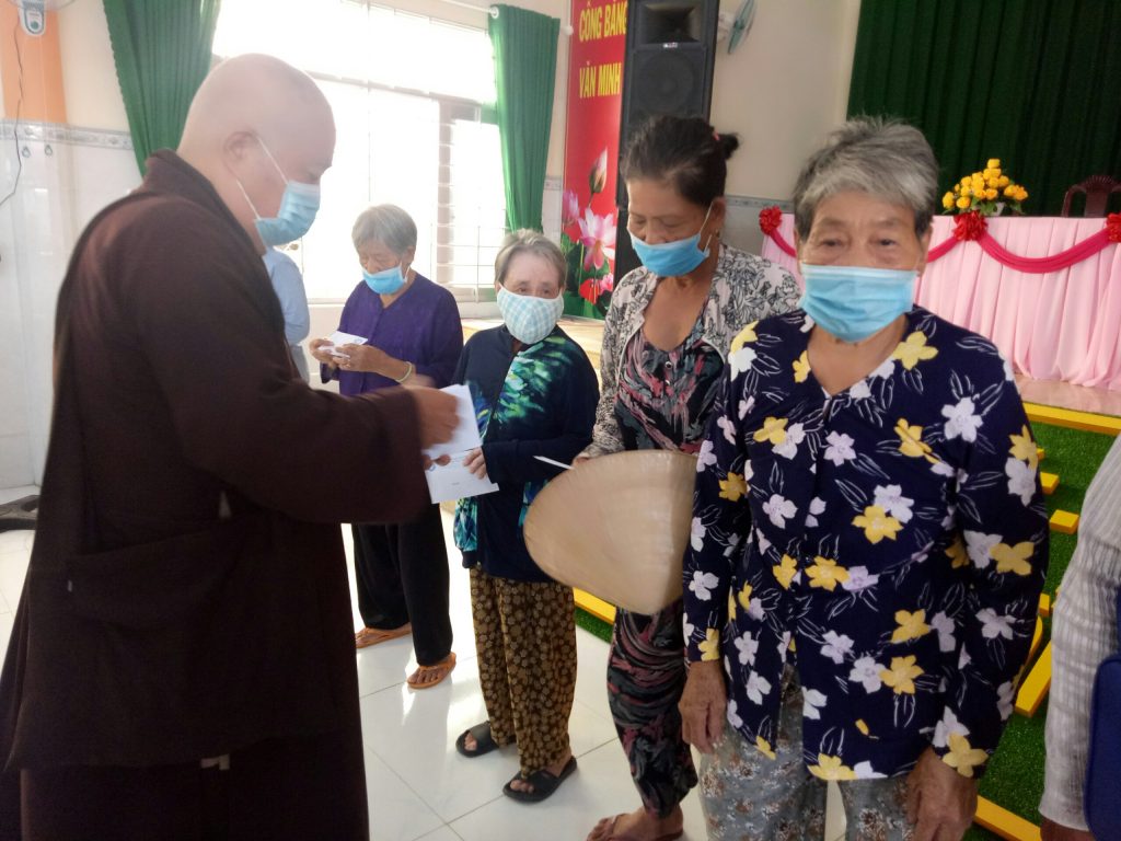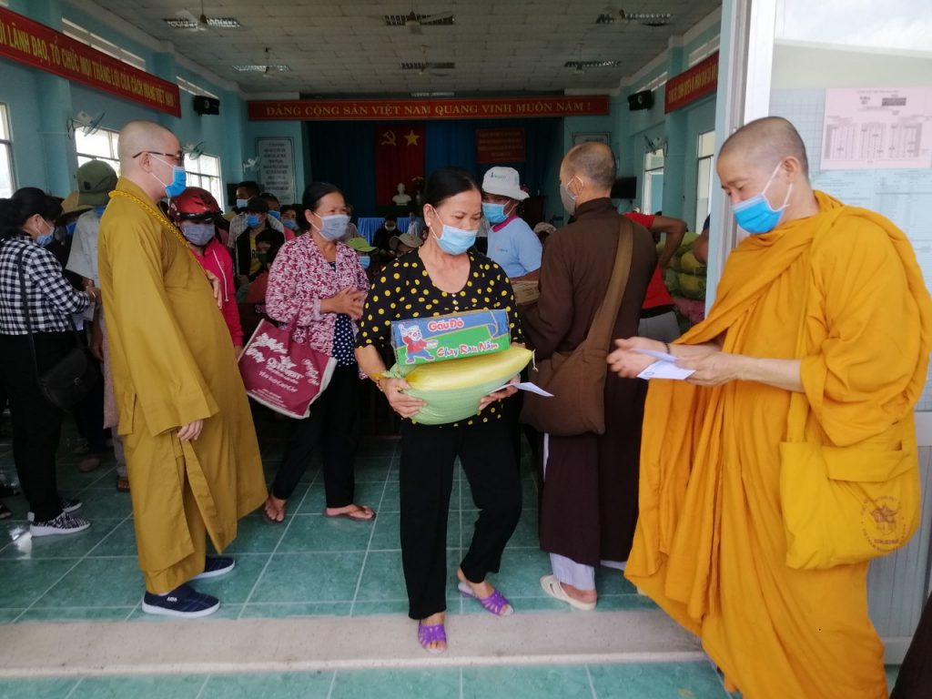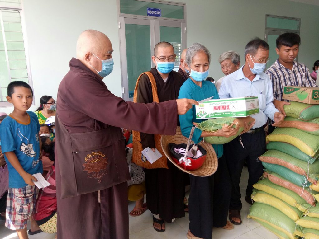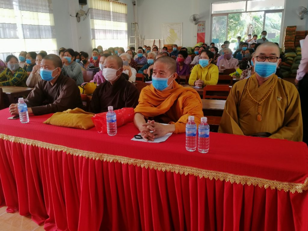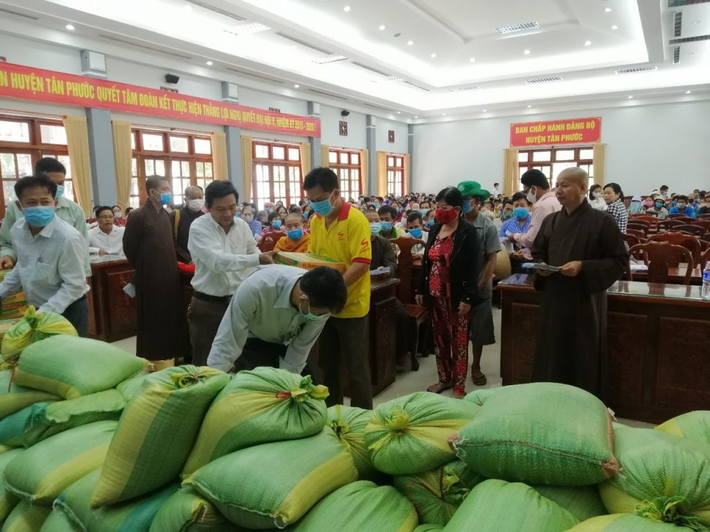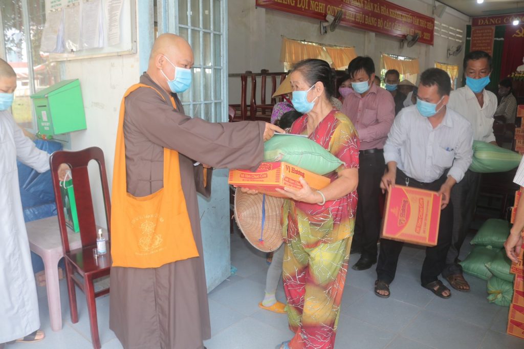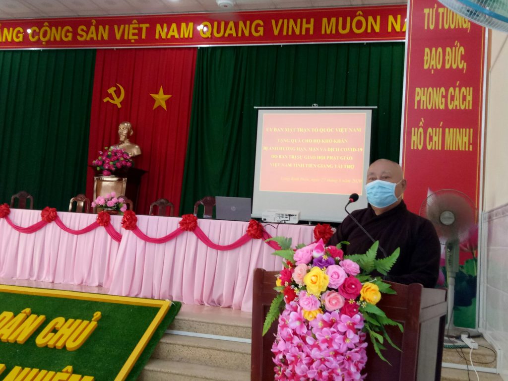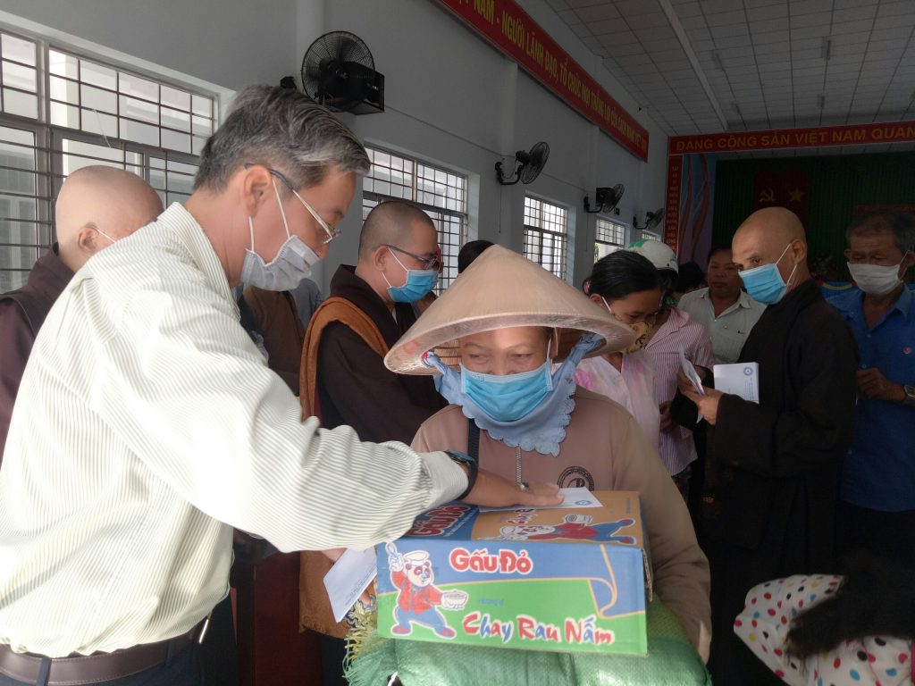 Đại dịch Covid-19 tuy không trực tiếp bùng phát tại tỉnh Tiền Giang, nhưng hậu quả của nó đã để lại rất nhiều khó khăn trong đời sống sinh hoạt cũng như nền kinh tế nói chung, đặc biệt là đối với người dân có thu nhập thấp. Với mong muốn tất cả mọi người đều được bình an vượt qua dịch bệnh và góp phần ổn định xã hội, Thường trực BTS GHPGVN đã phát động chương trình “cùng nhau đẩy lùi dịch bệnh”. Được sự phát tâm của chư Tôn đức Tăng, Ni và Phật tử trong toàn tỉnh, chương trình đã trao tặng 3.000 phần quà gồm: Gạo, mì gói và tiền mặt, tổng trị giá trên 1 tỷ 500 triệu đồng, đến với bà con.