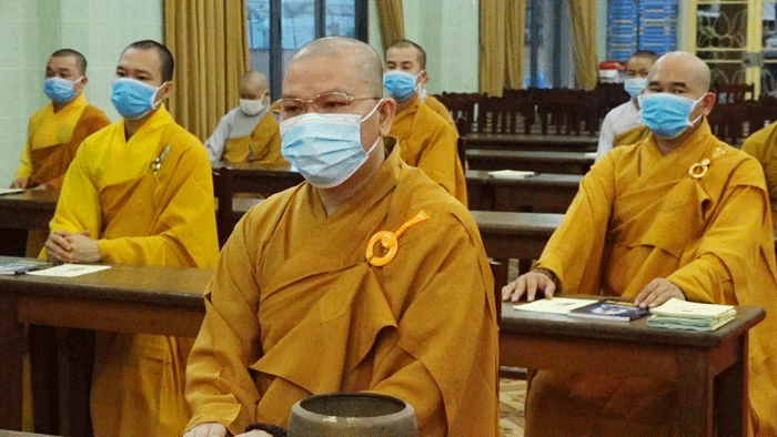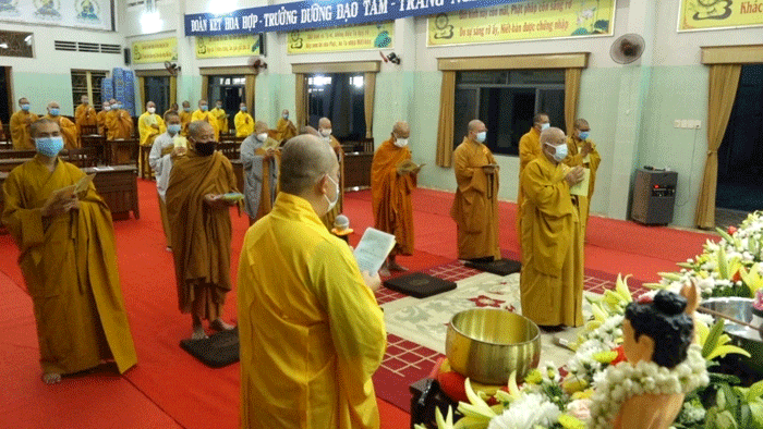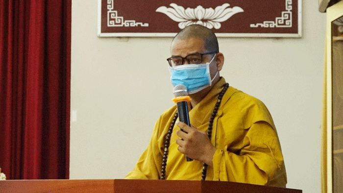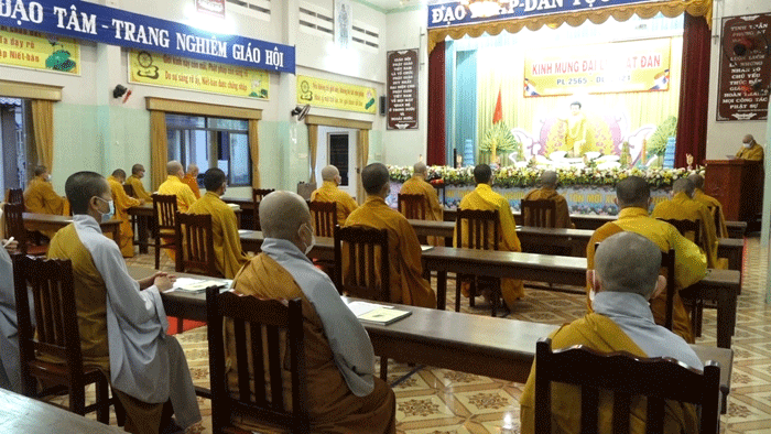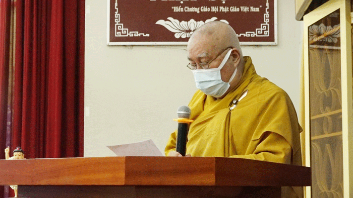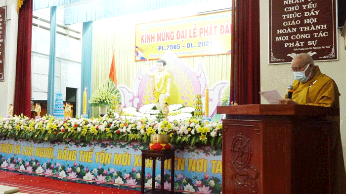 Trước lễ đài uy nghiêm, sau phần tuyên bố lý do của Đại đức Thích Huệ Phát – Chánh Thư ký BTS GHPGVN tỉnh; Hòa thượng Thích Huệ Minh đã có lời phát biểu Khai mạc: Phật đản là sự kiện thiêng liêng và trọng đại của Phật giáo, dù ở bất cứ nơi đâu, trong tình huống gì thì người con Phật cũng phải dành tấm lòng thuần tịnh, thành kính hướng về đấng Thế Tôn. Năm nay do ảnh hưởng của dịch bệnh nên chúng ta không tổ chức đại lễ đông đảo như mọi năm, thay vào đó Tăng Ni và Phật tử nỗ lực làm nhiều công tác từ thiện, an sinh xã hội, giúp đồng bào đang gặp khó khăn,… thực hiện lời Phật dạy đem lòng Từ bi, cứu khổ ban vui đến với cuộc đời. Sau buổi khai mạc hôm nay, suốt trong tuần lễ Phật đản này chúng ta phải luôn giữ tâm thanh tịnh, trú dạ lục thời tinh tấn trì tụng kinh Dược Sư hồi hướng cầu nguyện cho thế giới luôn hòa bình, đại dịch sớm kết thúc để mọi người được an lạc, xã hội ổn định, đất nước phồn vinh.