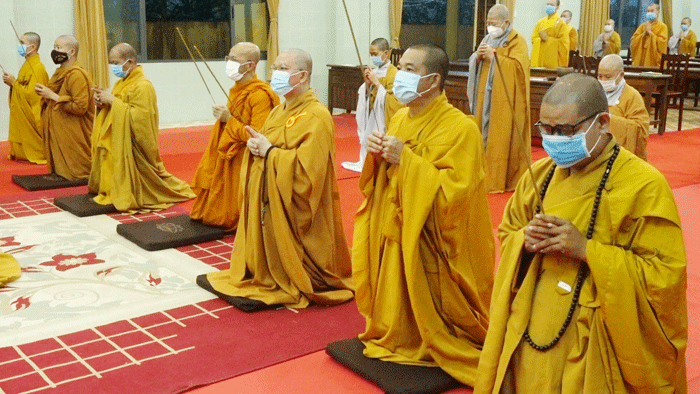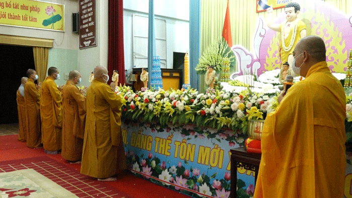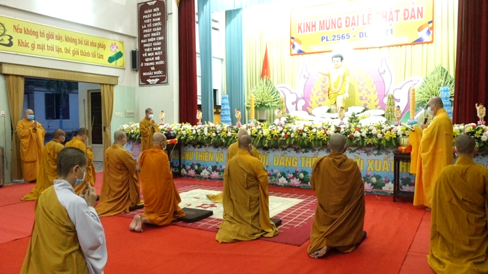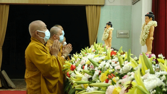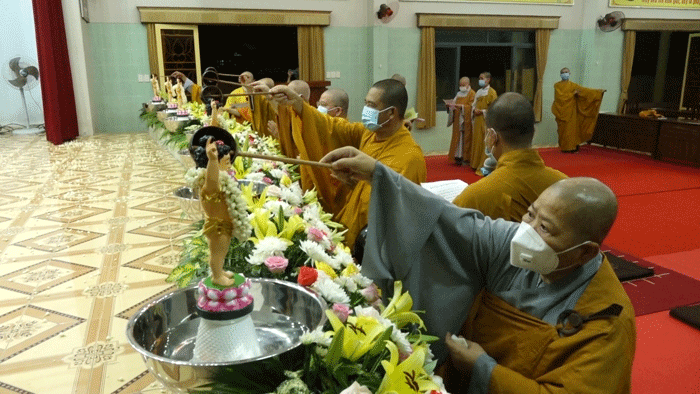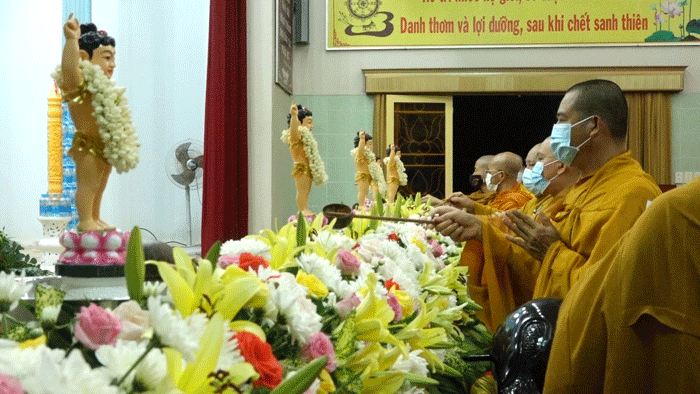 Sau lời phát biểu khai mạc của Hòa thượng Thích Huệ Minh, chư Tôn đức trang nghiêm trước Tôn tượng Phật Thích Ca sơ sinh niêm hương cúng dường, tụng kinh Khánh Đản, kinh Chuyển Pháp Luân và thực hiện nghi thức Tắm Phật, Hồi hướng cầu nguyện thế giới hòa bình, Phật pháp xương minh, chúng sinh an lạc.