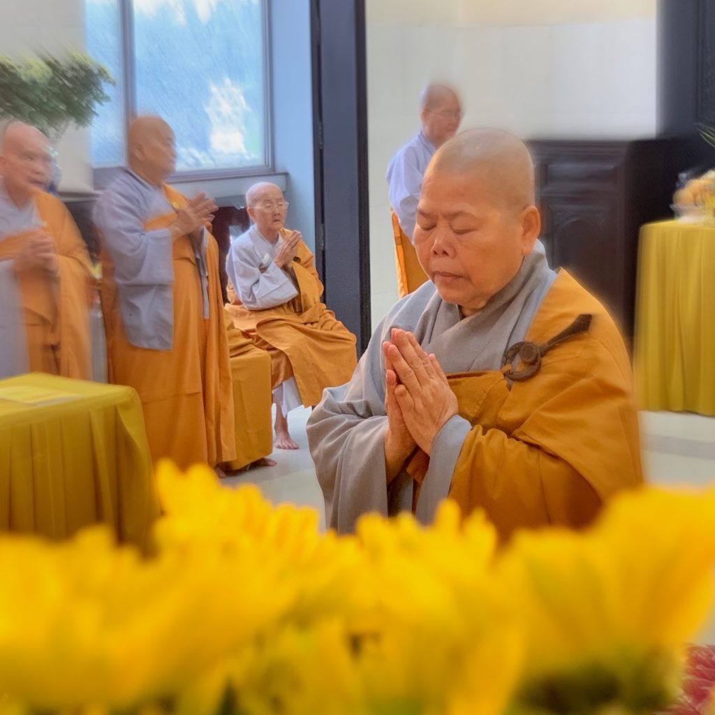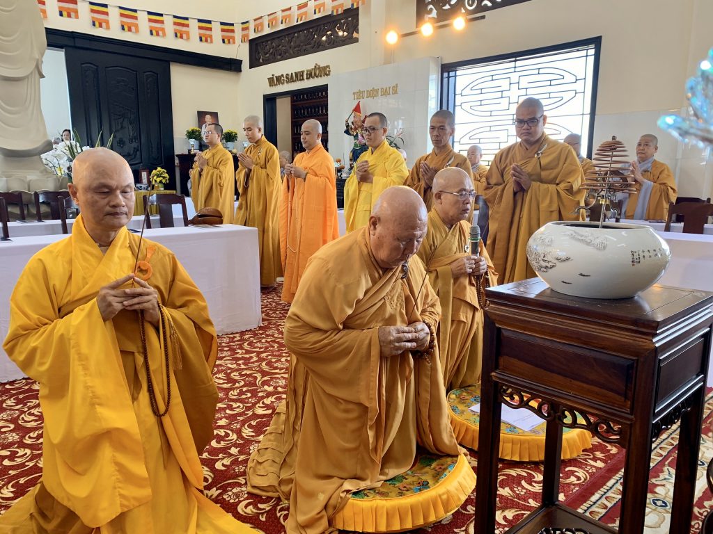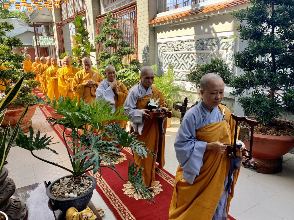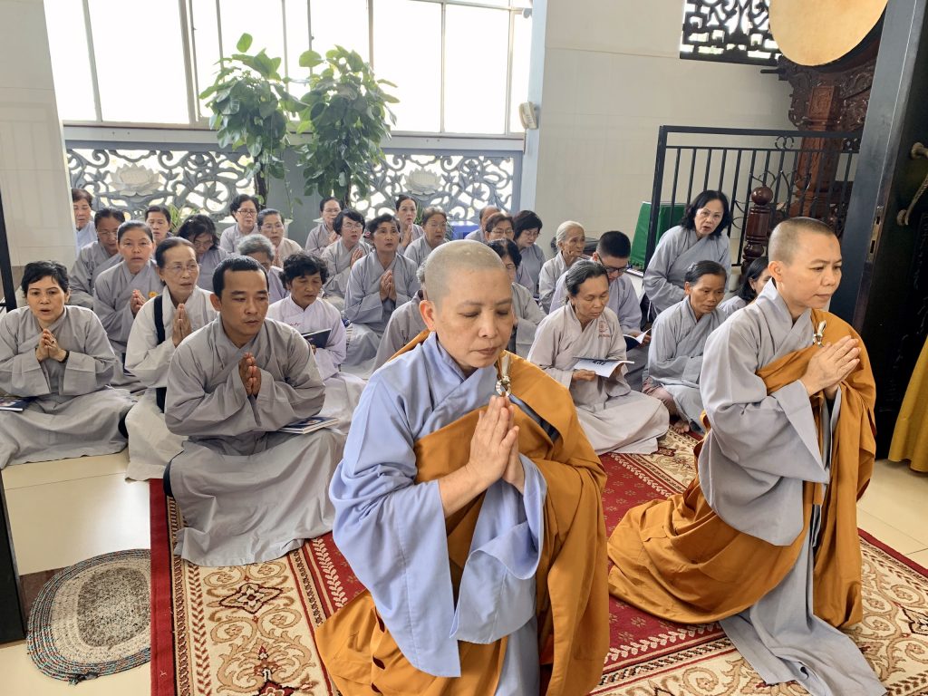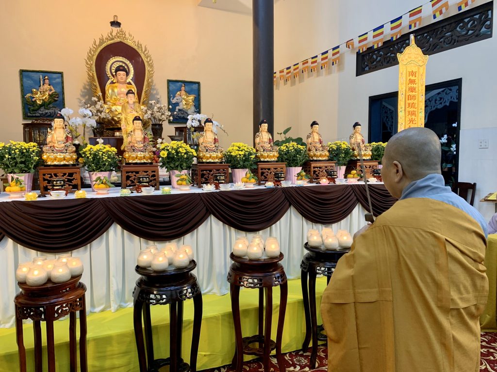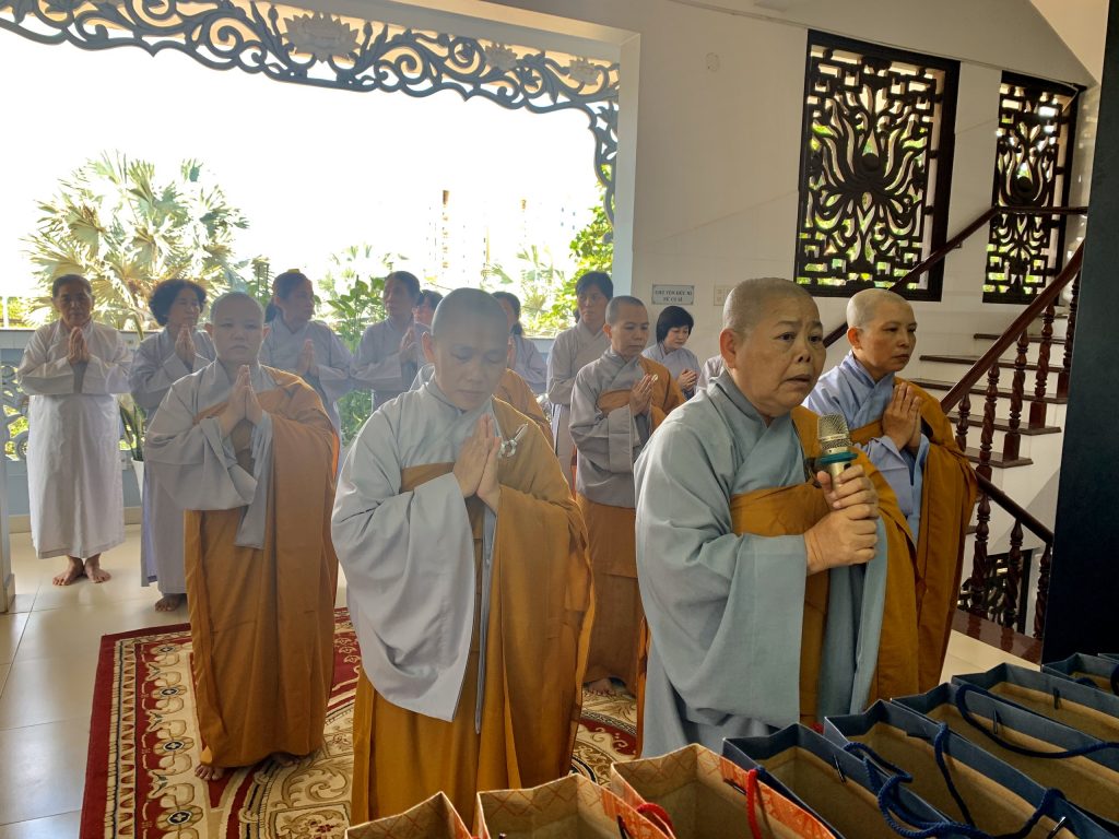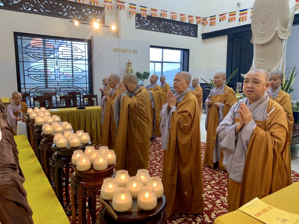 Bắt đầu buổi lễ, Ni chúng tại đạo tràng trang nghiêm cung thỉnh chư Tôn đức đăng lâm Phật điện niêm hương bạch Phật, đảnh lễ Tam bảo. Sau đó toàn thể hội chúng đồng hòa âm tụng kinh Dược Sư để huân tập công đức hồi hướng sở cầu như nguyện.