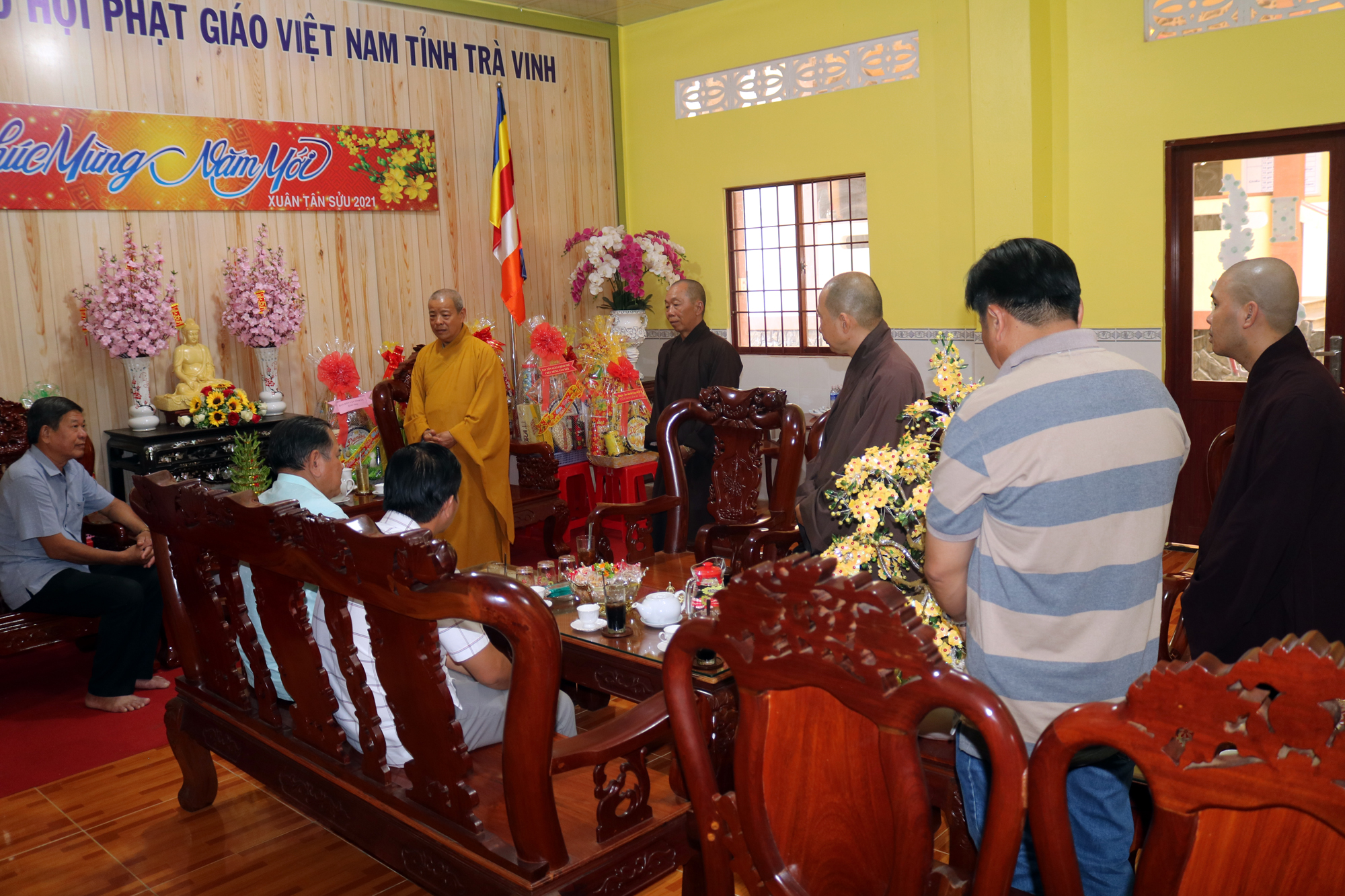 Tiếp đoàn có HT.Thạch Sok Xane – Phó Chủ tịch HĐTS, Phó ban Tăng sự TƯ GHPGVN, Trưởng BTS GHPGVN tỉnh Trà Vinh; HT.Thích Trí Minh – Ủy viên HĐTS, Phó trưởng Ban Thường trực BTS GHPGVN tỉnh; HT.Thích Huệ Pháp – Phó trưởng BTS kiêm Trưởng ban Tăng sự GHPGVN tỉnh; HT.Kim Thone - UV HĐTS, Phó BTS GHPGVN tỉnh; ĐĐ.Thích Tâm Khiết – Chánh Thư ký BTS GHPGVN tỉnh; ĐĐ.Thích Huệ Thắng – Trưởng ban Kiểm soát BTS GHPGVN tỉnh; ĐĐ.Thích Trí An - Trưởng ban Văn hóa Phật giáo tỉnh.
