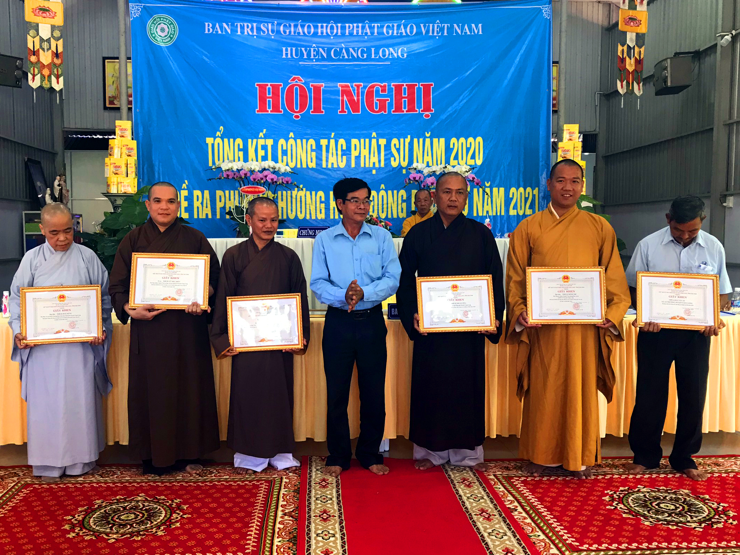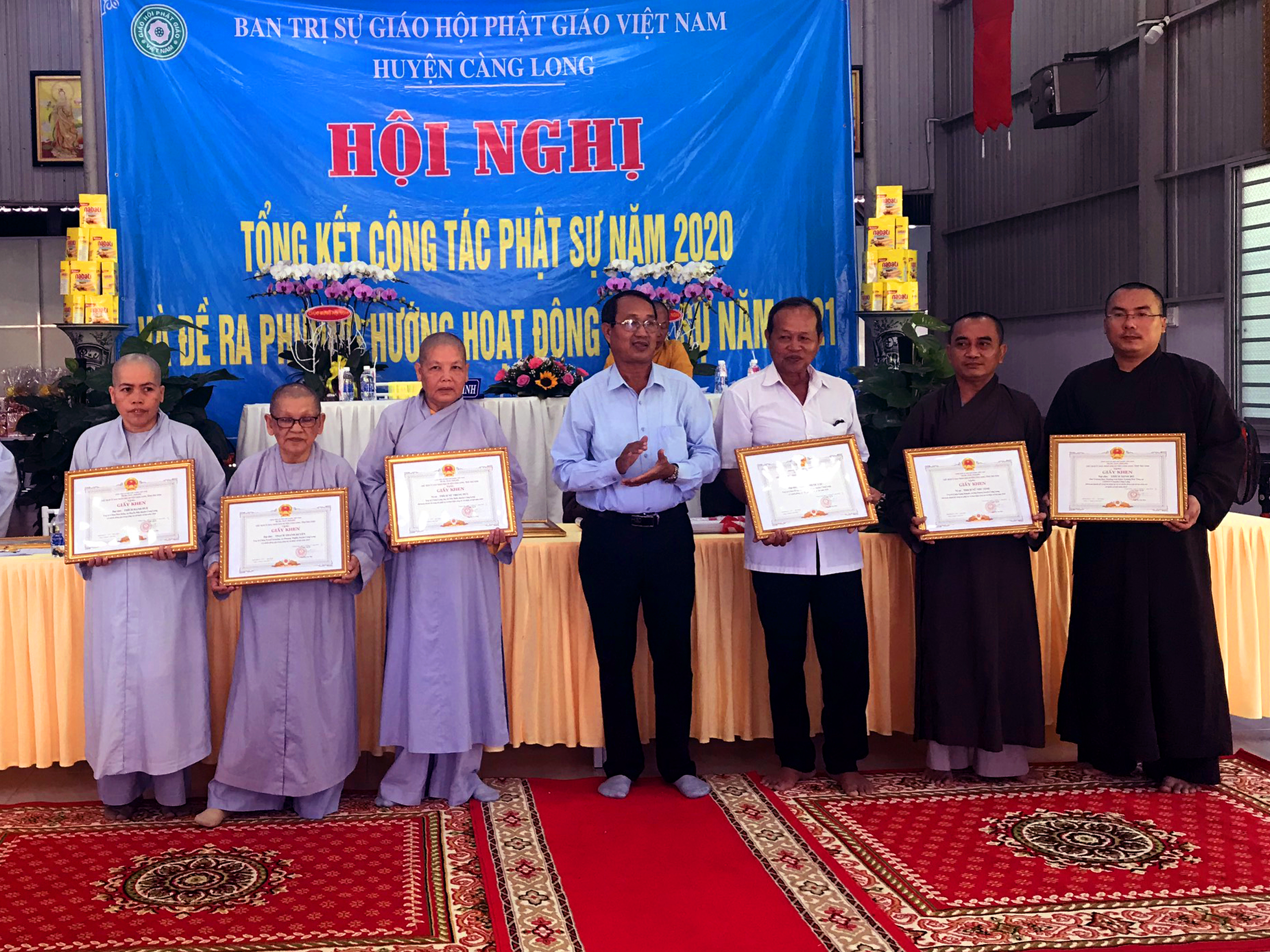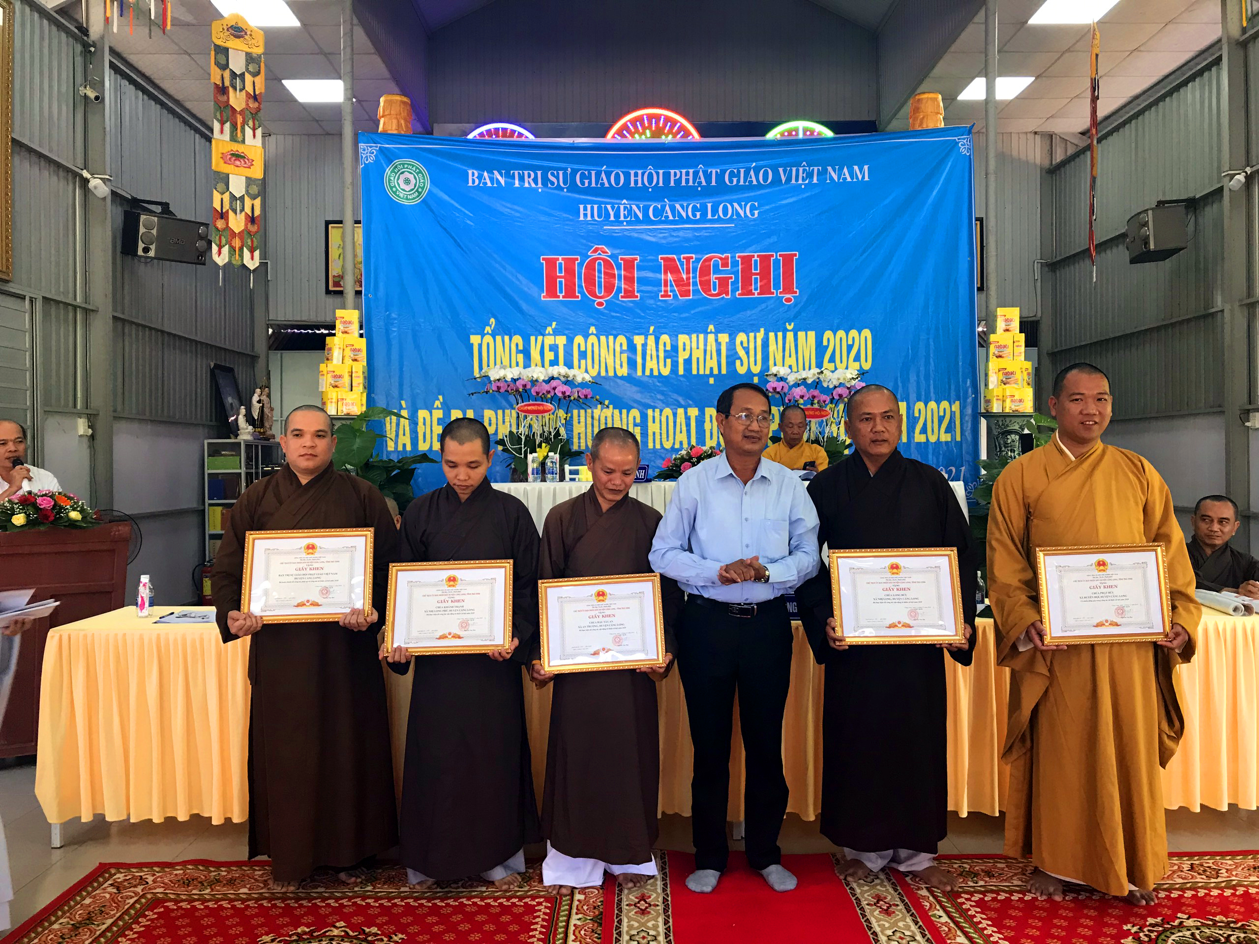 Đại diện UBND huyện, ông Nguyễn Văn Lâm đã thông qua Quyết định của Chủ tịch UBND huyện tặng Giấy khen cho 5 tập thể và 12 cá nhân đã hoàn thành công tác Phật sự và có nhiều đóng góp trong công tác từ thiện năm 2020.