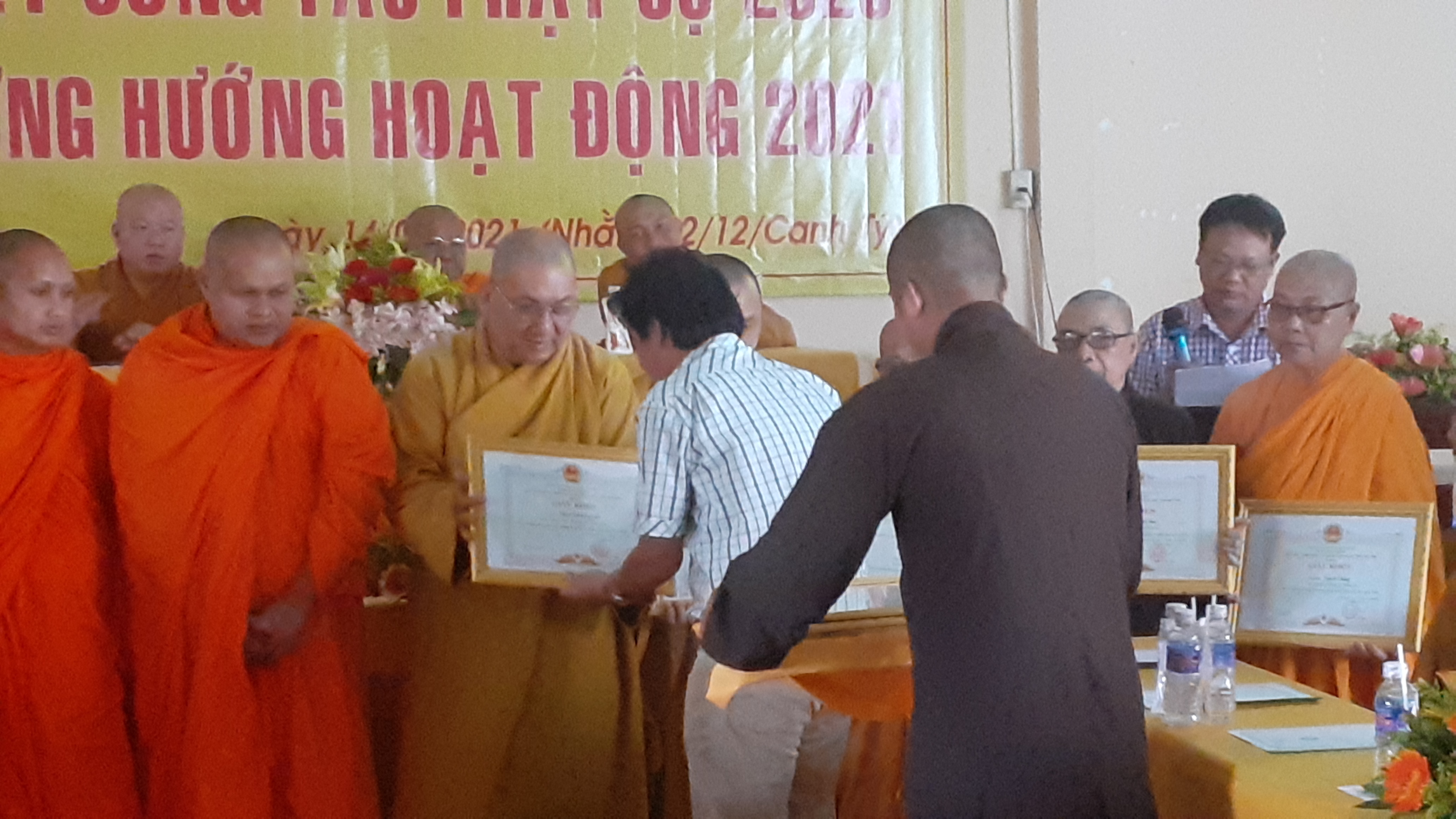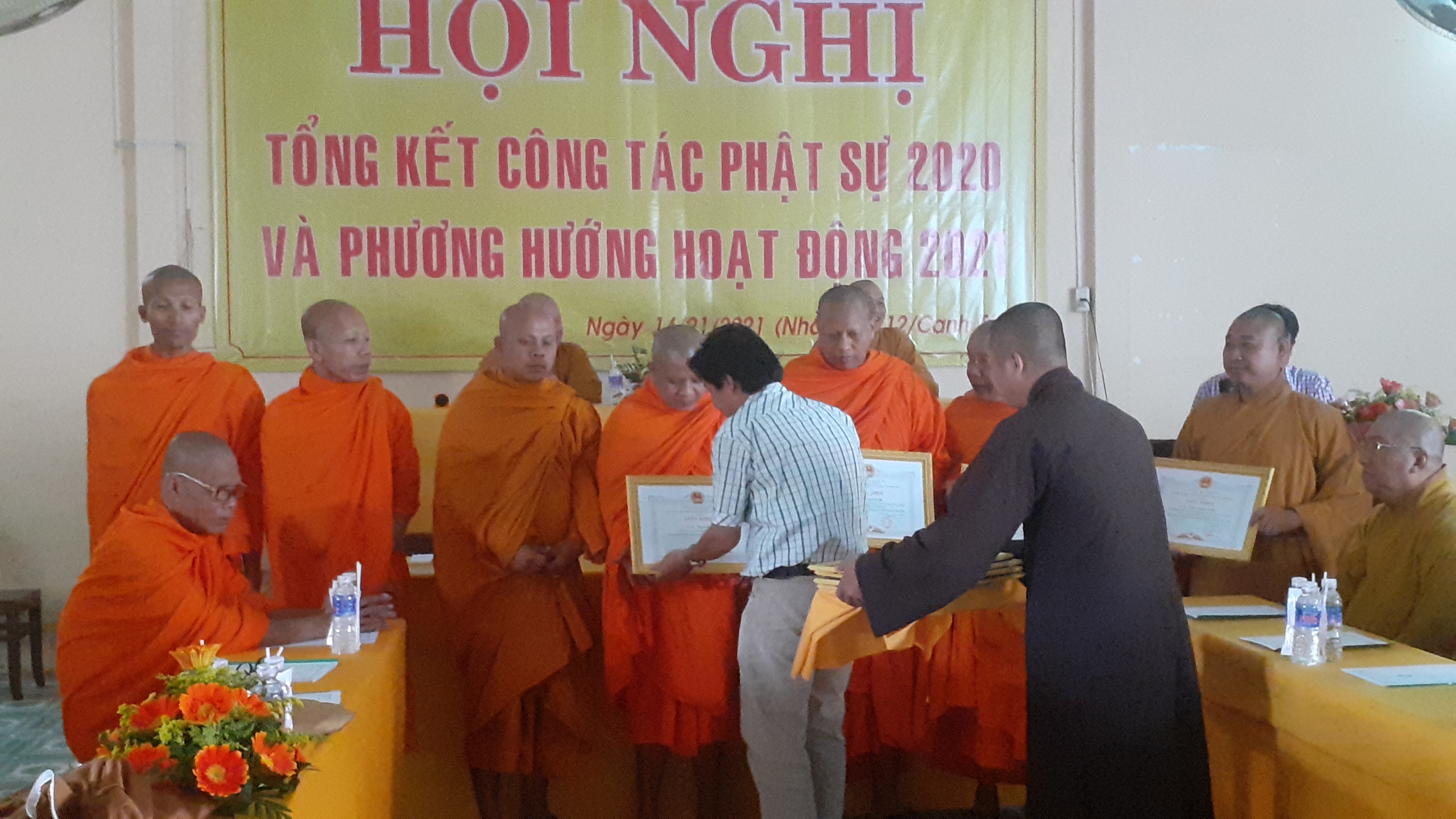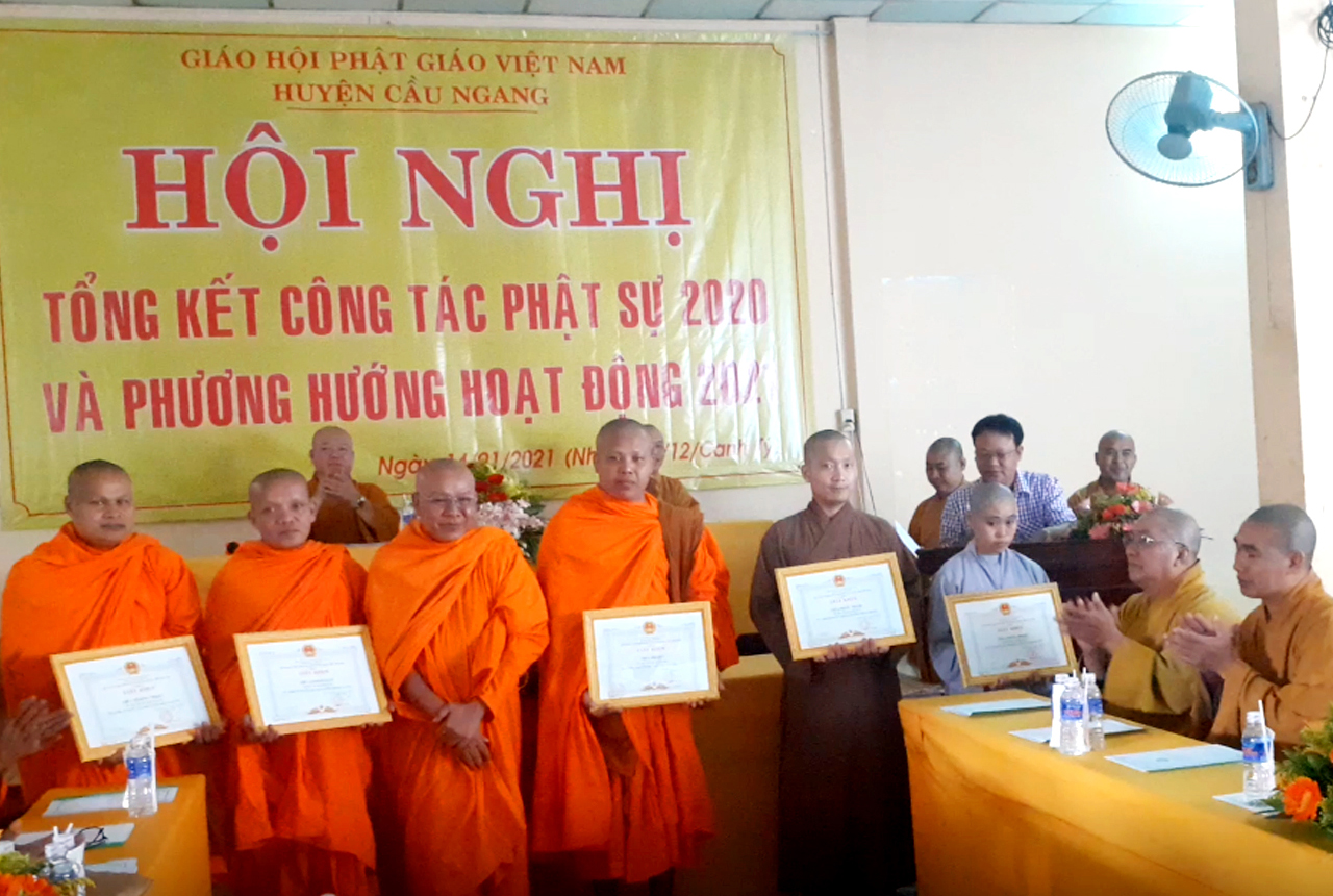 Trước những thành tích đó, Chủ tịch UBND huyện Cầu Ngang đã có Giấy khen và Thường trực BTS GHPGVN tỉnh có Bằng Tuyên dương công đức trao tặng đến cá nhân và tập thể ưu tú. Ông Nguyễn Hữu Trí đại diện cho UBND huyện trao tặng giấy khen đến từng tập thể và cá nhân.