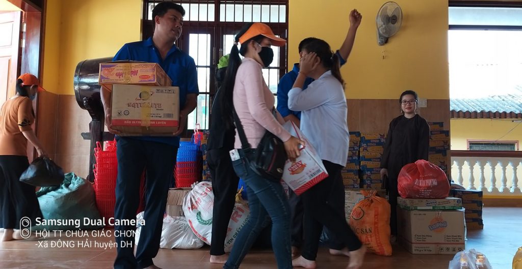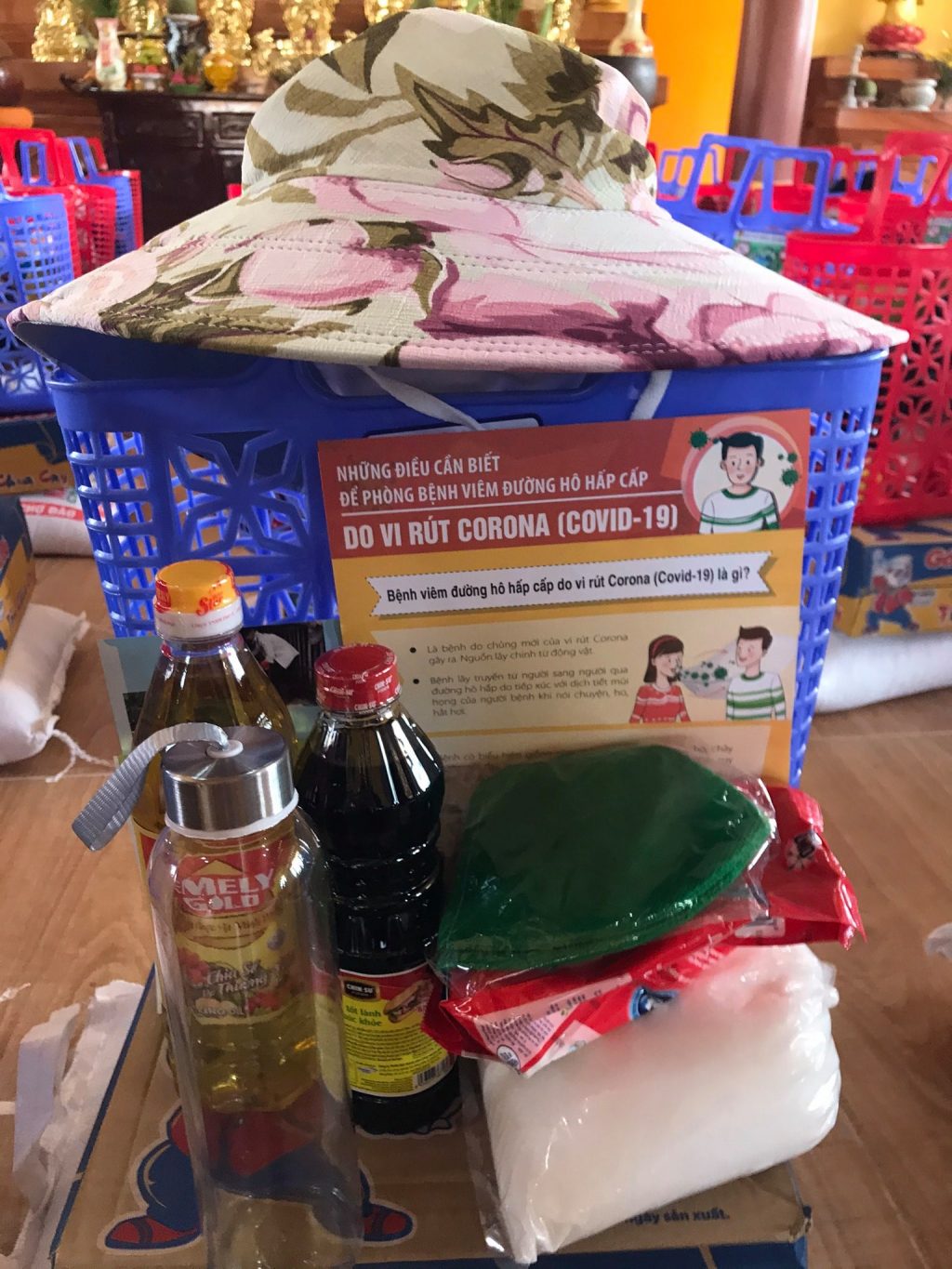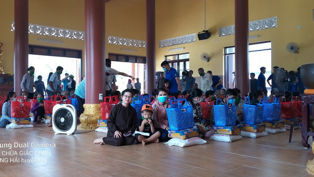 Sau khi bàn giao nhà xong, các thành viên trong đoàn trở về chùa Long Thành để sắp xếp 100 phần quà trao tặng đến bà con nghèo, hỗ trợ bà con an tâm phòng chống dịch bệnh Covid-19. Mỗi phần quà trị giá 300 ngàn đồng, bao gồm: 10kg gạo, 01 thùng mì, giỏ xách nhựa và một số nhu yếu phẩm khác. Xã đoàn Lưu Nghiệp Anh cũng hỗ trợ chai thuỷ tinh tặng cho bà con.