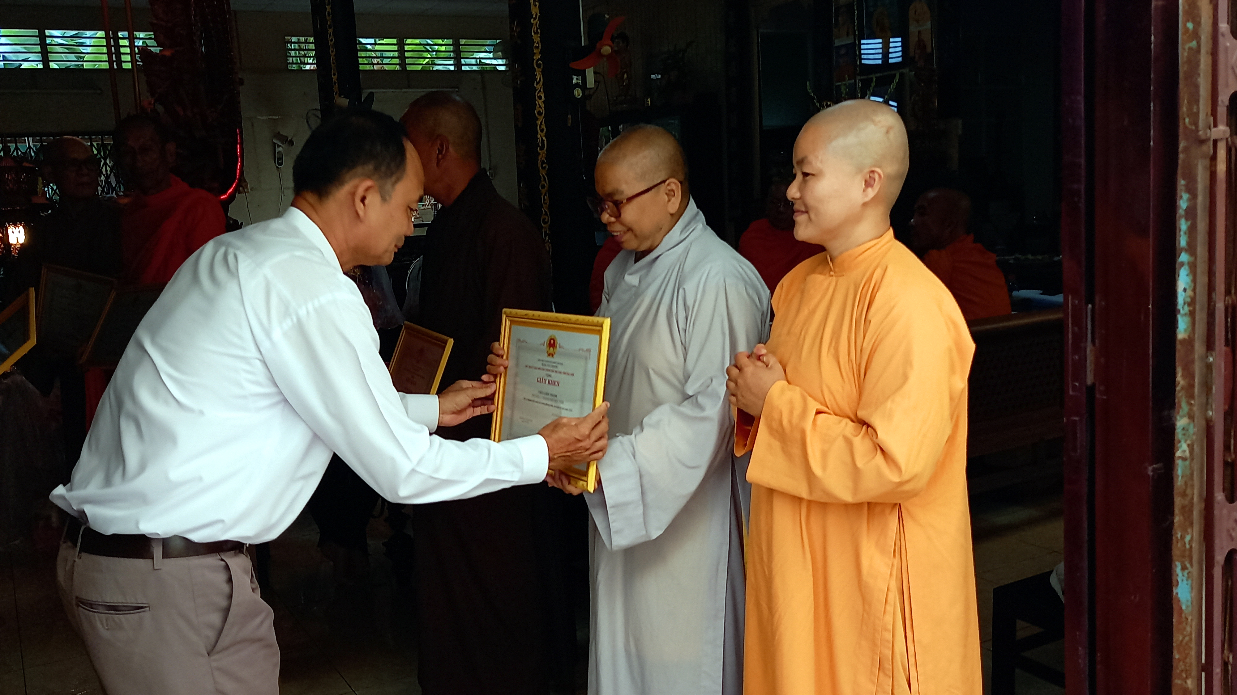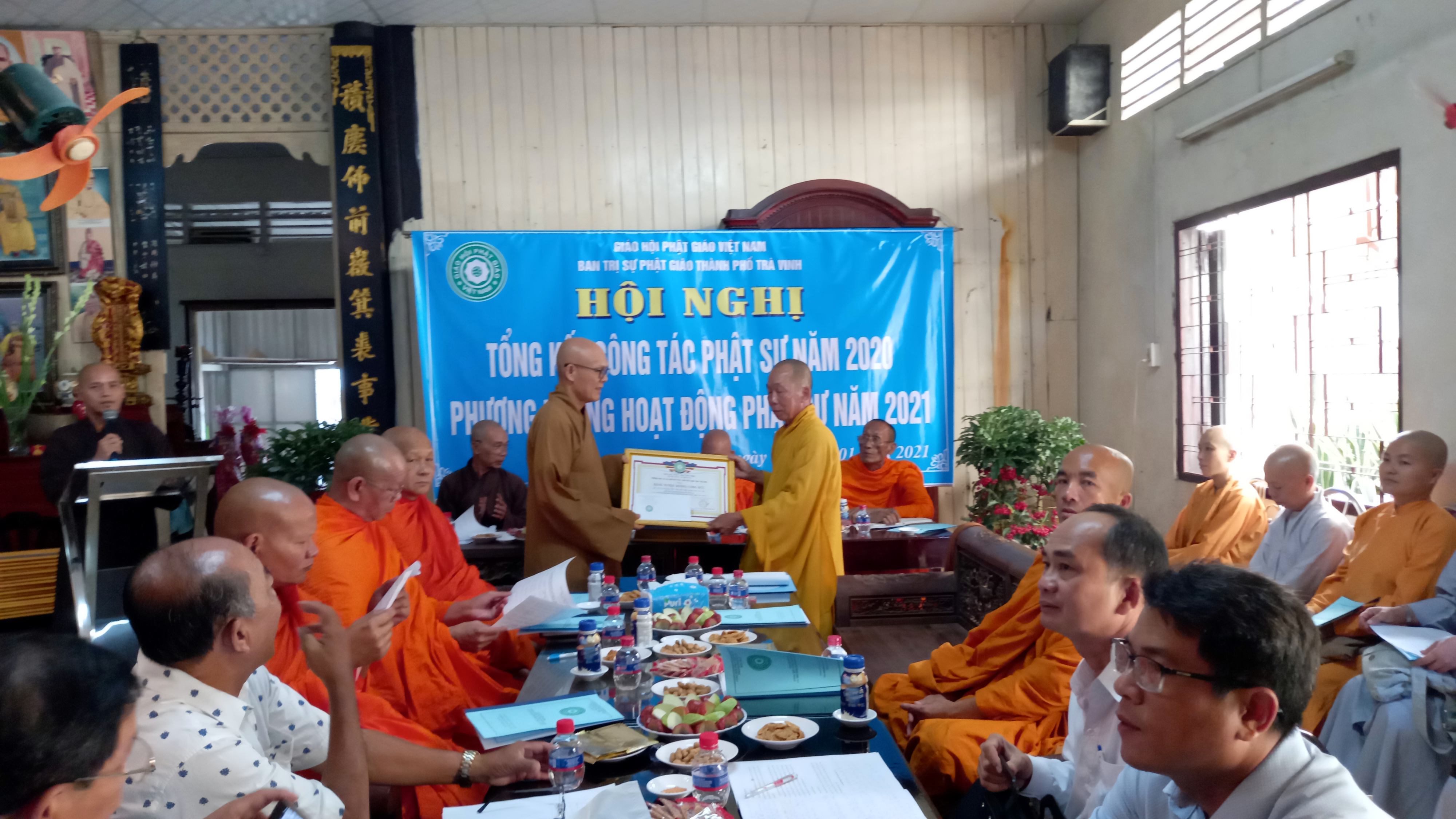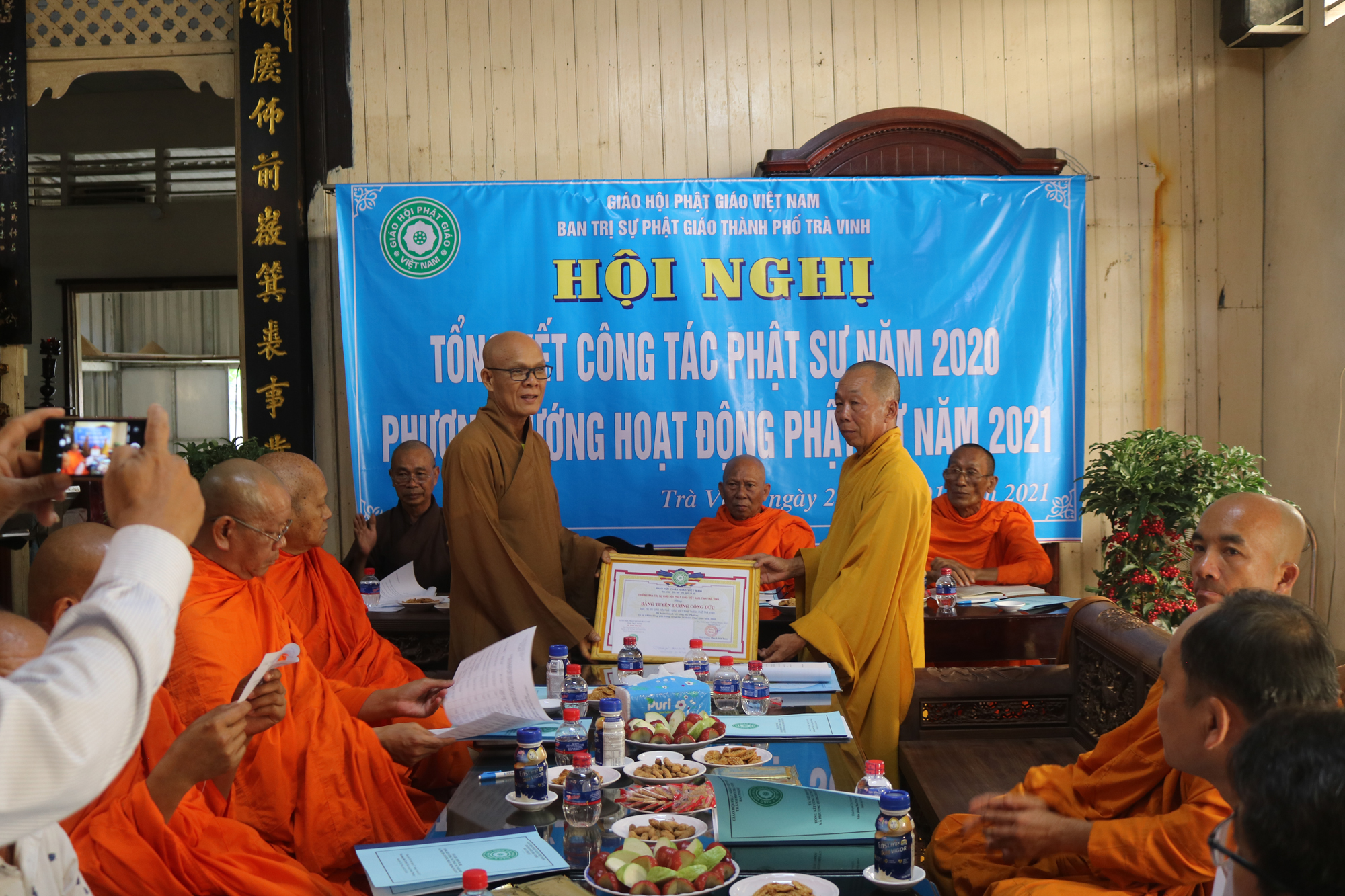 ĐĐ.Thích Minh Hải đã thông qua Quyết định tuyên dương công đức của BTS GHPGVN tỉnh cho các cá nhân và tập thể đã nỗ lực giúp cho Phật giáo tỉnh nhà. Ngoài ra, ông Lâm Tiên cũng tuyên đọc Quyết định khen thưởng của Chủ tịch UBND TP.Trà Vinh đến tập thể và cá nhân chư Tôn đức đã có thành tích xuất sắc trong năm 2020. Ông Quách Văn Tám và ông Kim Sóc đại diện chính quyền trao tặng Bằng khen và tiền mặt đến cá nhân chư Tôn đức.