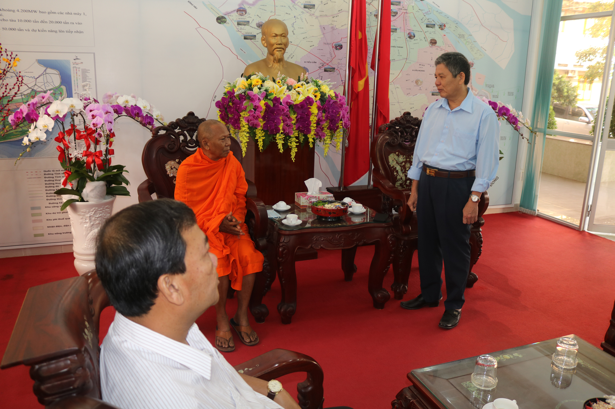 Đại diện các cơ quan tiếp đoàn có ông Ngô Chí Cường – Ủy viên Ban chấp hành Trung ương Đảng, Bí thư Tỉnh ủy Trà Vinh, Trưởng đoàn Đại biểu QH khoá XIV đơn vị tỉnh Trà Vinh; ông Kim Ngọc Thái - Phó Bí thư Tỉnh ủy, Chủ tịch HĐND tỉnh; ông Đoàn Tiết Cường - Phó Chủ tịch UB MTTQVN tỉnh; ông nguyễn Quỳnh Thiện – Tỉnh uỷ viên, Phó Chủ tịch UBND tỉnh; ông Lê Văn Tịnh – Trưởng ban Ban Tôn giáo tỉnh; bà Bùi Thị Nhã Hiền – Phó trưởng ban Ban Tôn giáo tỉnh; ông Đinh Công My – Phó trưởng Ban Văn hoá Xã hội HĐND; ông Trần Văn Dài – Phó trưởng Ban Pháp chế HĐND tỉnh; bà Thạch Thị Ngọc Mai – Phó trưởng Ban Dân vận tỉnh; ông Hồ Hoàng Phương – Trưởng Phòng DVCQNN, Dân tộc & Tôn giáo; ông Kiên Ngọc Khánh, ông Lý Thế Kiệt – đồng Phó trưởng Phòng DVCQNN, Dân vận & Tôn giáo; Đại tá Lê Văn Tư – Phó Giám đốc Công an tỉnh Trà Vinh.