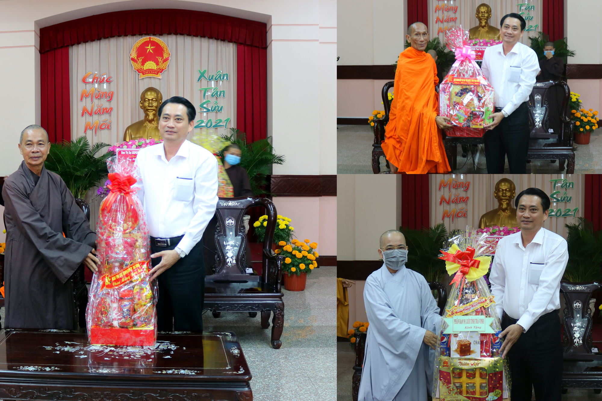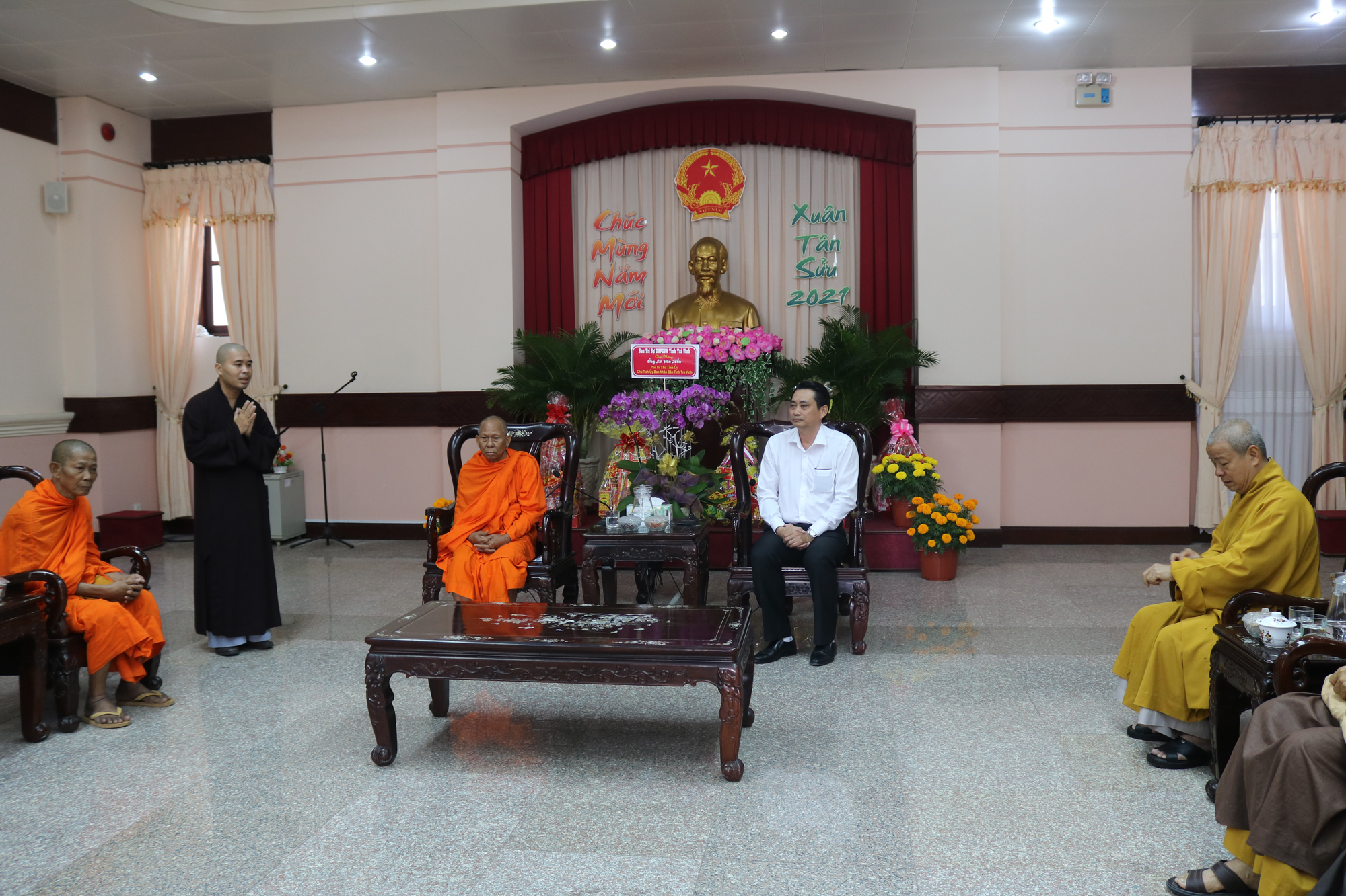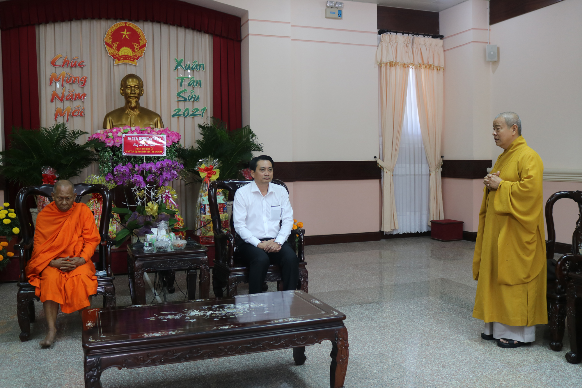 PSO - Nhân dịp Tết Tân Sửu 2021 sắp đến, ngày 04/02/2021 (nhằm 23 tháng Chạp năm Canh Tý), Thường trực BTS GHPGVN tỉnh Trà Vinh do HT.Thạch Sox Xane – Phó chủ tịch HĐTS, Trưởng BTS GHPGVN tỉnh Trà Vinh làm Trưởng đoàn; HT.Thích Trí Minh – UV HĐTS, Phó trưởng Ban thường trực BTS GHPGVN tỉnh Trà Vinh làm Phó đoàn đã tổ chức thăm, chúc Tết đến các cấp lãnh đạo Tỉnh ủy, UB MTTQVN tỉnh, UBND, Ban Tôn giáo, HĐND, Ban Dân vận, Công an tỉnh.