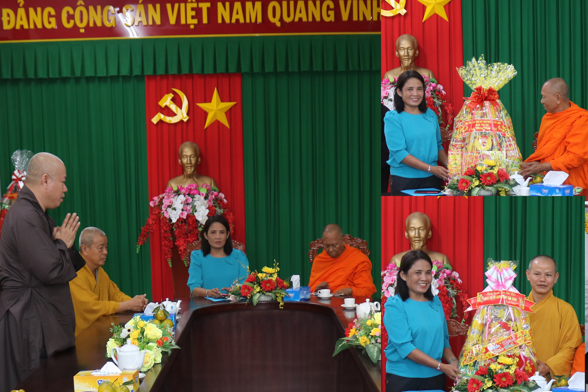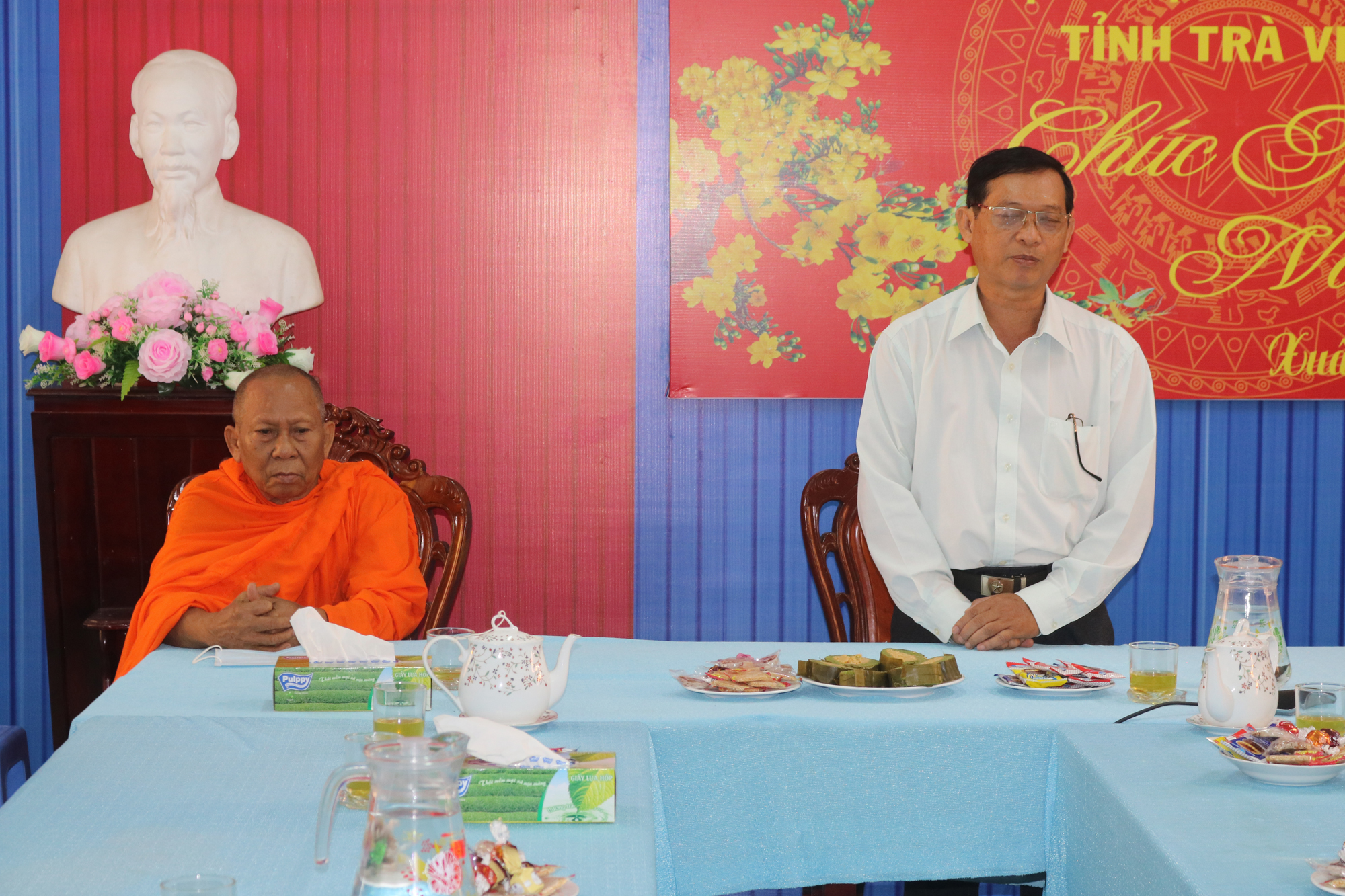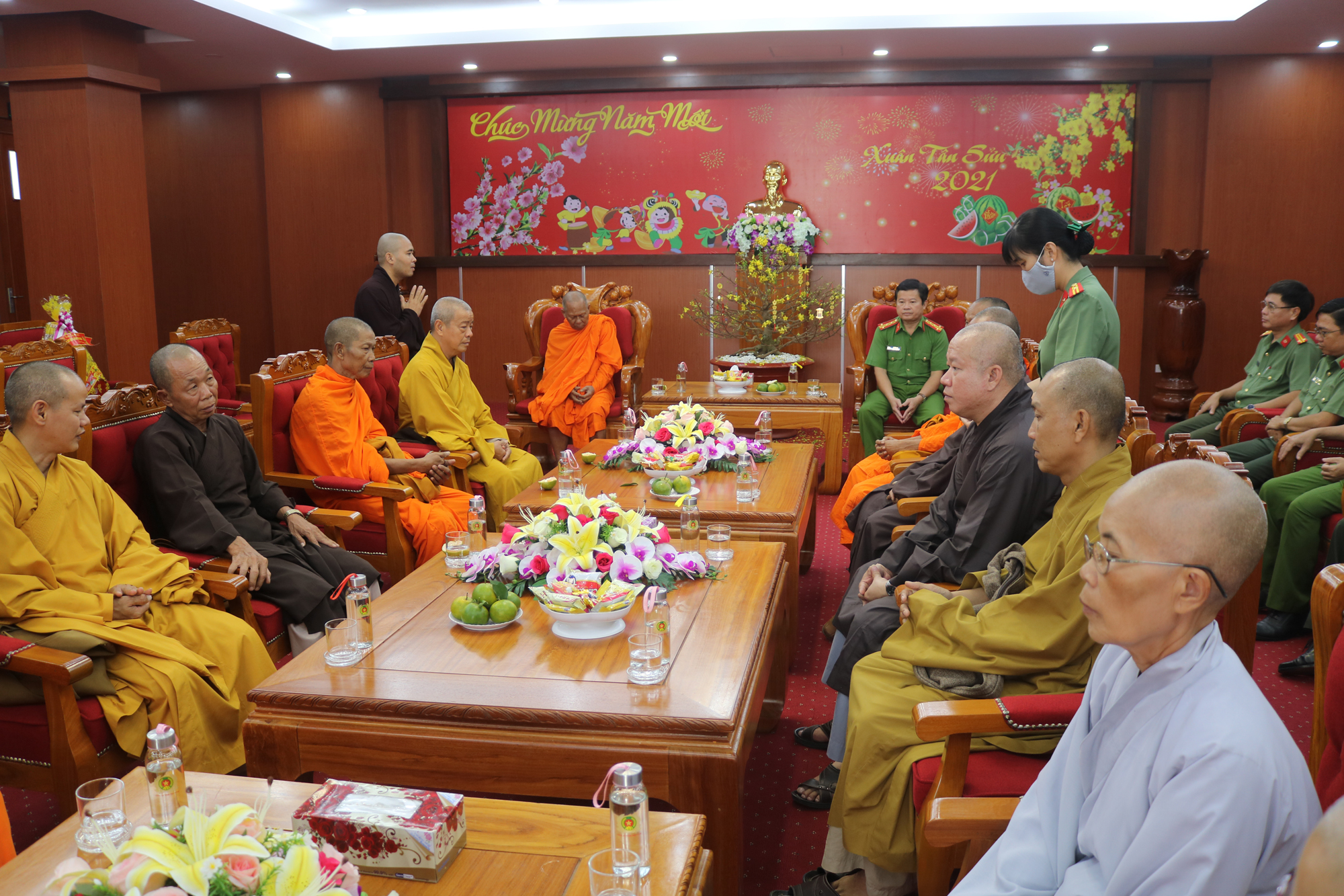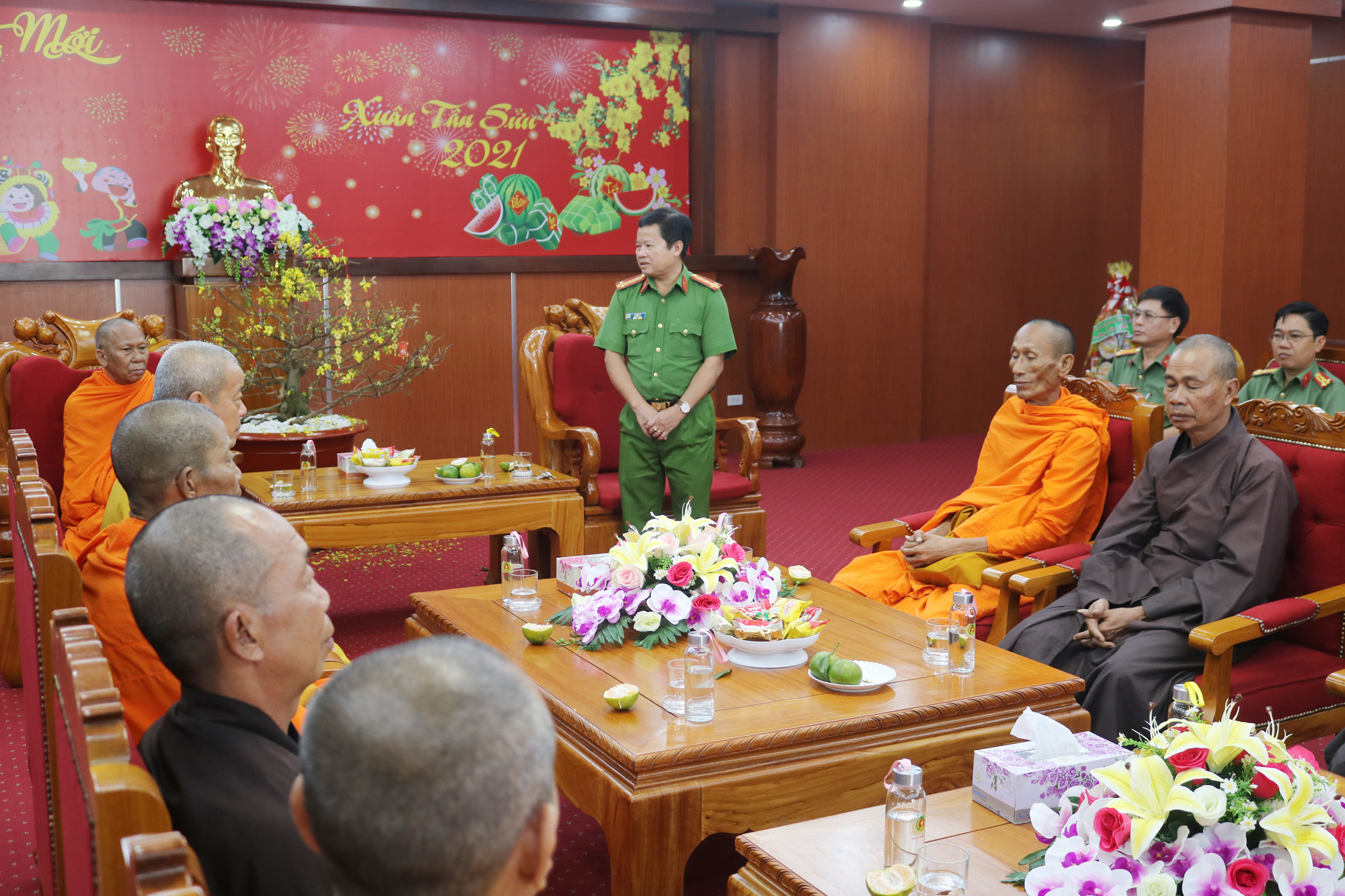 PSO - Nhân dịp Tết Tân Sửu 2021 sắp đến, ngày 04/02/2021 (nhằm 23 tháng Chạp năm Canh Tý), Thường trực BTS GHPGVN tỉnh Trà Vinh do HT.Thạch Sox Xane – Phó chủ tịch HĐTS, Trưởng BTS GHPGVN tỉnh Trà Vinh làm Trưởng đoàn; HT.Thích Trí Minh – UV HĐTS, Phó trưởng Ban thường trực BTS GHPGVN tỉnh Trà Vinh làm Phó đoàn đã tổ chức thăm, chúc Tết đến các cấp lãnh đạo Tỉnh ủy, UB MTTQVN tỉnh, UBND, Ban Tôn giáo, HĐND, Ban Dân vận, Công an tỉnh.