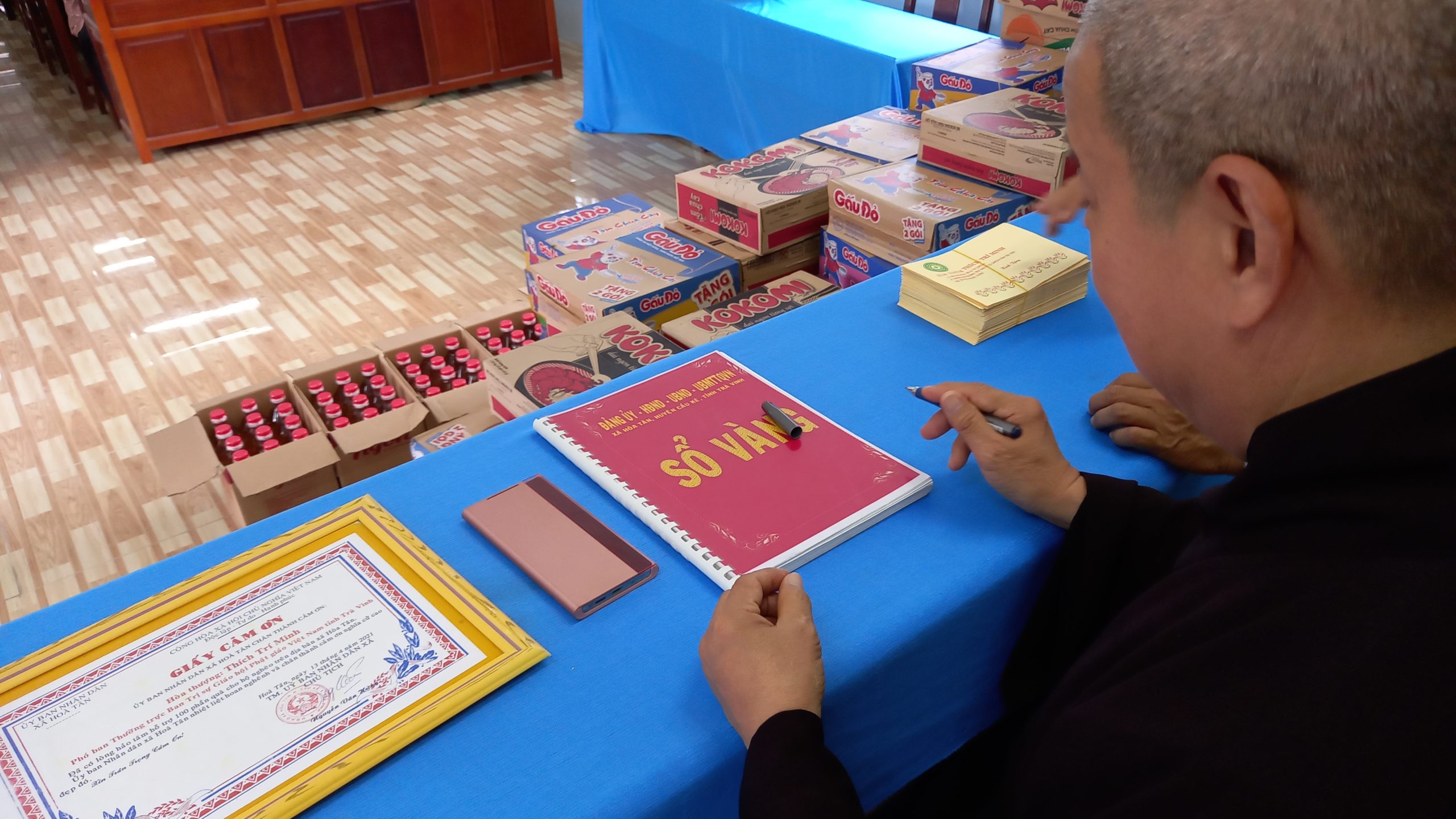 Trước khi kết thúc buổi tặng quà, ông Nguyễn Văn Hai đã gởi lời tri ân đến HT.Thích Trí Minh – Trụ trì chùa Phước Tường (Cầu Kè, Trà Vinh), đã luôn nhiệt huyết với các hoạt động thiện nguyện của xã, huyện và tỉnh nhà. Ông đã mời Hoà thượng ký vào Sổ vàng tri ân của xã như một sự cảm kích trước vị “mạnh thường quân” luôn tiên phong trong mọi công tác.