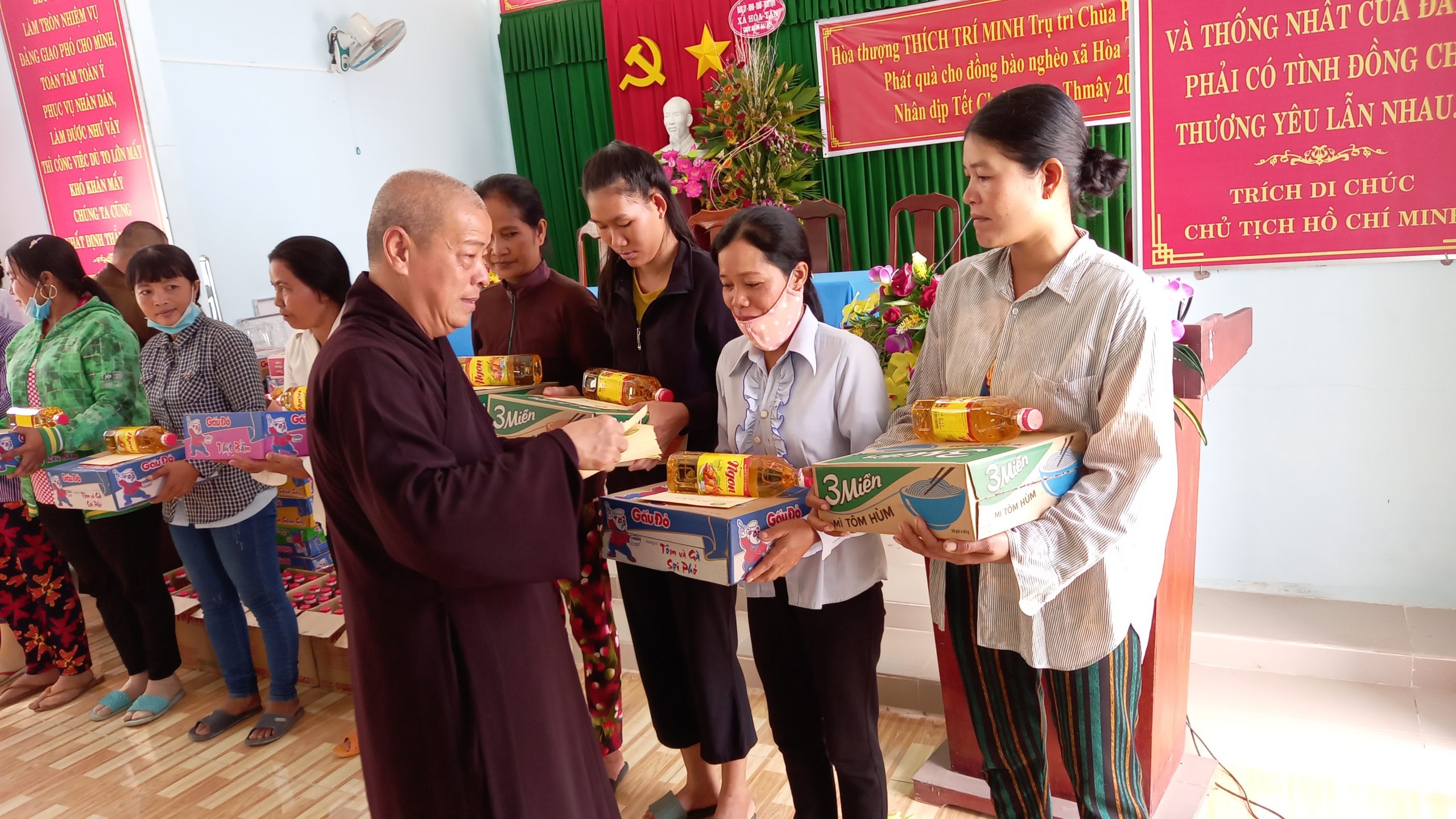 Cùng ngày, HT.Thích Trí Minh đã về với đồng bào nghèo xã Hoà Tân, huyện Cầu Kè, thực hiện buổi phát quà từ thiện cho 100 đồng bào dân tộc Khmer. Được biết, xã Hoà Tân là địa bàn có đông đồng bào Khmer cư ngụ từ xưa.