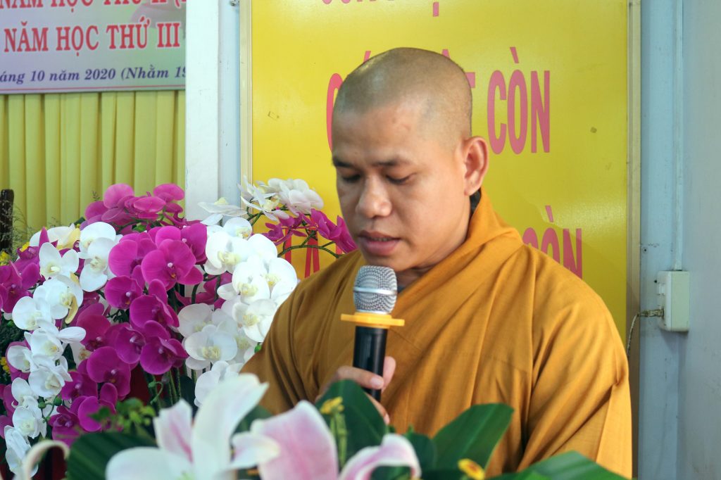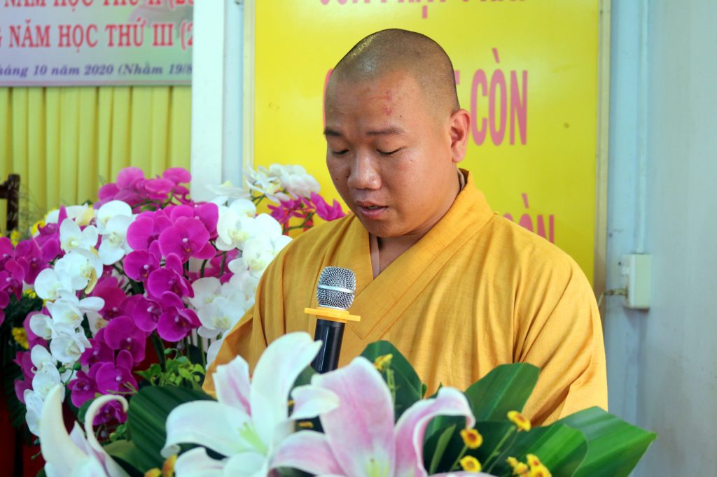 ĐĐ.Thích Thiện Đạo - Phó Thư ký, Chánh Văn phòng Trường TCPH báo cáoTiếp đến, ĐĐ.Thích Thiện Đạo đã thay mặt Ban Thư ký Trường TCPH tỉnh, báo cáo kết quả thực hiện năm học thứ II và kế hoạch đào tạo năm thứ III. Theo báo cáo, các Tăng Ni sinh đã trải qua hai học kì với tổng 32 tuần học gồm 768 tiết học. Do tình hình dịch bệnh nên số tuần học của học kì 2 đã giảm 06 tuần so với cùng kì năm thứ nhất. Điểm nhấn của năm học thứ hai là bên cạnh 9 môn học nội điển thì có 4 môn học ngoại điển gồm có Hán văn, Phật giáo và Văn hóa Việt Nam, Việt văn và Anh văn. Cuối năm học, kết quả các Tăng Ni sinh đạt loại giỏi chiếm 30,3%, loại khá chiếm 63,6% và 6,1% là loại trung bình. Báo cáo cũng nêu rõ tổng thu của năm học thứ II là 298.470.000đ và tổng chi là 281.000.000đ.