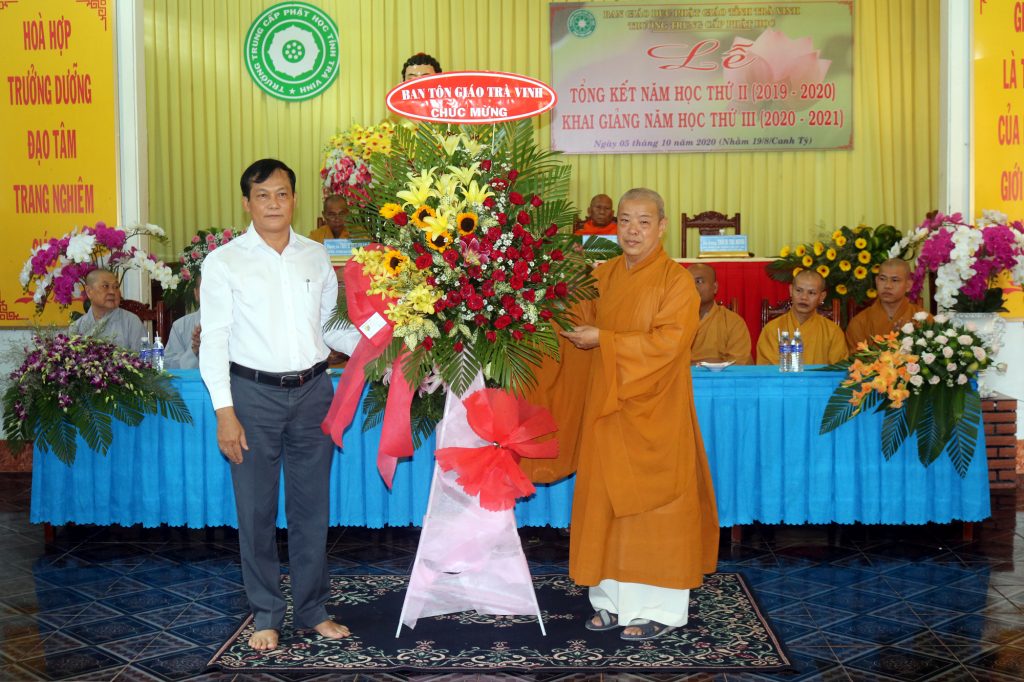 HT.Thạch Sox Xane – Phó Chủ tịch HĐTS, Trưởng BTS GHPGVN tỉnh Trà Vinh ban đạo từTrong lời đạo từ của HT.Thạch Sok Xane tại buổi lễ, Hòa thượng đã tán thán công đức của tất cả chư Tôn đức, đặc biệt là Ban Giám hiệu của trường đã đồng tâm hiệp lực tạo nên sự thành công của năm học. Hòa thượng nhấn mạnh “tre có cong thì phải uốn nắn ngay từ đầu”, sơ tâm tu học phải trui rèn thì “giới, định, tuệ” mới được lập. Việc quy tụ dưới mái trường tu học của các Tăng Ni sinh rất quan trọng đối với sự trường tồn của Giáo hội vì đó là sự giáo dục vun bồi con đường đi đúng để 84.000 pháp môn tu học của đức Phật được xiển dương, phát huy.