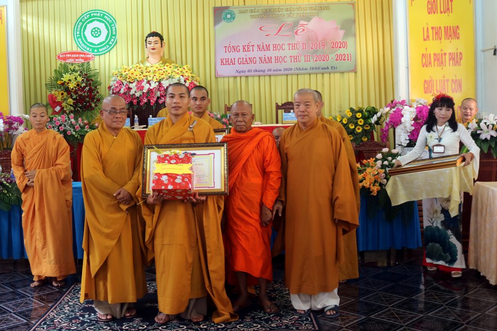ĐĐ.Thích Minh Độ - Phó Hiệu trưởng kiêm Chánh Thư ký Trường TCPH Trà VinhTiếp theo phần báo cáo, ĐĐ.Thích Minh Độ đã công bố Quyết định khen thưởng của Ban Giám hiệu cho các Tăng Ni sinh đã đạt thành tích xuất sắc trong năm học thứ II. Đầu tiên Tăng sinh Thích Lệ Hậu xếp hạng Nhất được khen thưởng với số tiền là 3.000.000 đồng; Tăng sinh Thích Phước Hoàng xếp hạng Nhì được khen thưởng với số tiền là 2.000.000 đồng; đồng hạng Ba là Tăng sinh Thích Tâm Phú và Ni sinh Thích Nữ Liên Đăng được khen thưởng với số tiền là 1.500.000 đồng. ĐĐ.Thích Minh Độ đã cung thỉnh HT.Thạch Sox Xane, TT.Thích Trí Minh, TT.Thích Nguyên Ngọc trao giải thưởng cho các Tăng Ni sinh đạt thành tích vừa nêu trên.