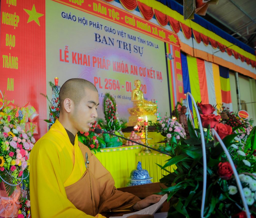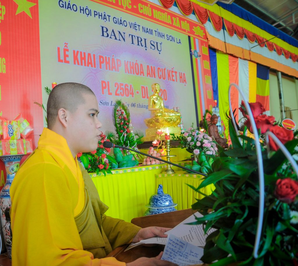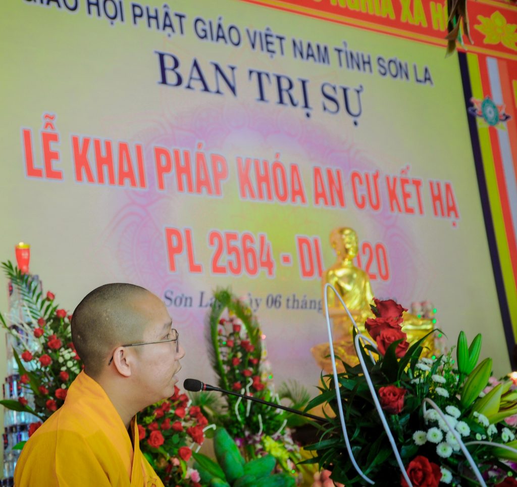 Tại buổi lễ khai pháp, Đại đức Thích Khai Phong – Ủy viên Ban trị sự Phật giáo tỉnh Sơn La đã đọc báo cáo công tác tổ chức khóa an cư kết hạ PL. 2564 – DL. 2020. Theo đó, tỉnh Sơn La hiện có một trường hạ duy nhất, đó là trường hạ Ban Trị sự GHPGVN tỉnh Sơn La, tại chùa Trúc Lâm Hưng Quốc. Khóa an cư kết hạ năm nay, trường hạ có 30 hành giả an cư. Trường hạ đã cung thỉnh Thượng tọa Thích Thanh Quyết – Phó Chủ tịch HĐTS, Trưởng Ban Trị sự GHPGVN tỉnh Sơn La ở ngôi Đường chủ. Nội dung giảng dạy bao gồm cả nội điển và ngoại điển. Trong suốt 3 tháng an cư này, chư hành giả vừa phải đảm bảo việc tu học tinh tiến, trau dồi Giới, Định, Tuệ; vừa phải đảm bảo công tác phòng chống dịch bệnh Covid-19.