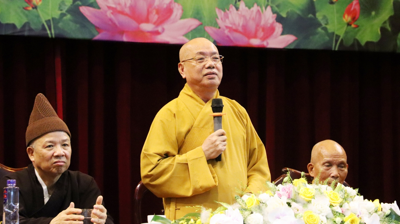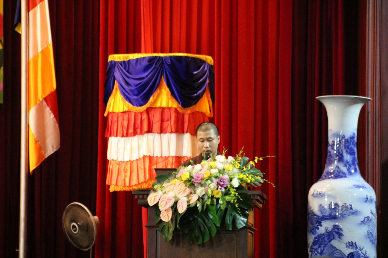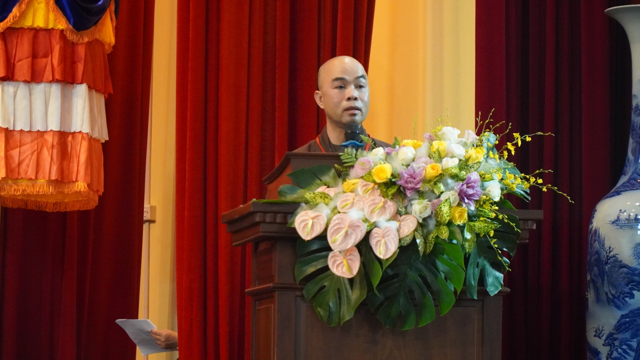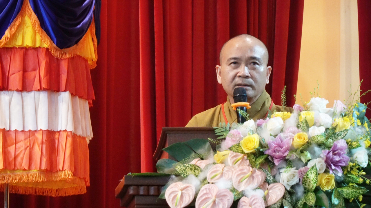 Thượng tọa Thích Thông Đạt báo cáo về công tác giáo dục tại trường Trung cấp Phật học Đà Nẵng