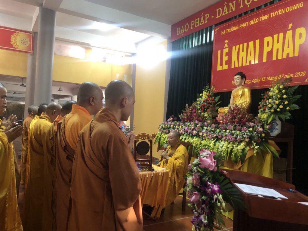Sau lời phát biểu khai mạc, chư Tôn đức Tăng Ni và Phật tử đã thành tâm làm lễ cầu Pháp, Hòa thượng Đường chủ đã từ bi hoan hỷ hứa khả. Sau nghi thức tác lễ cầu pháp và khai kinh, Hòa thượng đã thuyết giảng sơ lược bộ kinh Diệu Pháp Liên Hoa là bộ kinh mà quý Phật tử sẽ được học trong suốt khóa an cư của hạ trường năm nay. Trong đó, bộ Kinh Diệu Pháp Liên Hoa là một bộ kinh lớn trong hệ thống Kinh Tạng Đại Thừa Phật Giáo được các học giả phương Tây xếp vào 1 trong 20 bộ Thánh Điển Phương Đông.