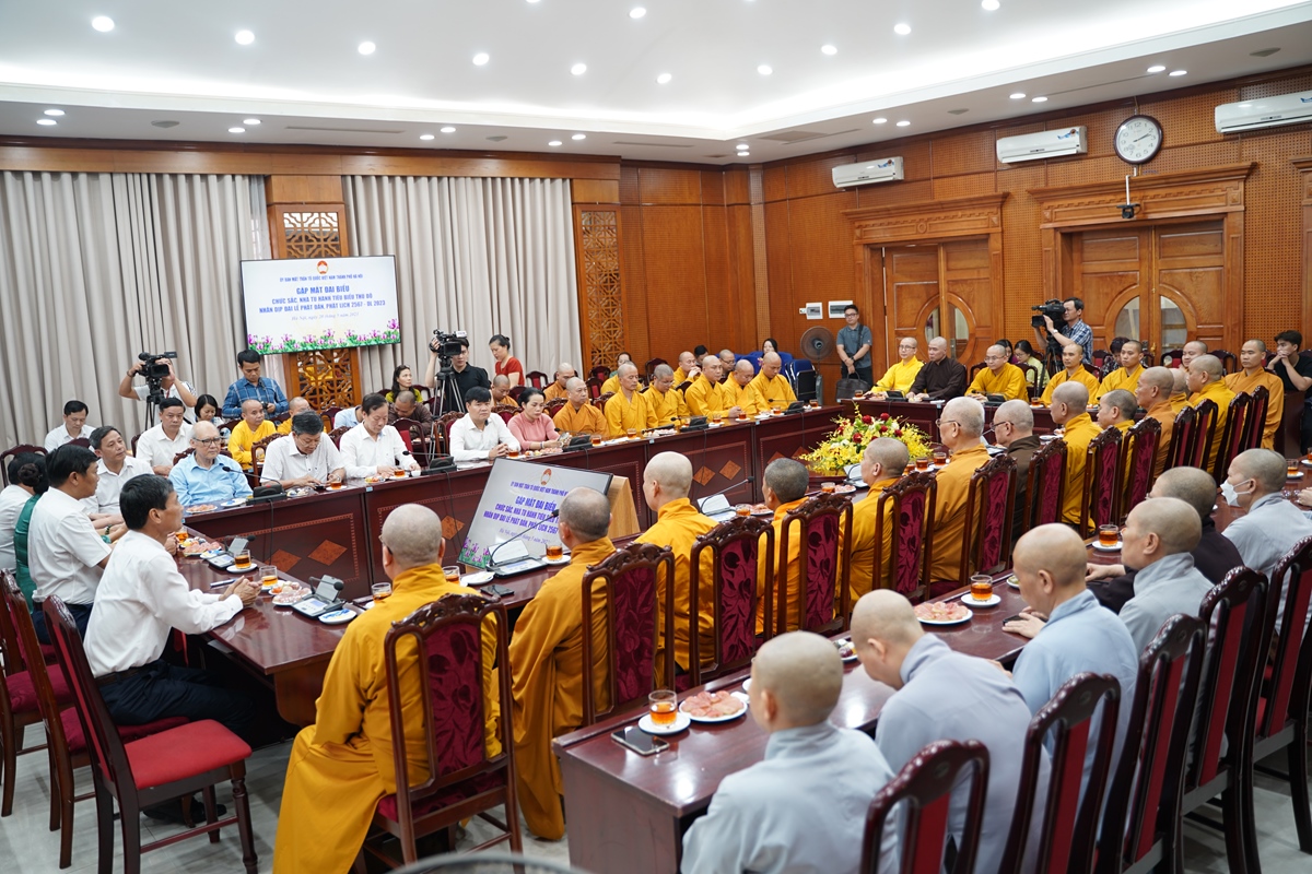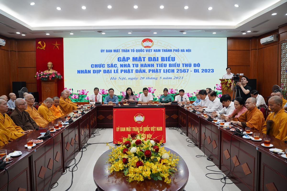 PSO - Chiều ngày 20/5/2023, tại trụ sở Ủy ban Mặt trận Tổ quốc Việt Nam thành phố Hà Nội (số 29 Lý Thường Kiệt, quận Hoàn Kiếm) đã diễn ra buổi gặp mặt giữa quý vị lãnh đạo chính quyền thành phố cùng gần 100 đại biểu chức sắc, nhà tu hành Phật giáo tiêu biểu của Thủ đô nhân Đại lễ Phật đản PL.2567 - DL.2023.