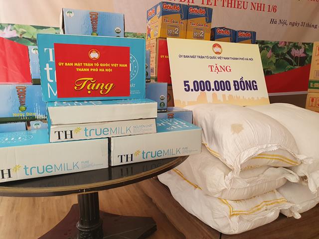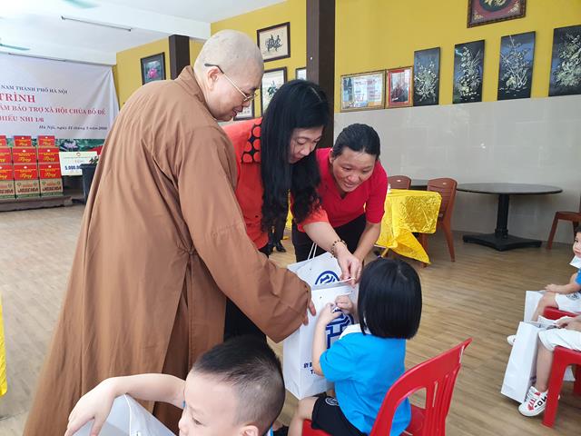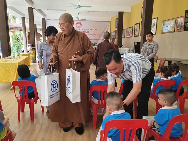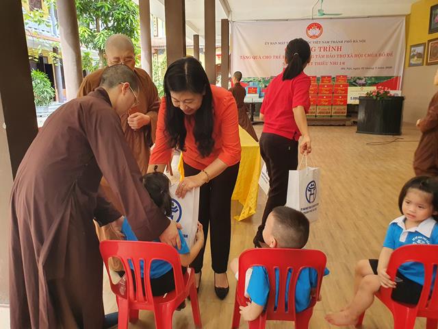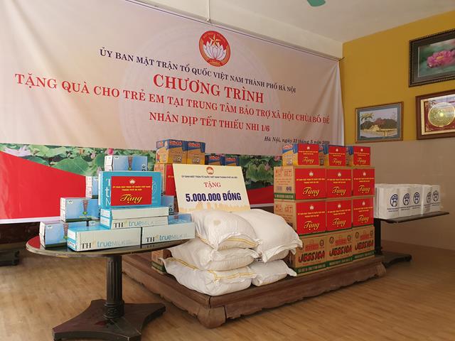 Nhân dịp này, đại diện của UBMTTQVN thành phố Hà Nội đã trao tặng 5.000.000 đồng cùng 300 cân gạo, 20 thùng mỳ, sữa và bánh kẹo đến cơ sở bảo trợ xã hội chùa Bồ Đề.