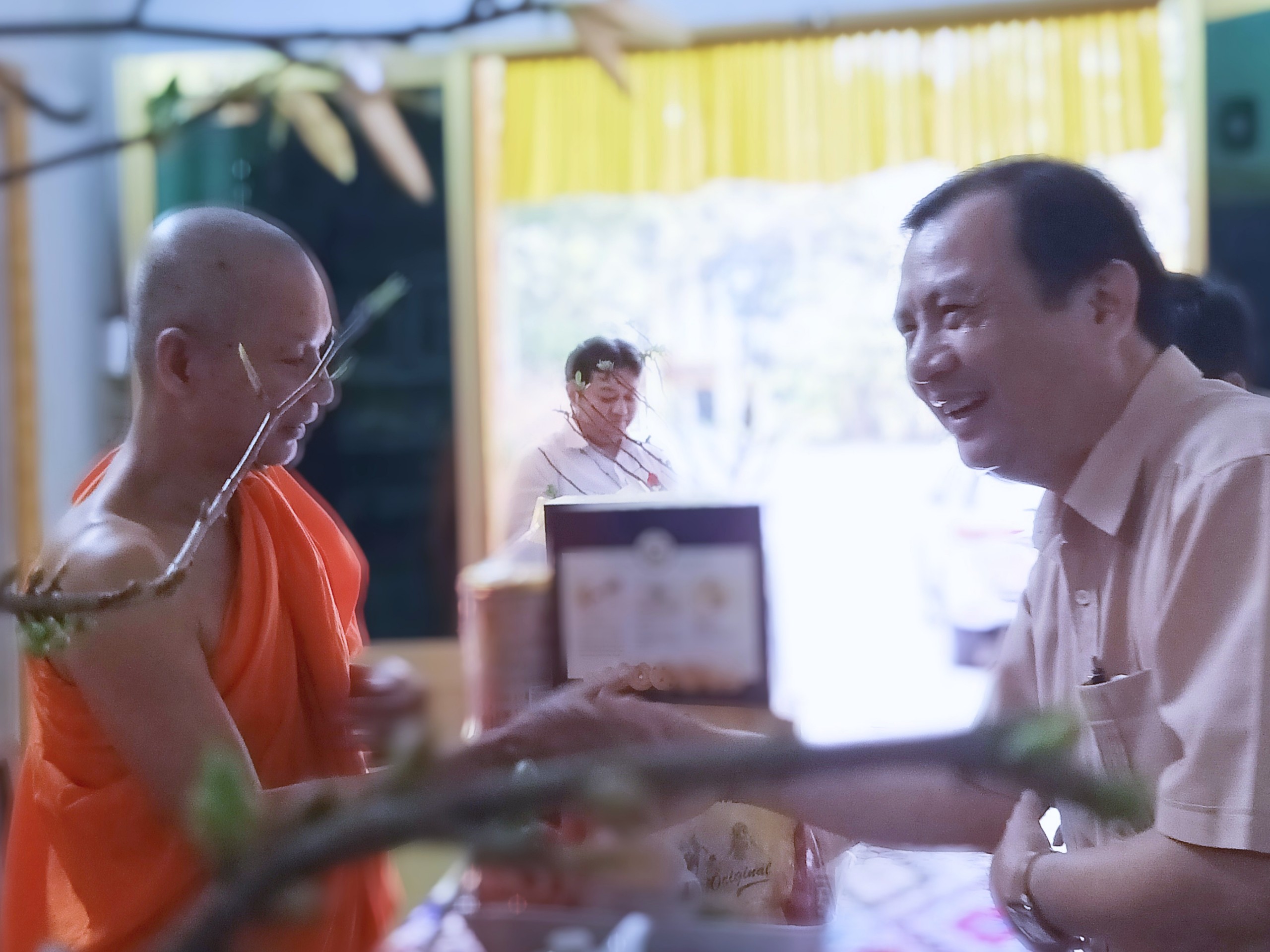 TT.Sơn Ngọc Huynh – Ủy viên HĐTS GHPGVN, Phó trưởng BTS Phật giáo tỉnh Vĩnh Long, Chủ tịch Hội ĐKSSYN tỉnh và ĐĐ.Thạch Xa Rốt – Phó chánh Thư ký Hội ĐKSSYN tỉnh Vĩnh Long tiếp đón đoàn trong tình đạo vị.