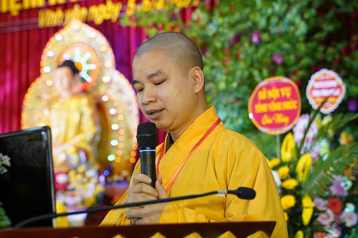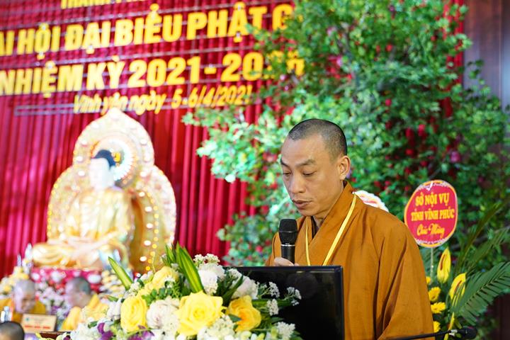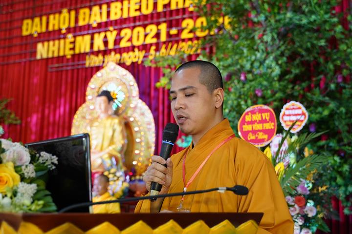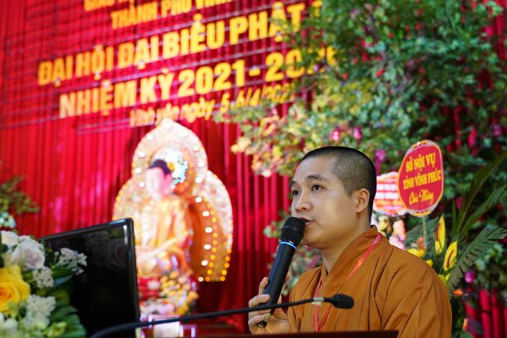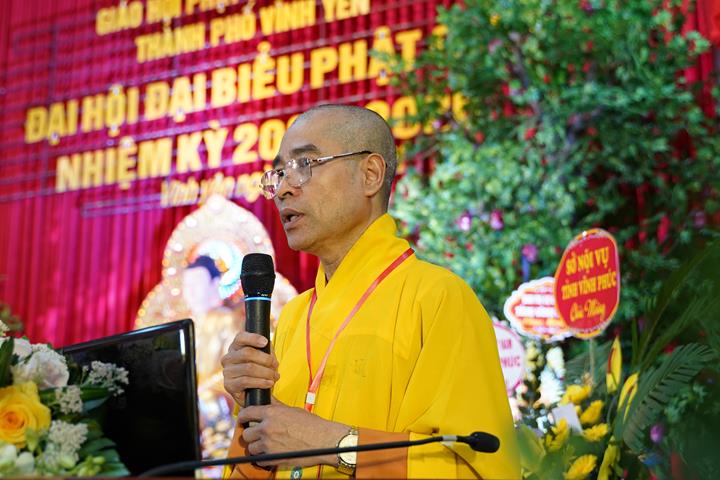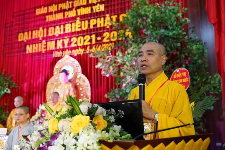 Với khẩu hiệu của Đại hội là "Kỷ cương, trách nhiệm, đoàn kết, phát triển", Thượng tọa mong rằng mỗi Tăng Ni hãy gương mẫu nghiêm chỉnh giữ gìn luật Phật chế, trang nghiêm tự thân và giữ gìn đạo hạnh để thực hiện tốt những Hiến chương của Giáo hội, nội quy của các Ban viện Trung ương, pháp luật của nhà nước, đem hết sức mình phụng sự Đạo pháp, phụng sự dân tộc. Thượng tọa nhấn mạnh "Là một thành viên của Giáo hội, chúng ta phải có trách nhiệm làm việc gì, làm Phật sự nào cũng phải đặt lợi ích của Đạo pháp, chính pháp, sự trong sáng của Đạo Phật và hình ảnh của GHPGVN lên trên hết. Chúng ta phải phụng sự và hướng dẫn đồng bào Phật tử tu tập theo chính pháp. Đấy là trách nhiệm của một sứ giả Như Lai". Đặc biệt, Tăng Ni và Phật tử phải có sự đoàn kết. Đoàn kết là điều kiện tiên quyết, là sức mạnh quyết định sự thành công trong công tác Phật sự. Đây cũng chính là điều Giáo hội mong muốn gửi tới mỗi Tăng Ni và Phật tử trong tất cả các kỳ Đại hội. Thượng tọa tin tưởng với sự quan tâm, chỉ đạo trực tiếp của BTS GHPGVN tỉnh Vĩnh Phúc, sự giúp đỡ tận tình của chính quyền các cấp, sự đồng lòng của nhân dân Phật tử, tân BTS GHPGVN thành phố Vĩnh Yên bằng sự tâm huyết nhiệt tình sẽ thực hiện thành công nghị quyết và phương hướng mà Đại hội đã đề ra.