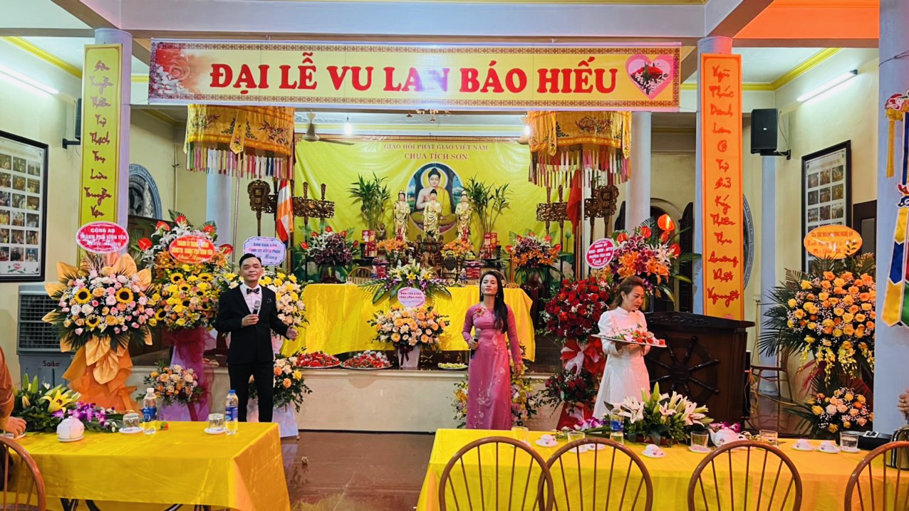 Cuối buổi lễ, chư Tôn đức cùng toàn thể đạo tràng đã tụng kinh Vu lan Báo hiếu. Tiếp đó, toàn thể Đại chúng nhất tâm thành thực hiện nghi thức lễ bông hồng cài áo bày tỏ lòng kính quý đối với các đấng thiêng liêng thoát tục. Đại biểu, nhân dân Phật tử về tham dự đã được cài lên mình những bông hồng màu đỏ thắm, màu của sự thương yêu, màu của bao vất vả, gian lao mà hai đấng sinh thành đã chắt chiu cho ta trưởng thành qua bao năm tháng. Còn những người mất mẹ mất cha, đã lặng lẽ cài lên ngực áo của mình đóa hoa buồn trinh trắng.